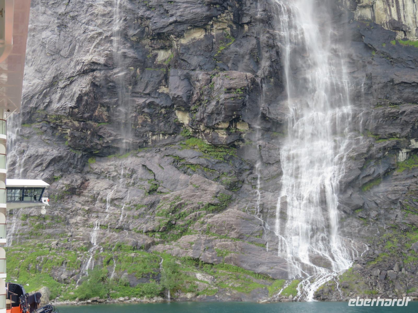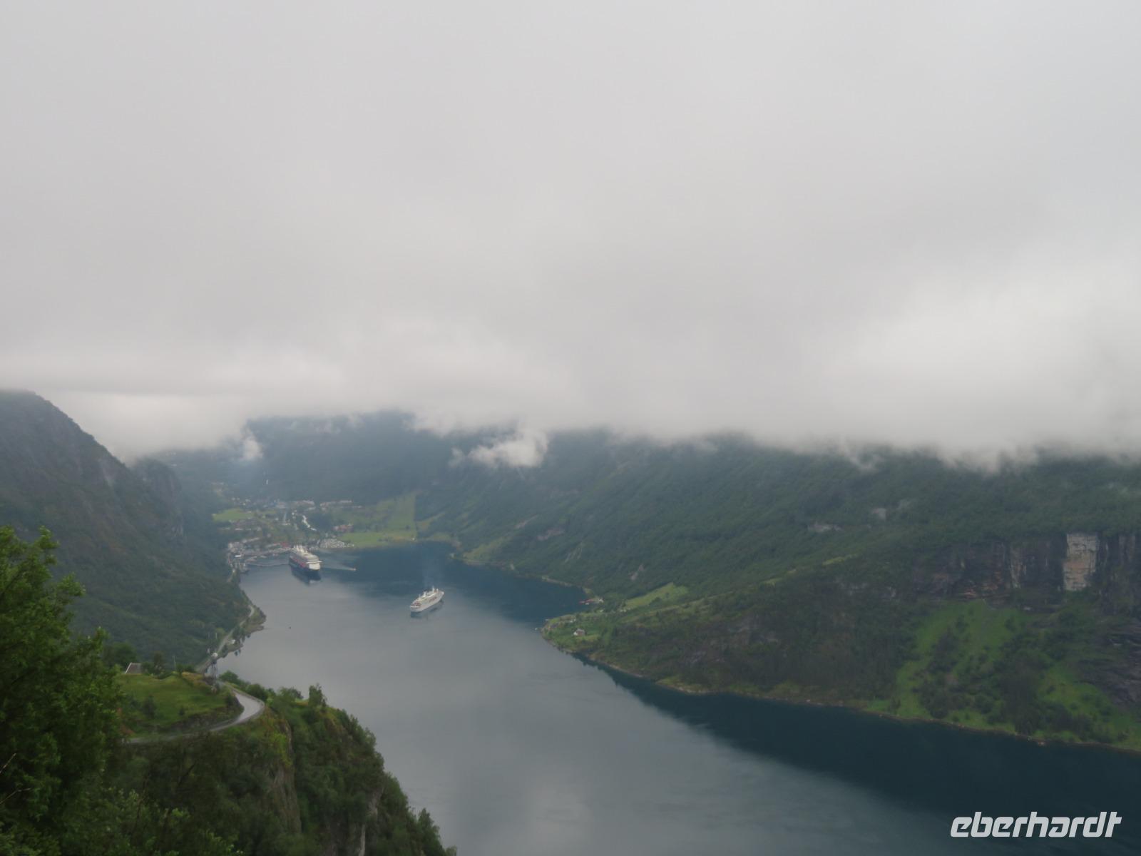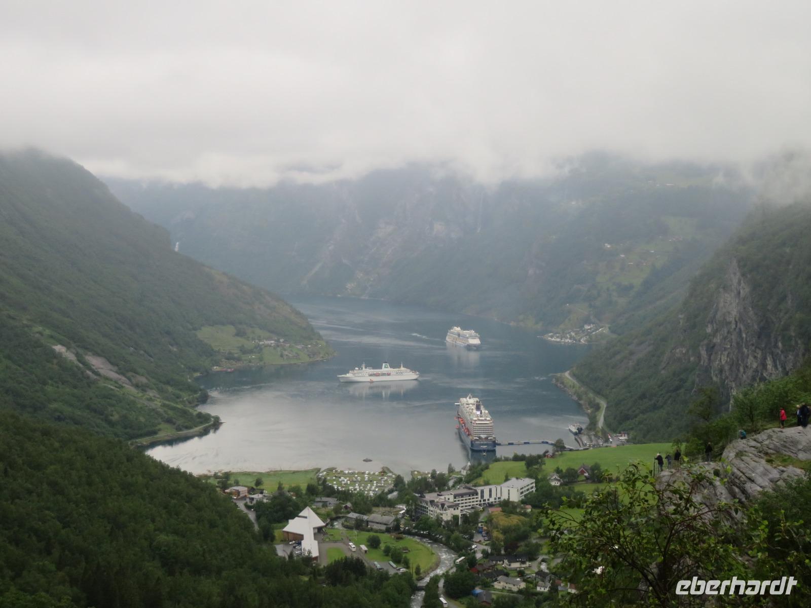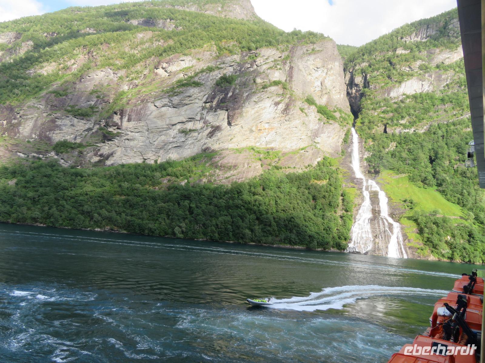 zum Weltnaturerbe zählende Fjord ist ca. 16 km lang an dessen Ende sich das 300 Einwohner zählende Dörfchen Geiranger befindet. Da er weit im Landesinneren liegt, ragen aber hier die Felswände besonders hoch und steil auf, die Wasserfälle sind besonders schön und der Blick auf die schneebedeckten Berge besonders eindrucksvoll.