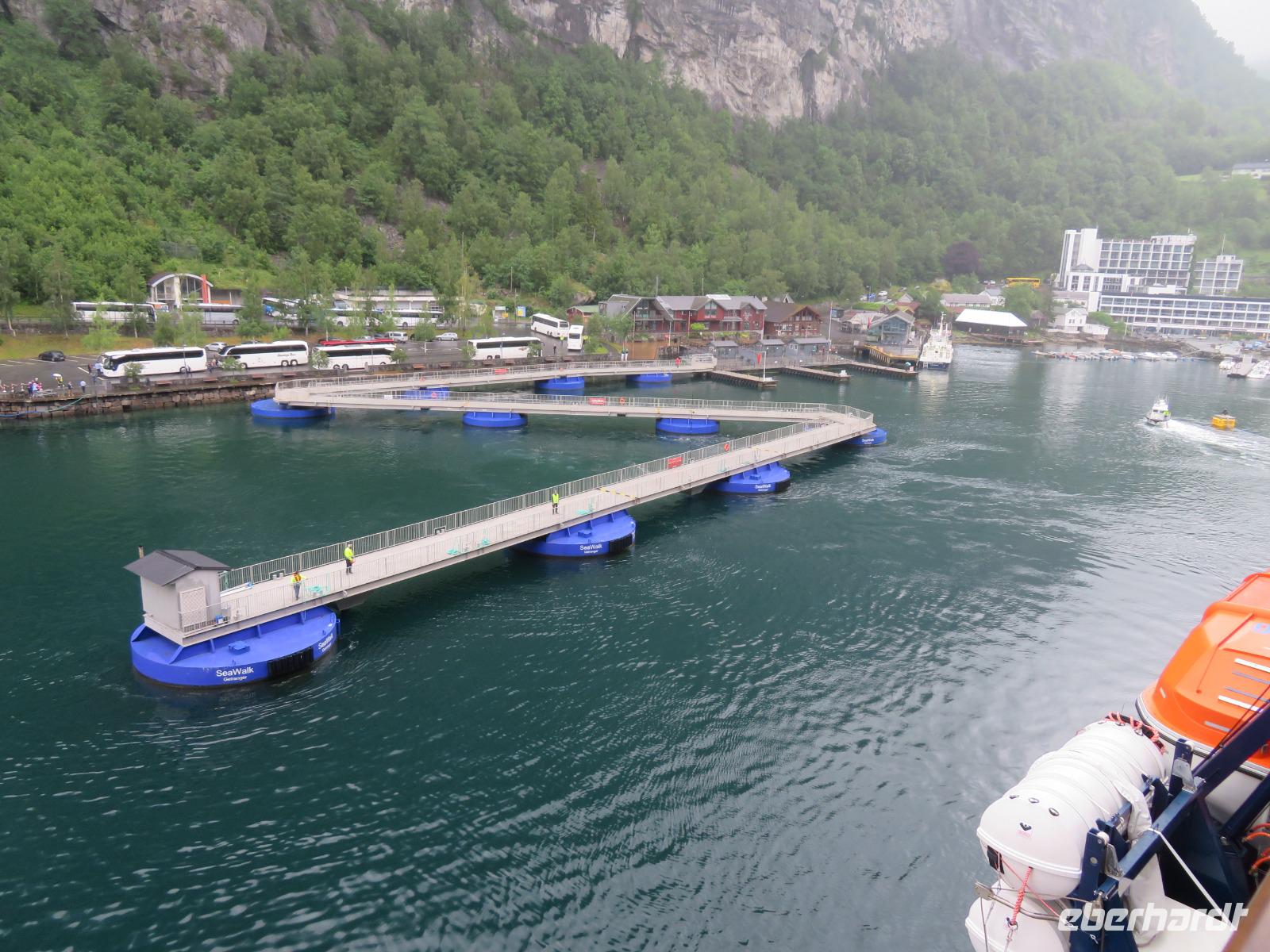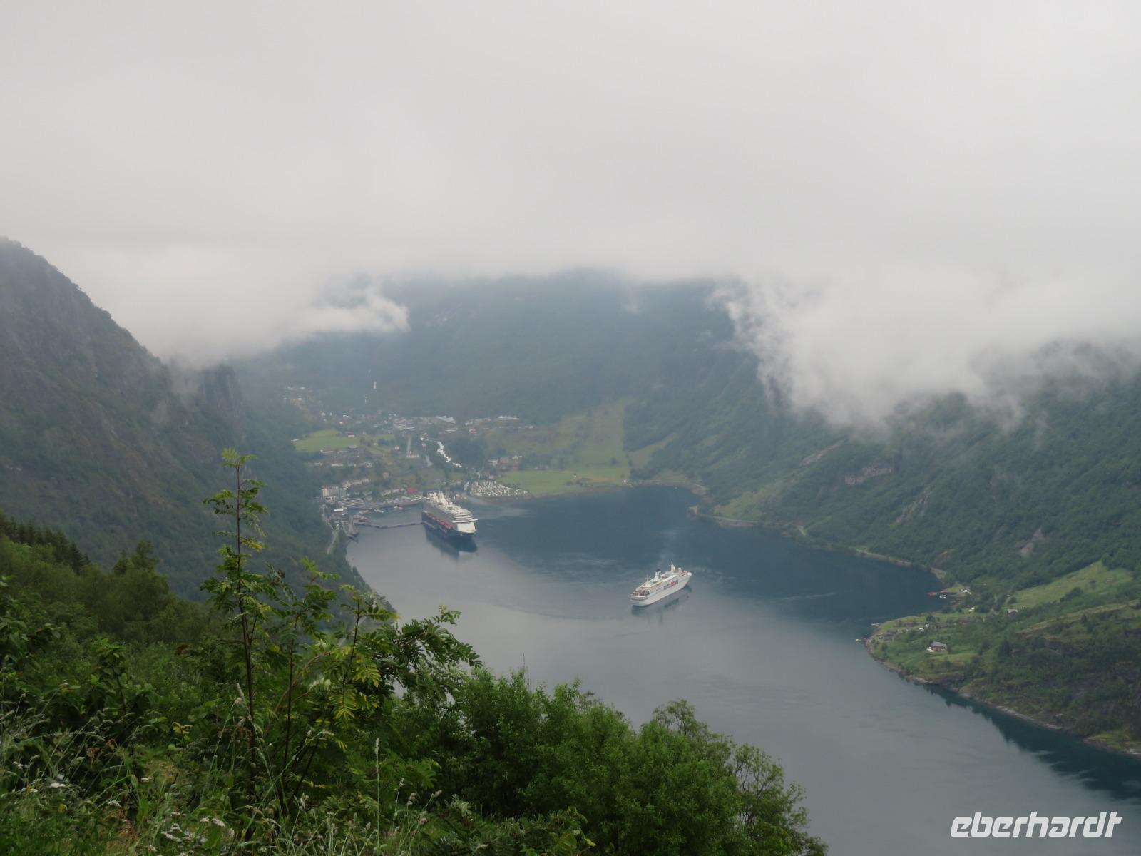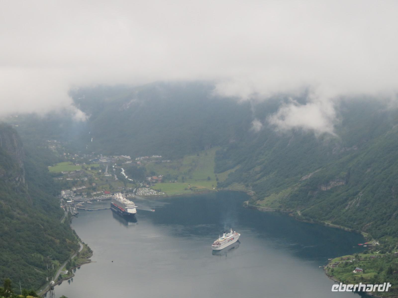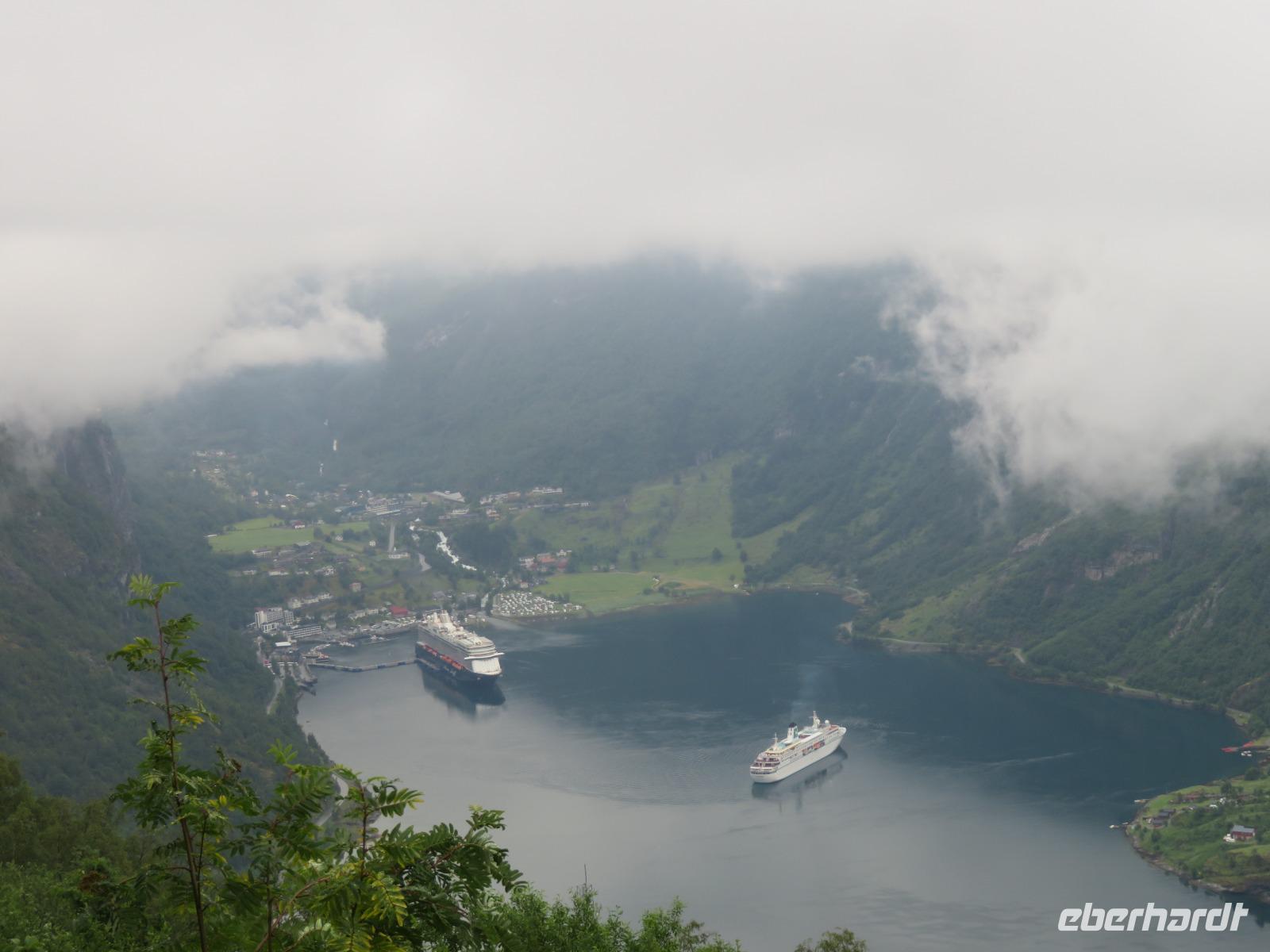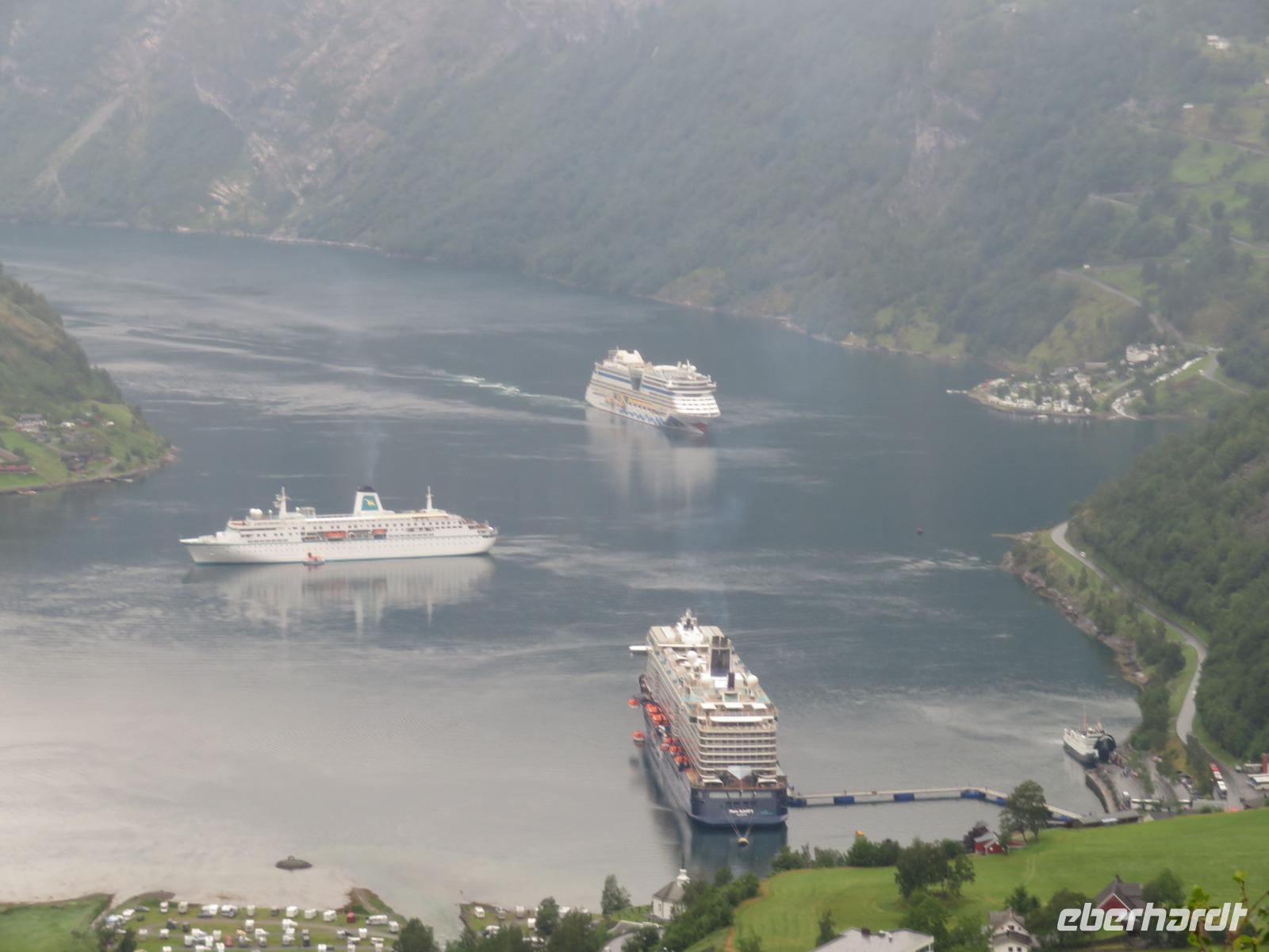 zum Weltnaturerbe zählende Fjord ist ca. 16 km lang an dessen Ende sich das 300 Einwohner zählende Dörfchen Geiranger befindet. Da er weit im Landesinneren liegt, ragen aber hier die Felswände besonders hoch und steil auf, die Wasserfälle sind besonders schön und der Blick auf die schneebedeckten Berge besonders eindrucksvoll.