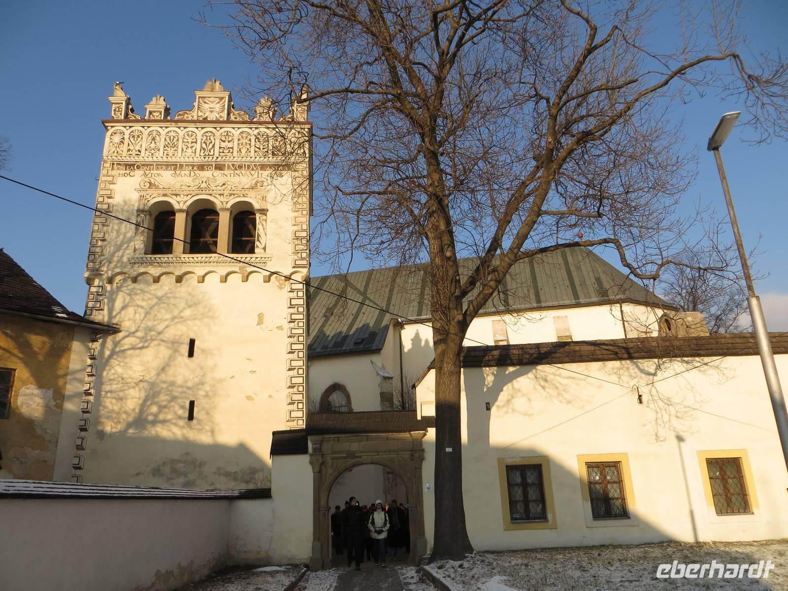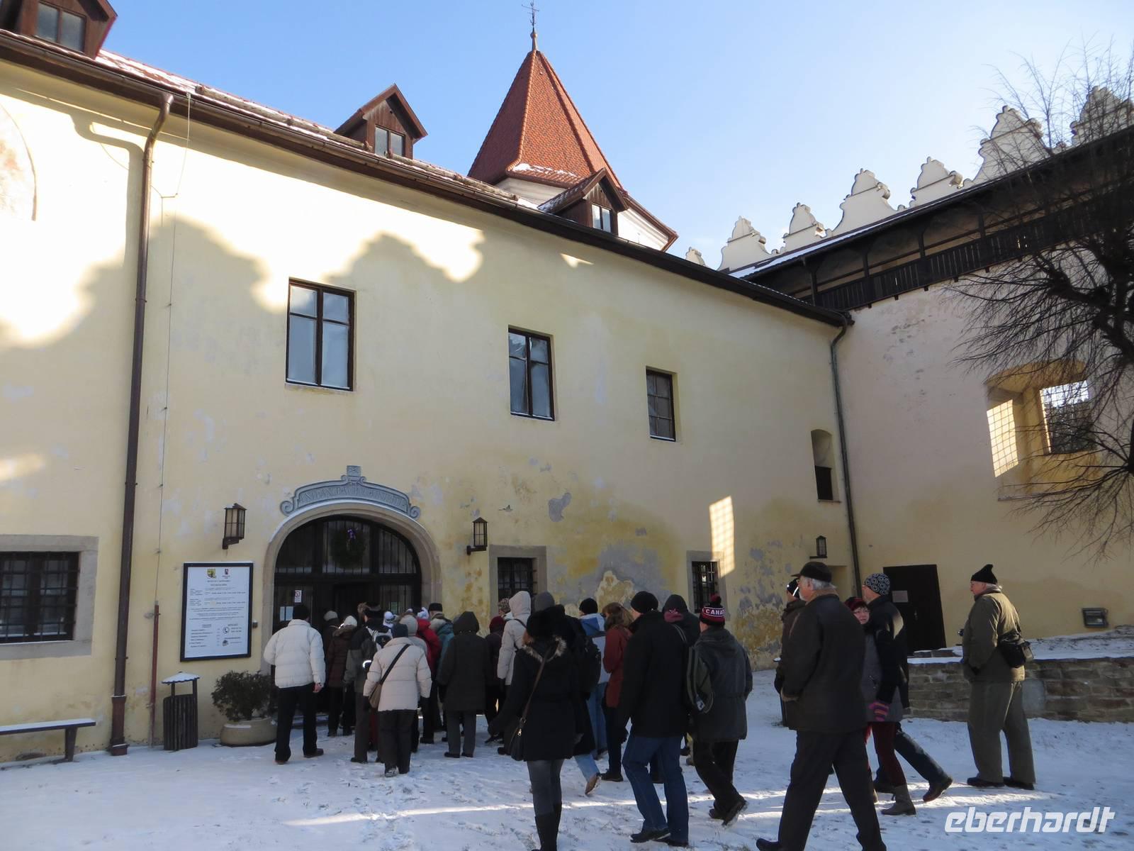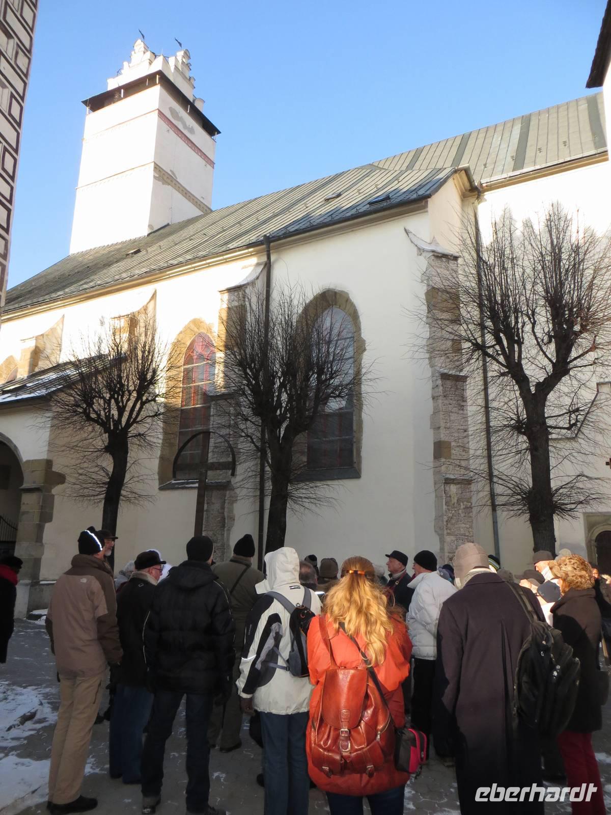 In prächtiger Sonne glitzerten die leicht beschneiten Gipfel der Hohen Tatra gleich hinter dem Hotel Bellevue. Unser erstes Ziel war die gut erhaltene Burganlage der alten Zipser Handelsstadt Kezmarok, wo einst ein Käsemarkt abgehalten wurde, der für die Stadt namensgebend wurde. Mit viel Interesse durchquerten wir die Räume mit Zeitzeugen der Geschichte, die auch durch Schwaben und Sachsen geprägt wurde. Die Burgapotheke gehört sicher zu den markantestes Ausstellungsstücken einer Sammlung, die museumsmethodisch den Charme der 70er Jahre des vorigen Jahrhunderts hat. Fasziniert waren wir auch von einem hundert Jahre alten Röntgenapparat und origanlen Röntgenfotos jener Zeit. Nach den kulturhistorischen Eindrücken über die Region Zips genossen wir die, insbesondere unter Verwendung von Schafskäse und Mehl entstehenden, kulinarischen Qualitäten des Landstriches. Nach dem Essen bummelten wir durch Gassen von Keszmarok zunächst zur katholischen Kirche mit prächtigem Renaissanceturm. Wie kommen aber protestantische Kirchen in die katholische Slowakei? Diese Frage beantworteten wir beim Besuch der Artikularkirche, die aus dem späten 17. Jahrhundert stammt. Es schließt sich ein großer Geschichtsbogen von Reformation und Gegenreformation im Gesamtkulturraum von Deutschen, Polen, Slowaken, Tschechen, Ungarn; ja auch von protestantischen Dänen und Schweden. Nicht umsonst gehört diese Kirche zum Unesco-Welterbe. Interessant aber auch der Besuch in der benachbarten „neuen" protestantischen Kirche, einem Bau aus der Zeit des Historismus, mit baulichen Anleihen in der Romanik, Gotik, Renaissance und im Orient und geschichtlichen Bezügen zu den ungarischen Kuruzzen.