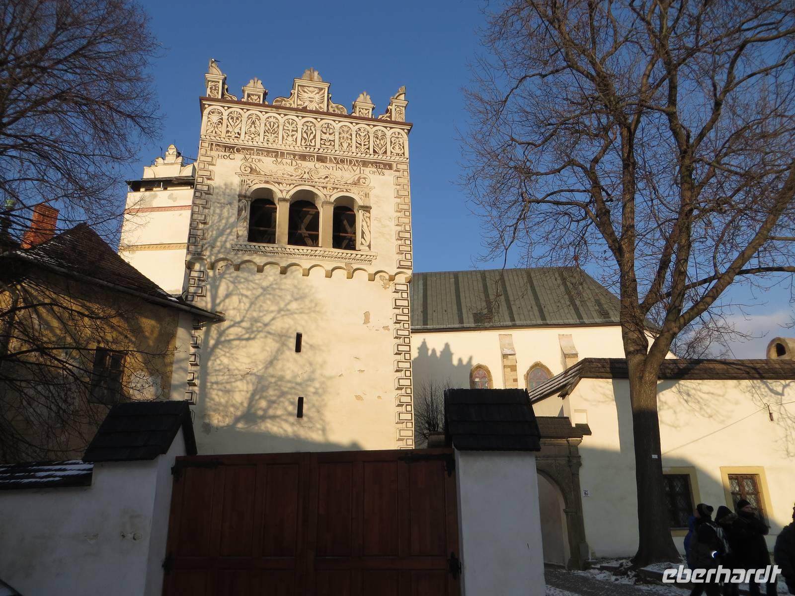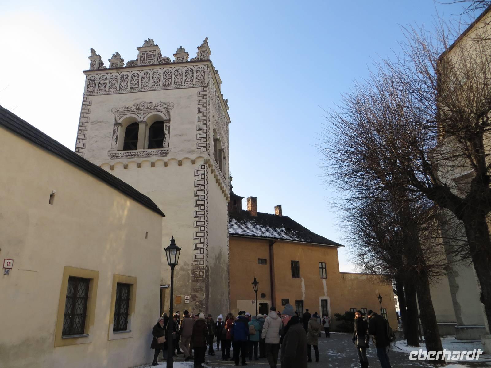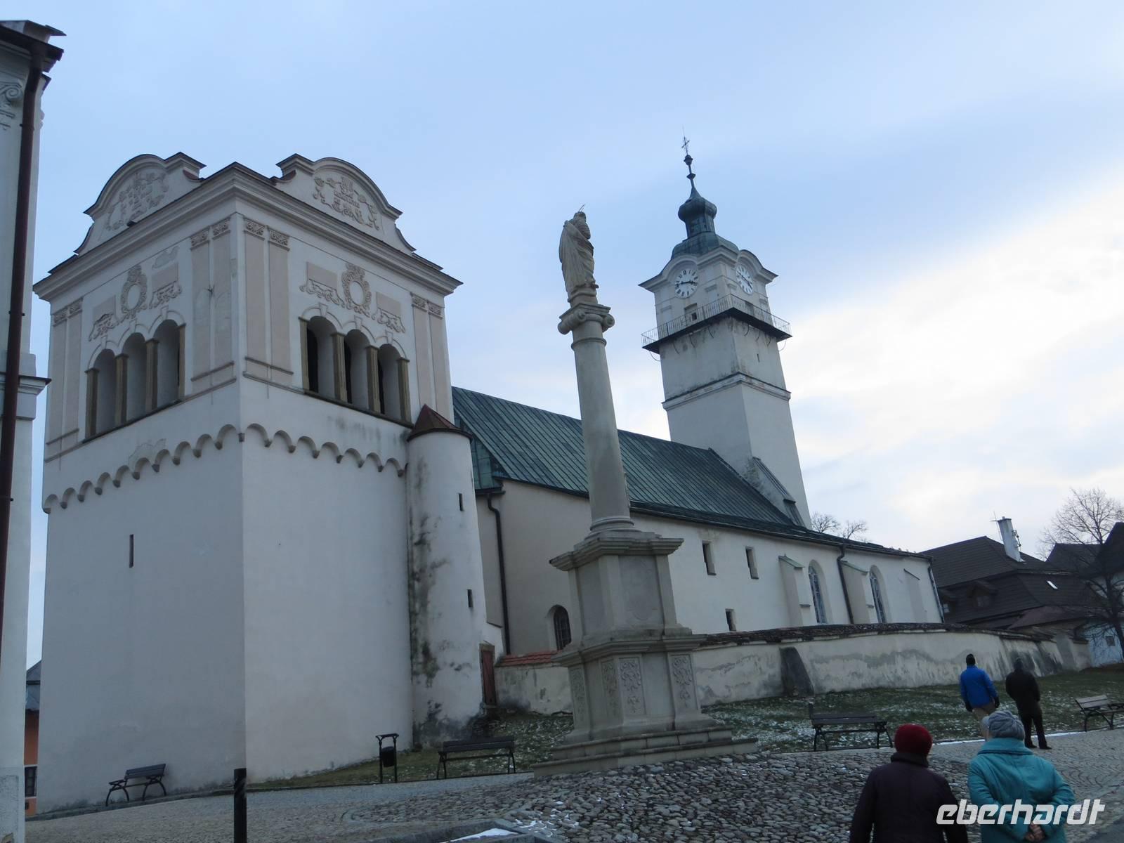 Nach einem erforderlichen Apothekenstopp in Tatranska Lomnica ging Richtung Zipser Land, zunächst durch Levoca weiter Richtung Osten. Nach reichlich einer Fahrstunde sahen wir vor uns aufstrebend die Zipser Burg. Die Fahrstraße an der Ostseite bis hinauf zur Burg war trocken und eisfrei, so dass wir es wagten. Vom Parkplatz suchten wir uns die besten Fotomotive auf die Anlage der Zipser Burg. Dann ging es nach Zehra zur romanisch geprägten Dorfkirche mit jahrhundertealten Fresken - seit 1993 UNESCO Weltkulturerbe gemeinsam mit der Burg und dem Kapitel Durch Zigeunerdörfer - sorry Sinti und Roma - und durch Spisske Podhradie (übersetzbar als „unter der Zipser Burg"). Gegenüber der Zipser Burg befindet sich das Zipser Kapitel, Bischofssitz des Oberhaupts der Zipser Katholiken. DIE Kirche St. Martin mit romanischen Elementen am Westeingang und an den Turmfenstern fand ebenso unsere Beachtung wie die wehrhafte Umfriedung des Kirchendorfes und die barocken Bauten, in denen einst die Pröbste wohnten. Gegen Mittag in Levoca angekommen hatten wir zeitnah die Schlüsselgewalt für eine Besichtigung von St. Jacob. Der bekannte spätgotische Hochaltar war rekonstruiert, mancher der weiteren Altare bedurfte sicher zumindest einer Entstaubung - hervorragende Weltkunst des Meisters Paul von Leutschau.