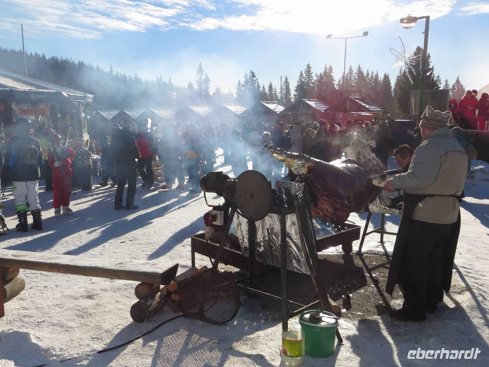 Nach dem individuellen Bummel dann noch ein Stopp an den Sprungschanzen am Krokiew, wo einst Recknagel, Aschenbach , Weißflog und Co. sprangen. Nach dem kurzen Stopp gab es im Bus eine kleine „heiße Überraschung" mit slowakischem Rum. „Fast an der Baumgrenze" überquerten wir dann die Tatrakämme auf verschneiter aber gut befahrbarer Straße mit unserem Fahrer Frank Glöß sehr sicher und zügig. So bleib uns Zeit zum Ausruhren bevor es zum Abendessen im Hotelrestaurant ging.