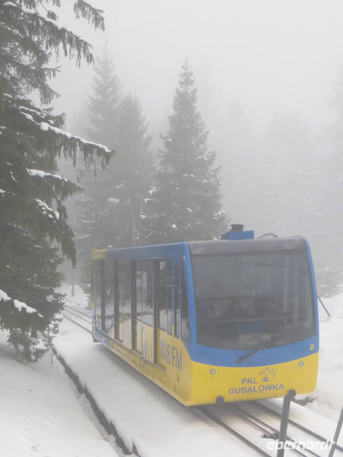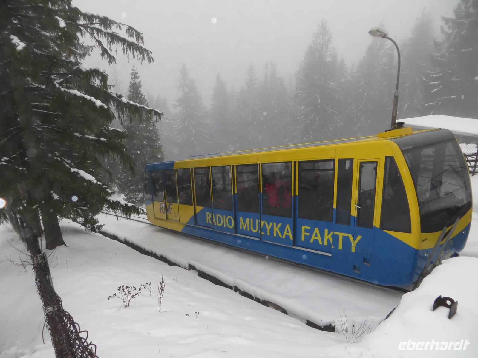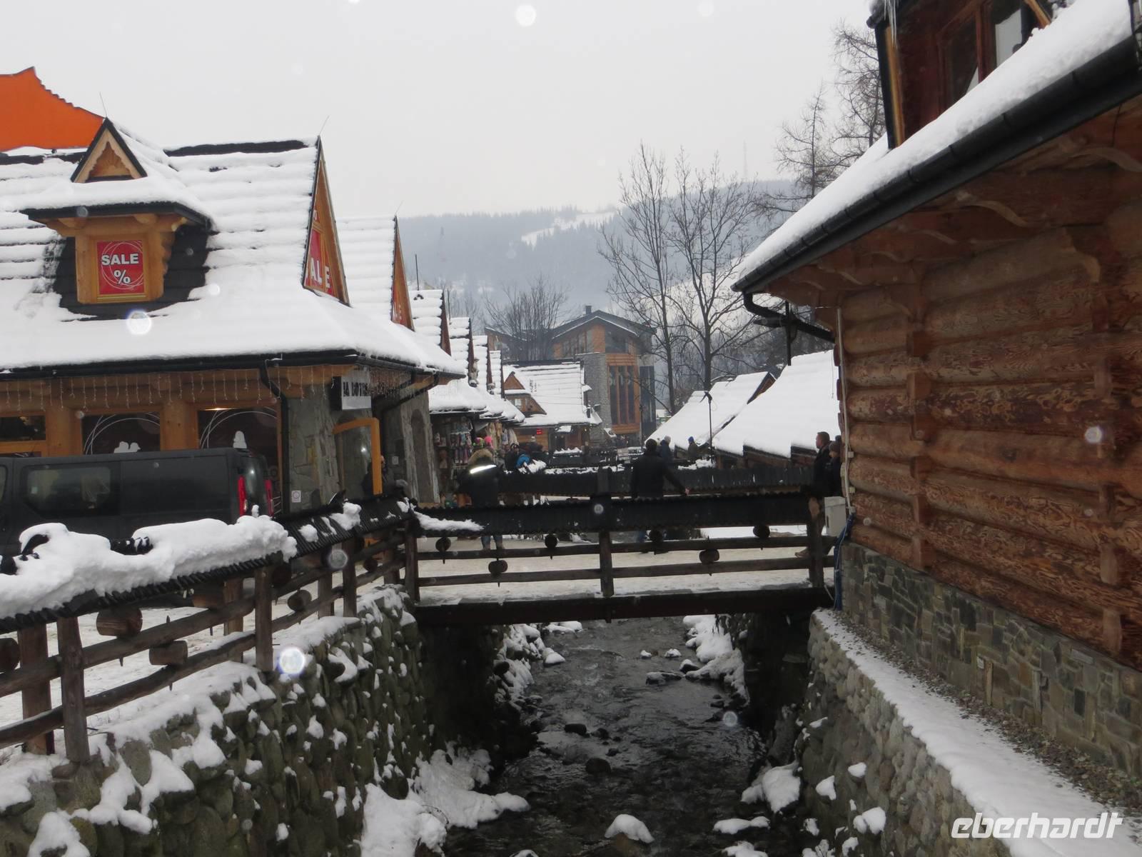 Wer zu sonst üblicher Zeit bereits wach war, konnte im morgendlichen Sonnenschein die Tatragipfel vor blauem Himmel erkennen. Als wir mit dem Bud zum fakultativen Ausflug nach Zakopane starteten, hatte es sich wieder eingetrübt und fing auf kalten Bodxen an ein wenig zu regnen. Dennoch starteten wir und hatten Glück; die Straßen vereisten nicht, es wurde eher wärmer und taute. Wir fuhren auf nunmehr altbekannter Strecke nach Zdiar, dann aber über den kleinen ehemaligen Grenzübergang Lysa Polana. Alle Gipfel der Hohen Tatra in tiefliegenden Wolken. Ab Mittag bummelten wir dann durch das recht städtische Zakopane, Polens höchstgelegene Stadt. Über uns die Gipfel von Kasprowy Wierch und Giewont- aber leider nicht zu sehen. Mancher fand ein Souvenir und einige kosteten den typischen polnischen Tatra-Rauchkäse, der mit ornamentalem Mustern aus den Holzformen der Herstellung angeboten wird. Zu üppigem Essen war den meisten nach dem opulenten Abend wohl doch noch nicht, auch wenn in Zakopane eine Vielzahl von Karczmas zu deftigem Essen einladen. Zakopane am Neujahrstag: da treffen sich Einheimische, Wintersportler, Ausflügler aus Krakau und Busladungen von Ukrainern, Litauern und Deutsche Silvesterurlauber - so sind auch die zahlreichen Lokale recht gefüllt.