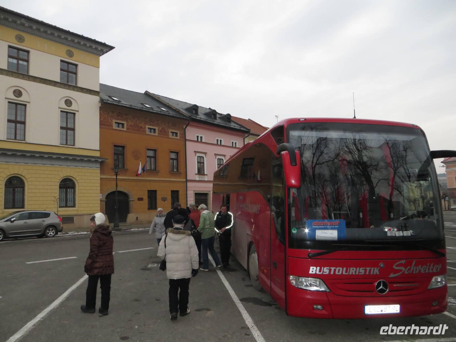 Heftiger Schneefall begrüßte wohl alle Gäste in den Morgenstunden als sie ihr Haus verließen oder sich auf dem Transfer zum Bus befanden. Auf manchen Autobahnabschnitten lief kaum noch etwas, so dass wir eine Stunde später als geplant starteten. Bei tiefen Wolken aber nun ohne Schneefall fuhren wir nördlich des Riesengebirges, später an Breslau, Oppeln und Gleiwitz vorbei; durchfuhren Kattowitz und waren am Nachmittag in Krakau. Nach fast acht Stunden Busfahrt ab Dresden mit einigen gedanklichen Ausflügen in die Geschichte des osteuropäischen Nachbarn und ihrer großen Königshäuser der Piasten und Jagiellonen anlangten, erreichten wir passend die alte polnische Hauptstadt Krakau. Bei zunehmender Kälte konnten wir neben der Weichsel unterhalb des Wawel, dem Krakauer Königsschloss, parken. Ein kleiner Spaziergang führte uns zum großen, ursprünglich im Mittelalter entstandenen Marktplatz, dem Rynek mit Bürgerhäusern, den Tuchhallen und der Marienkirche. Nach etwas Bummelfreizeit auf dem Rynek besuchten wir die Marienkathedrale mit ihrem von Veit Stoss geschnitzten Hochaltar. Pünktlich zum Trompetensignal des „Hejnal" standen wir unterhalb der Türme und konnten bei der einbrechenden Dunkelheit kaum den Tropeter sehen. Ein kleiner Bummel führte uns danach an der Franziskanerkirche und am Bischofspalast vorbei zurück zum Bus.