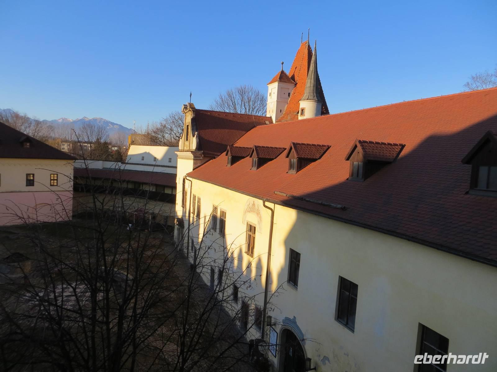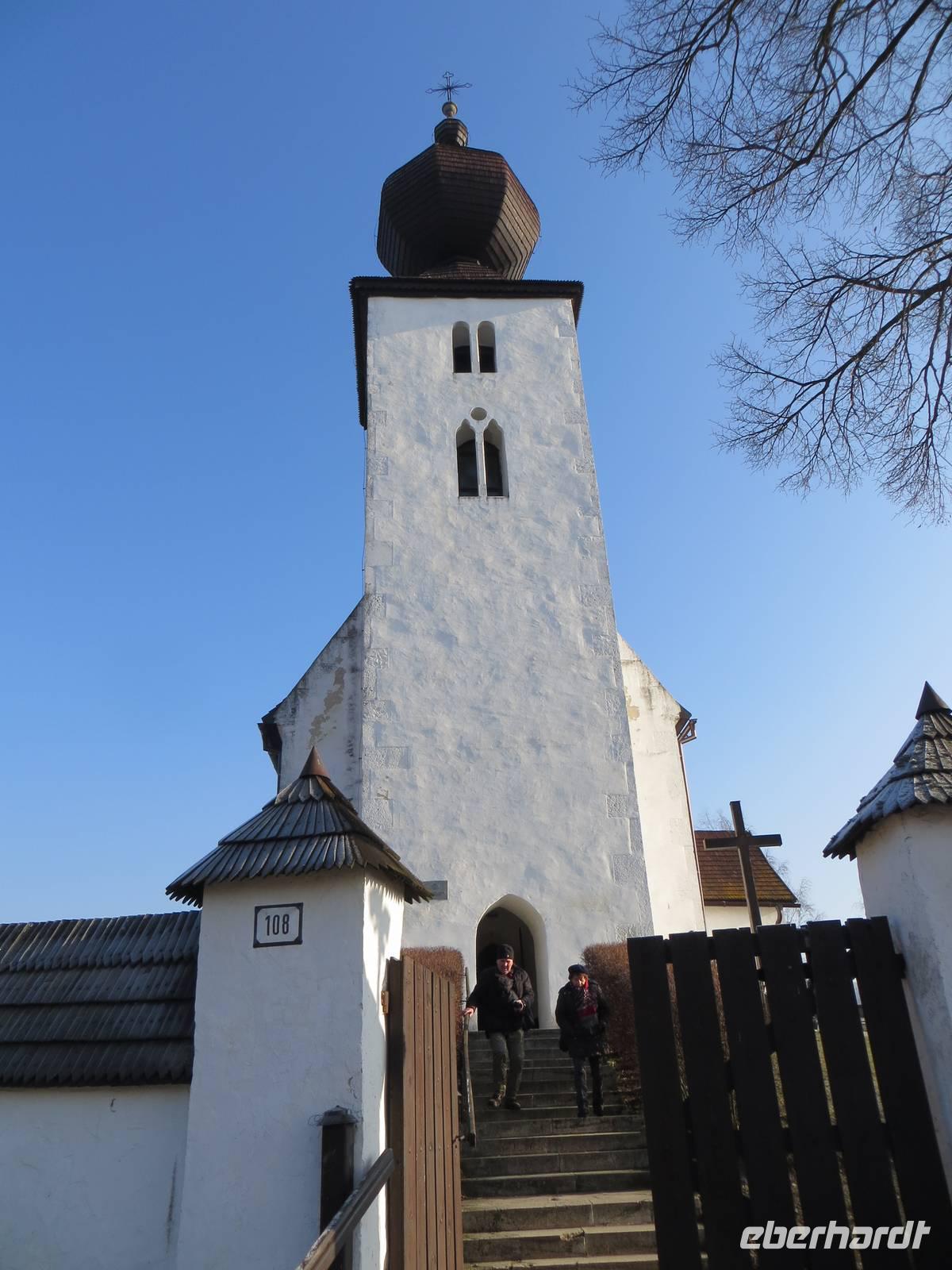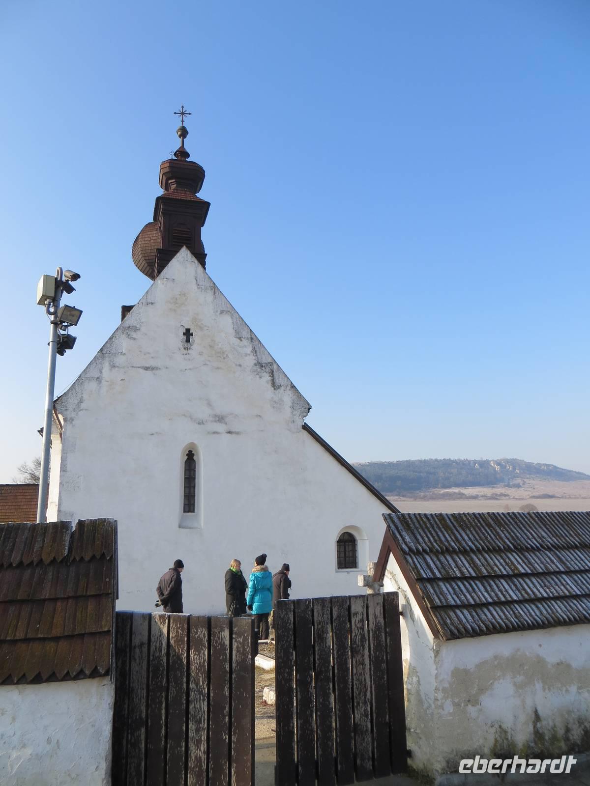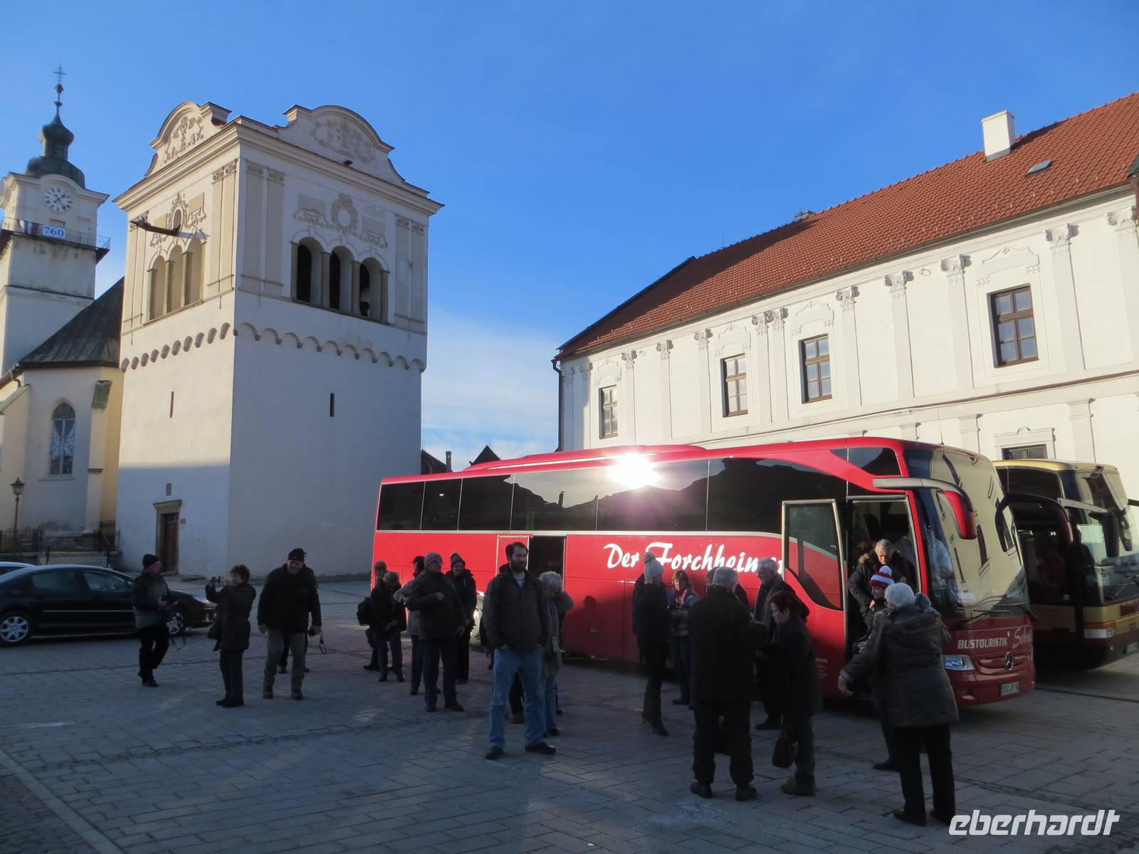 Nach einem Fotostopp unterhalb des Tatrapanoramas ging es Richtung Zipser Land, zunächst durch Levoca weiter Richtung Osten. Nach reichlich einer Fahrstunde sahen wir vor uns aufstrebend die Zipser Burg. Die Fahrstraße an der Ostseite bis hinauf zur Burg war trocken, so dass wir es wagten und sicher das kleine Plateau erreichten. Vom Parkplatz suchten wir uns die besten Fotomotive mit leicht bereiften Sträuchern und trockenen Gräsern auf die Anlage der Zipser Burg. Dann ging es nach Zehra zur romanisch- frügotisch h geprägten Dorfkirche mit jahrhundertealten Fresken - seit 1993 UNESCO Weltkulturerbe gemeinsam mit der Burg und dem Kapitel Spisska Kapitula. Mit musikalischer Untermalung aus dem Zigeunerbaron durchfuhren wir Dörfer, deren Leben heute durch Sinti und Roma bestimmt wird und den Ort Spisske Podhradie (übersetzbar als „unter der Zipser Burg"). Gegenüber der Zipser Burg befindet sich das Zipser Kapitel, Bischofssitz des Oberhaupts der Zipser Katholiken. Da wir schon bald Einlass in die Kirche von Levoca organisiert hatten, verschoben wir den Besuch im Kaitel auf den Nachmittag. Gegen Mittag in Levoca angekommen, hatten wir noch Zeit für einen individuellen Bummel zum Rathaus und zu einigen schönen Bürgerhäusern, an manchem nagt nun schon wieder der Zahn der Zeit. Dann hatten wir die Schlüsselgewalt für eine Besichtigung von St. Jacob. Der bekannte spätgotische Hochaltar war rekonstruiert, aber auch die zahlreichen anderen Altare wirkten mittlerweile entstaubt - hervorragende Weltkunst des Meisters Paul von Leutschau. Die anschließende Stunde gestalteten wir individuell: Bestaunen der Bürgerhäuser, mehr oder weniger Nahrungserwerb zwischen Busbockwurst und leckerer - aber heute kapazitativ recht gegrenzter - Zipser Restaurantküche.
