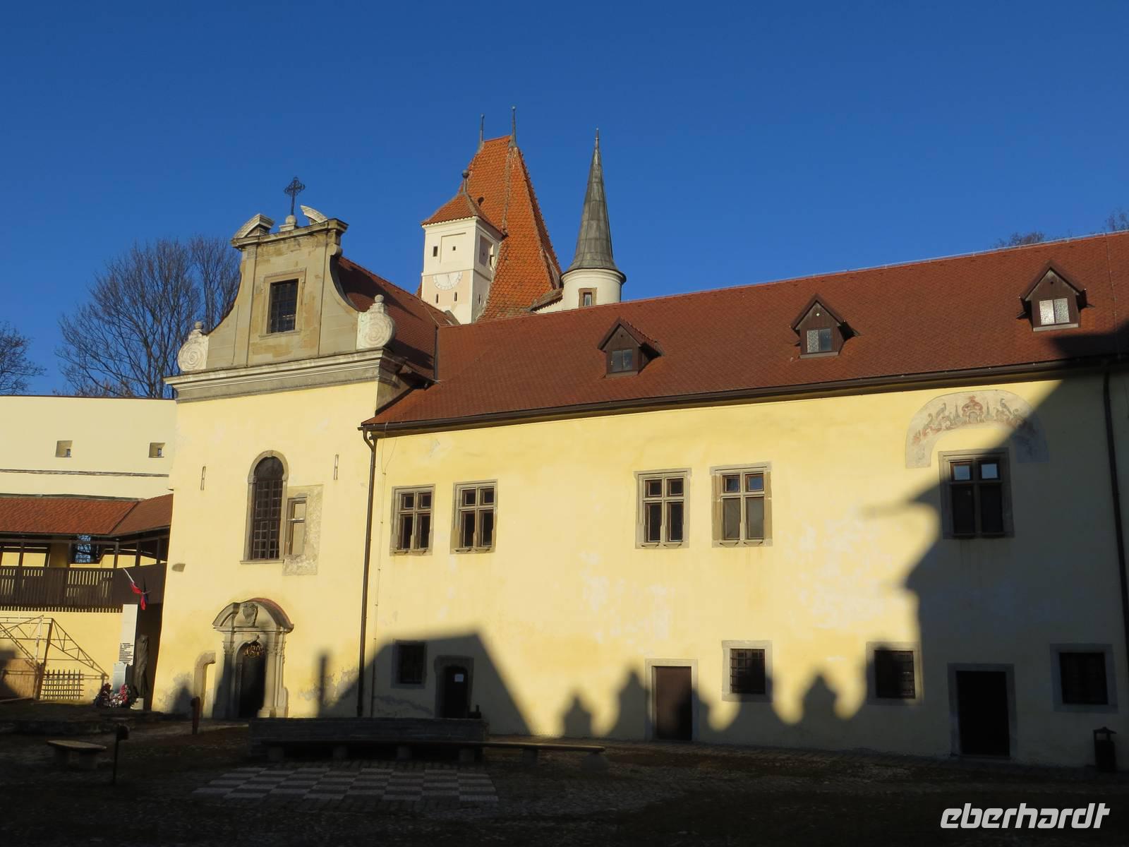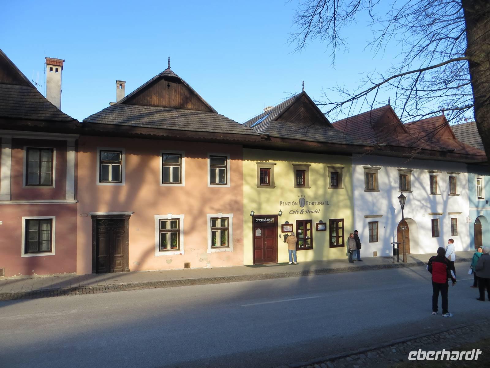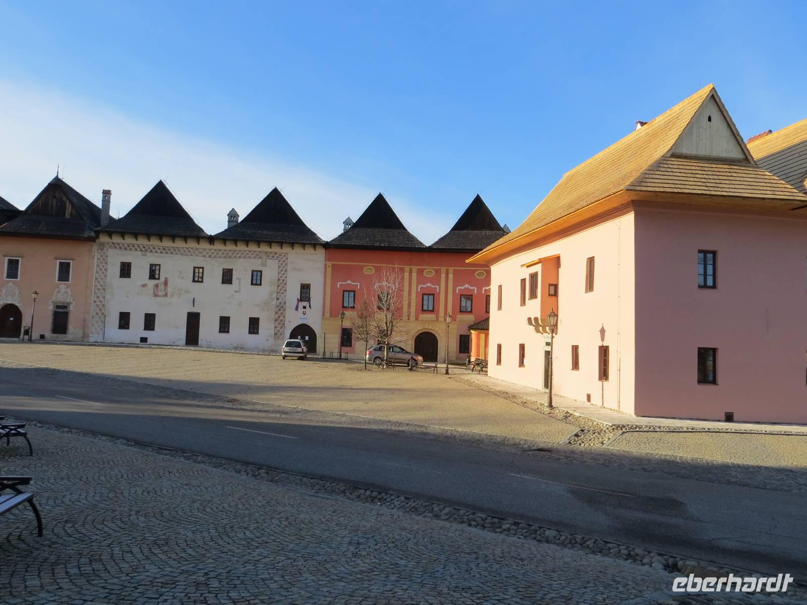 Nach einem Fotostopp unterhalb des Tatrapanoramas ging es Richtung Zipser Land, zunächst durch Levoca weiter Richtung Osten. Nach reichlich einer Fahrstunde sahen wir vor uns aufstrebend die Zipser Burg. Die Fahrstraße an der Ostseite bis hinauf zur Burg war trocken, so dass wir es wagten und sicher das kleine Plateau erreichten. Vom Parkplatz suchten wir uns die besten Fotomotive mit leicht bereiften Sträuchern und trockenen Gräsern auf die Anlage der Zipser Burg. Dann ging es nach Zehra zur romanisch- frügotisch h geprägten Dorfkirche mit jahrhundertealten Fresken - seit 1993 UNESCO Weltkulturerbe gemeinsam mit der Burg und dem Kapitel Spisska Kapitula. Mit musikalischer Untermalung aus dem Zigeunerbaron durchfuhren wir Dörfer, deren Leben heute durch Sinti und Roma bestimmt wird und den Ort Spisske Podhradie (übersetzbar als „unter der Zipser Burg"). Gegenüber der Zipser Burg befindet sich das Zipser Kapitel, Bischofssitz des Oberhaupts der Zipser Katholiken. Da wir schon bald Einlass in die Kirche von Levoca organisiert hatten, verschoben wir den Besuch im Kaitel auf den Nachmittag. Gegen Mittag in Levoca angekommen, hatten wir noch Zeit für einen individuellen Bummel zum Rathaus und zu einigen schönen Bürgerhäusern, an manchem nagt nun schon wieder der Zahn der Zeit. Dann hatten wir die Schlüsselgewalt für eine Besichtigung von St. Jacob. Der bekannte spätgotische Hochaltar war rekonstruiert, aber auch die zahlreichen anderen Altare wirkten mittlerweile entstaubt - hervorragende Weltkunst des Meisters Paul von Leutschau. Die anschließende Stunde gestalteten wir individuell: Bestaunen der Bürgerhäuser, mehr oder weniger Nahrungserwerb zwischen Busbockwurst und leckerer - aber heute kapazitativ recht gegrenzter - Zipser Restaurantküche.