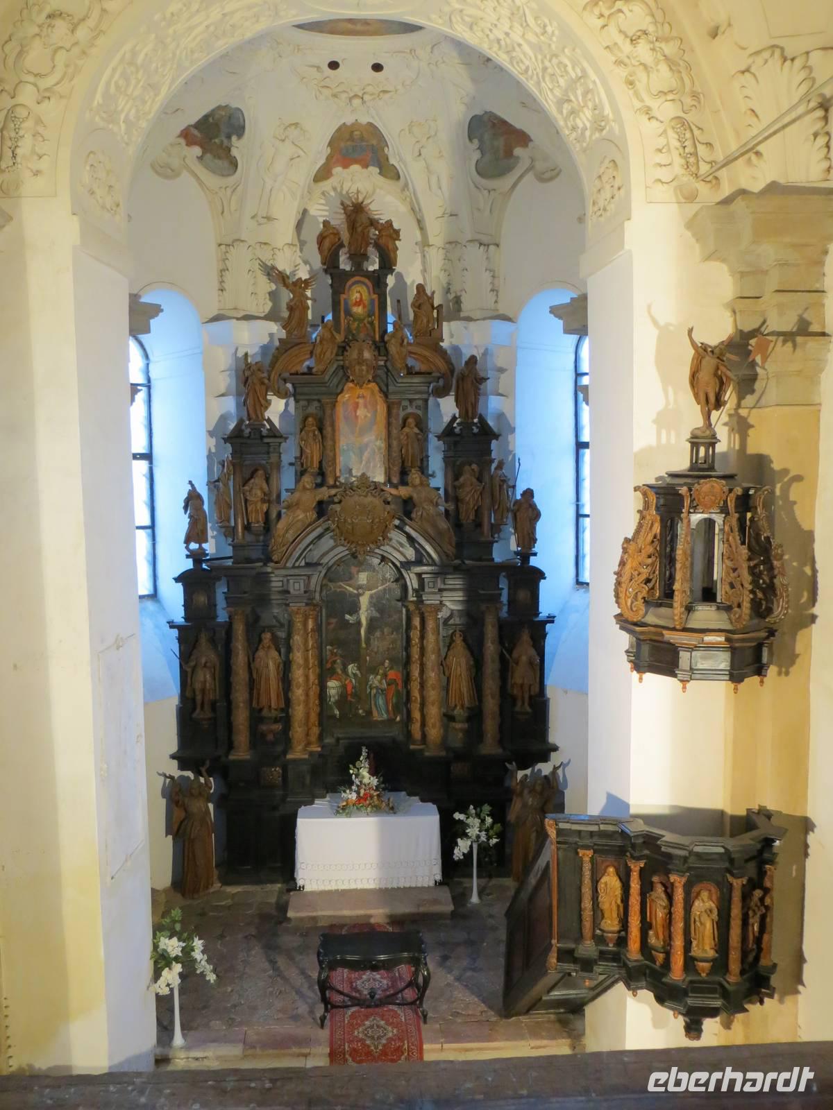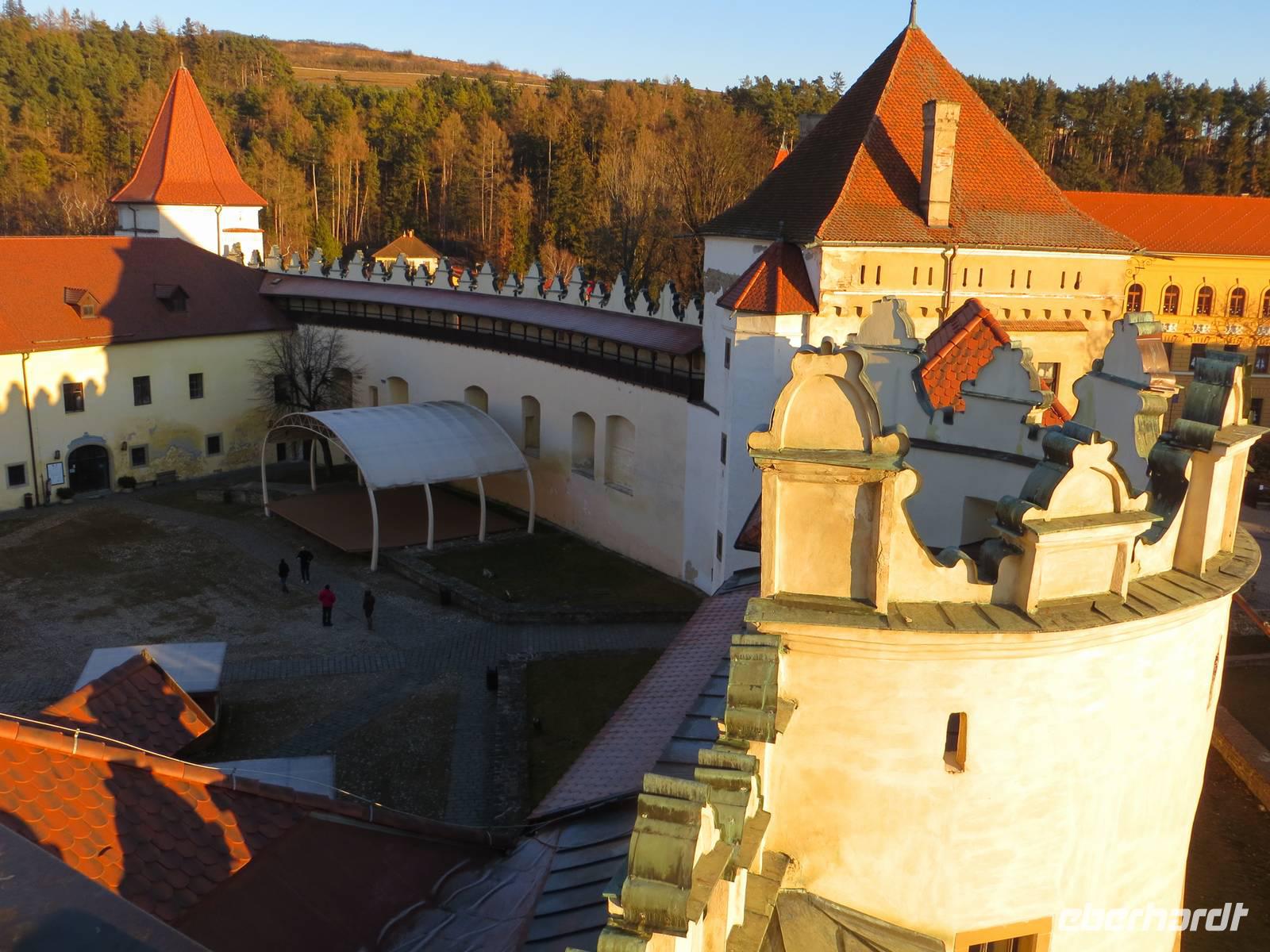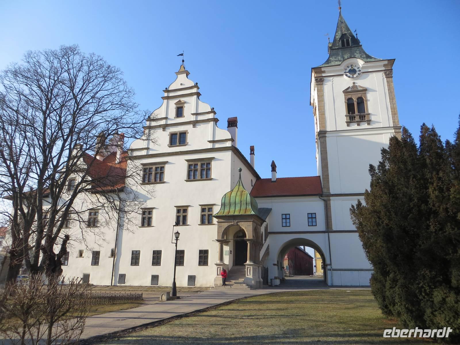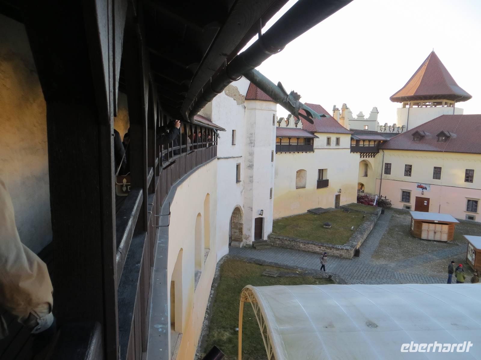 Nach einem Fotostopp unterhalb des Tatrapanoramas ging es Richtung Zipser Land, zunächst durch Levoca weiter Richtung Osten. Nach reichlich einer Fahrstunde sahen wir vor uns aufstrebend die Zipser Burg. Die Fahrstraße an der Ostseite bis hinauf zur Burg war trocken, so dass wir es wagten und sicher das kleine Plateau erreichten. Vom Parkplatz suchten wir uns die besten Fotomotive mit leicht bereiften Sträuchern und trockenen Gräsern auf die Anlage der Zipser Burg. Dann ging es nach Zehra zur romanisch- frügotisch h geprägten Dorfkirche mit jahrhundertealten Fresken - seit 1993 UNESCO Weltkulturerbe gemeinsam mit der Burg und dem Kapitel Spisska Kapitula. Mit musikalischer Untermalung aus dem Zigeunerbaron durchfuhren wir Dörfer, deren Leben heute durch Sinti und Roma bestimmt wird und den Ort Spisske Podhradie (übersetzbar als „unter der Zipser Burg"). Gegenüber der Zipser Burg befindet sich das Zipser Kapitel, Bischofssitz des Oberhaupts der Zipser Katholiken. Da wir schon bald Einlass in die Kirche von Levoca organisiert hatten, verschoben wir den Besuch im Kaitel auf den Nachmittag. Gegen Mittag in Levoca angekommen, hatten wir noch Zeit für einen individuellen Bummel zum Rathaus und zu einigen schönen Bürgerhäusern, an manchem nagt nun schon wieder der Zahn der Zeit. Dann hatten wir die Schlüsselgewalt für eine Besichtigung von St. Jacob. Der bekannte spätgotische Hochaltar war rekonstruiert, aber auch die zahlreichen anderen Altare wirkten mittlerweile entstaubt - hervorragende Weltkunst des Meisters Paul von Leutschau. Die anschließende Stunde gestalteten wir individuell: Bestaunen der Bürgerhäuser, mehr oder weniger Nahrungserwerb zwischen Busbockwurst und leckerer - aber heute kapazitativ recht gegrenzter - Zipser Restaurantküche.