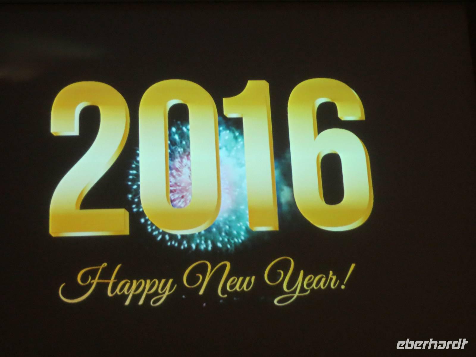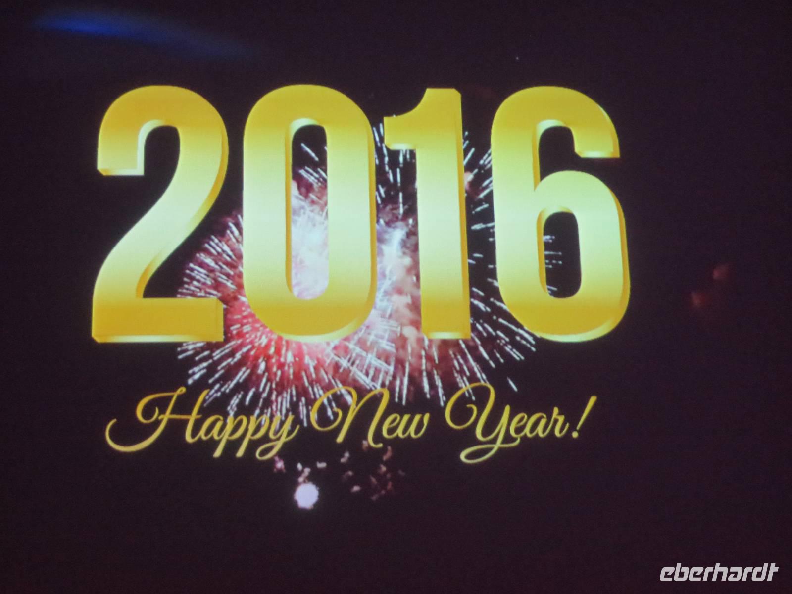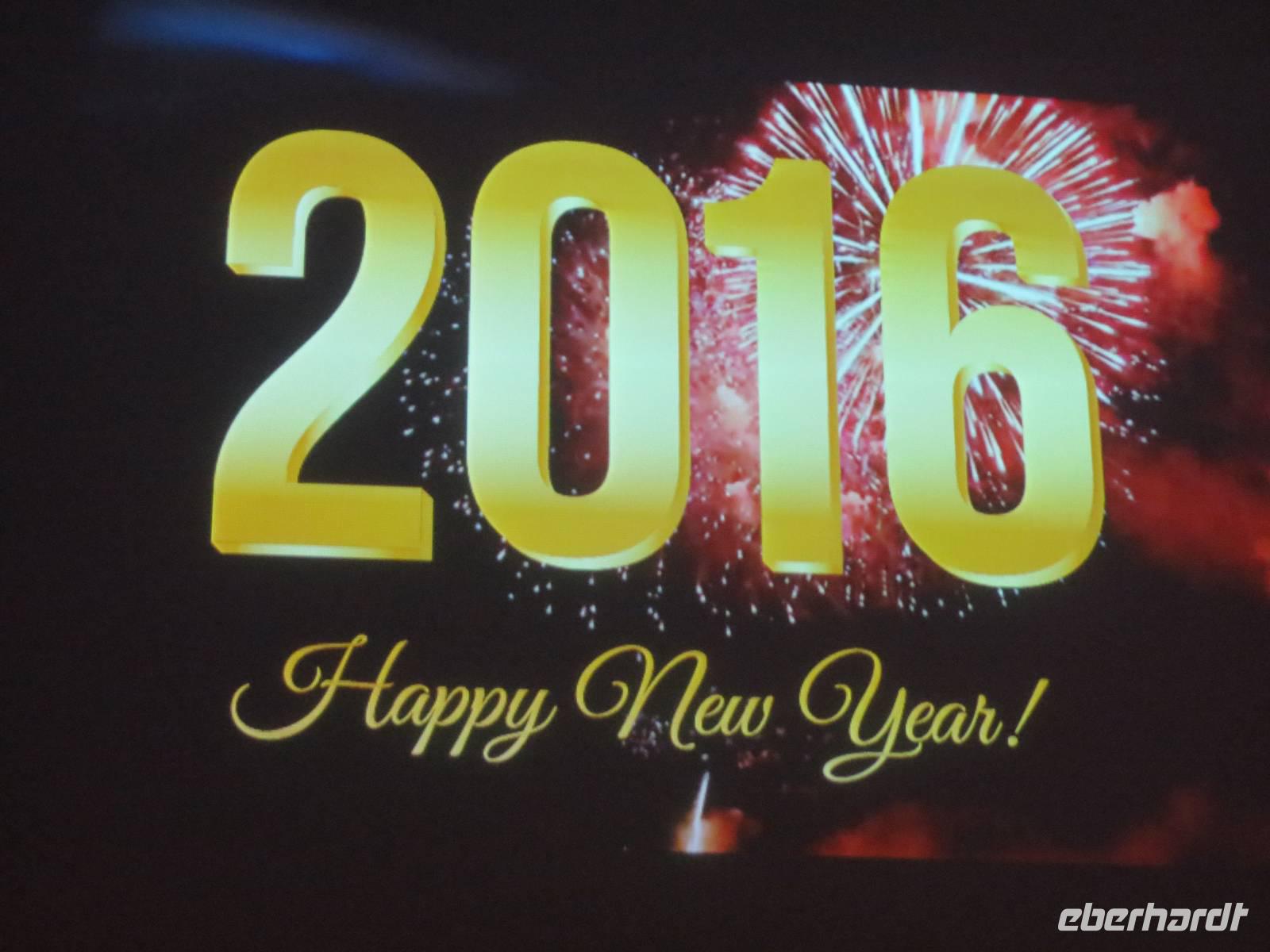 Ab 19:00 Uhr dann im Kongresssaal die, vier Generationen und Gäste aus der Slowakei, Tschechien, Deutschland, der Ukraine und Russland vereinende Sylvesterfeier unter dem Motto „Sixties and Seventies": Galamenü in 4-Gängen, Mitternachtsbuffet, alle Getränke inklusiv und unbegrenzt; Live-Band, Programmeinlagen durch Tänzer, Sänger und eine Abba-Adaption. Gegen ein Uhr dann eine Verlosung von Preisen. Dabei gingen drei Preise - darunter ein Übernachtungsgutschein für das gastgebende Hotel - von zehn auch an Eberhardt-Gäste. Losglück zu Jahresbeginn - ein Zeichen für Glück und Gesundheit im Neuen Jahr? Wie wird es mit Europa weitergehen?