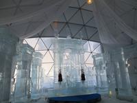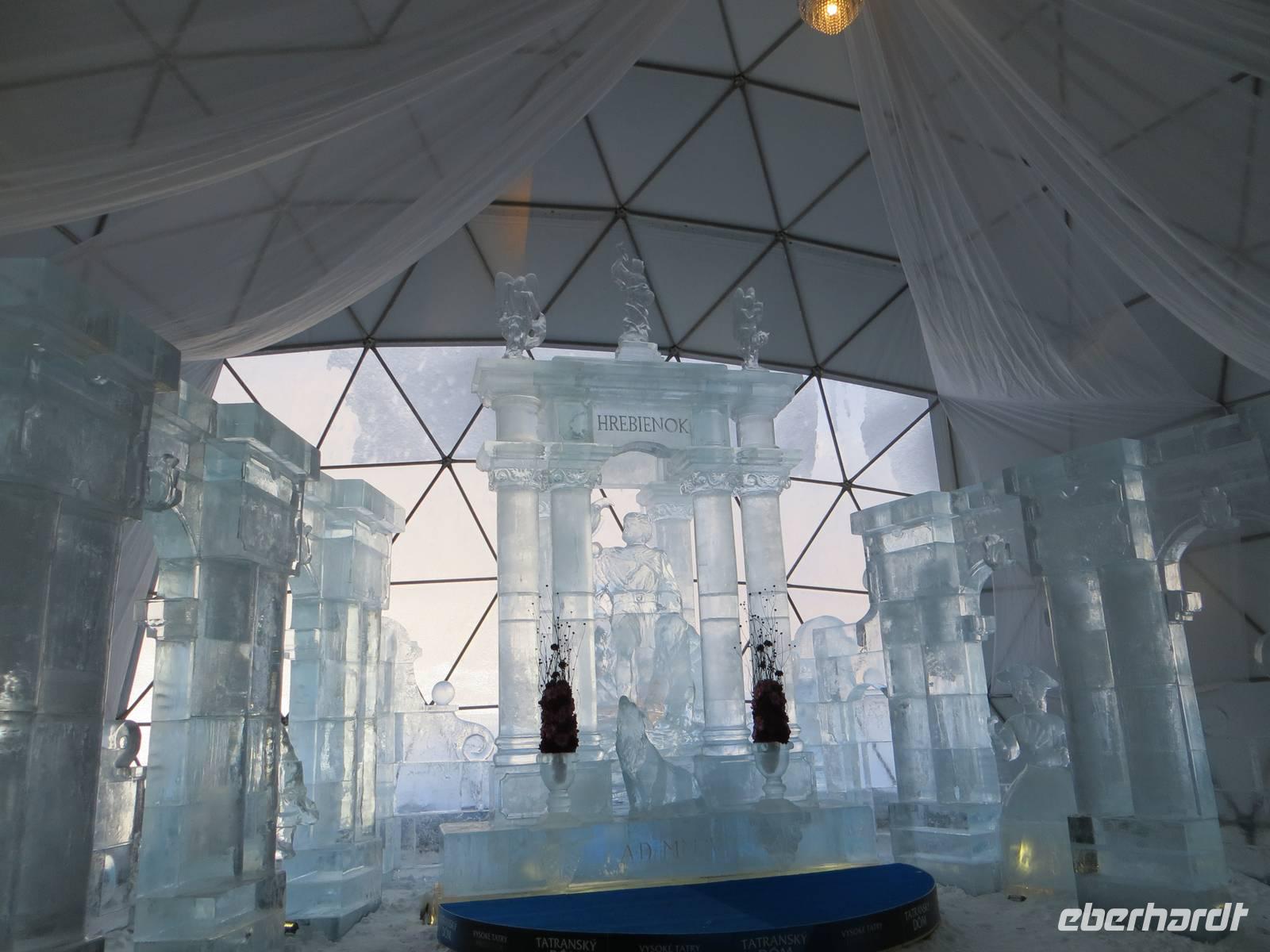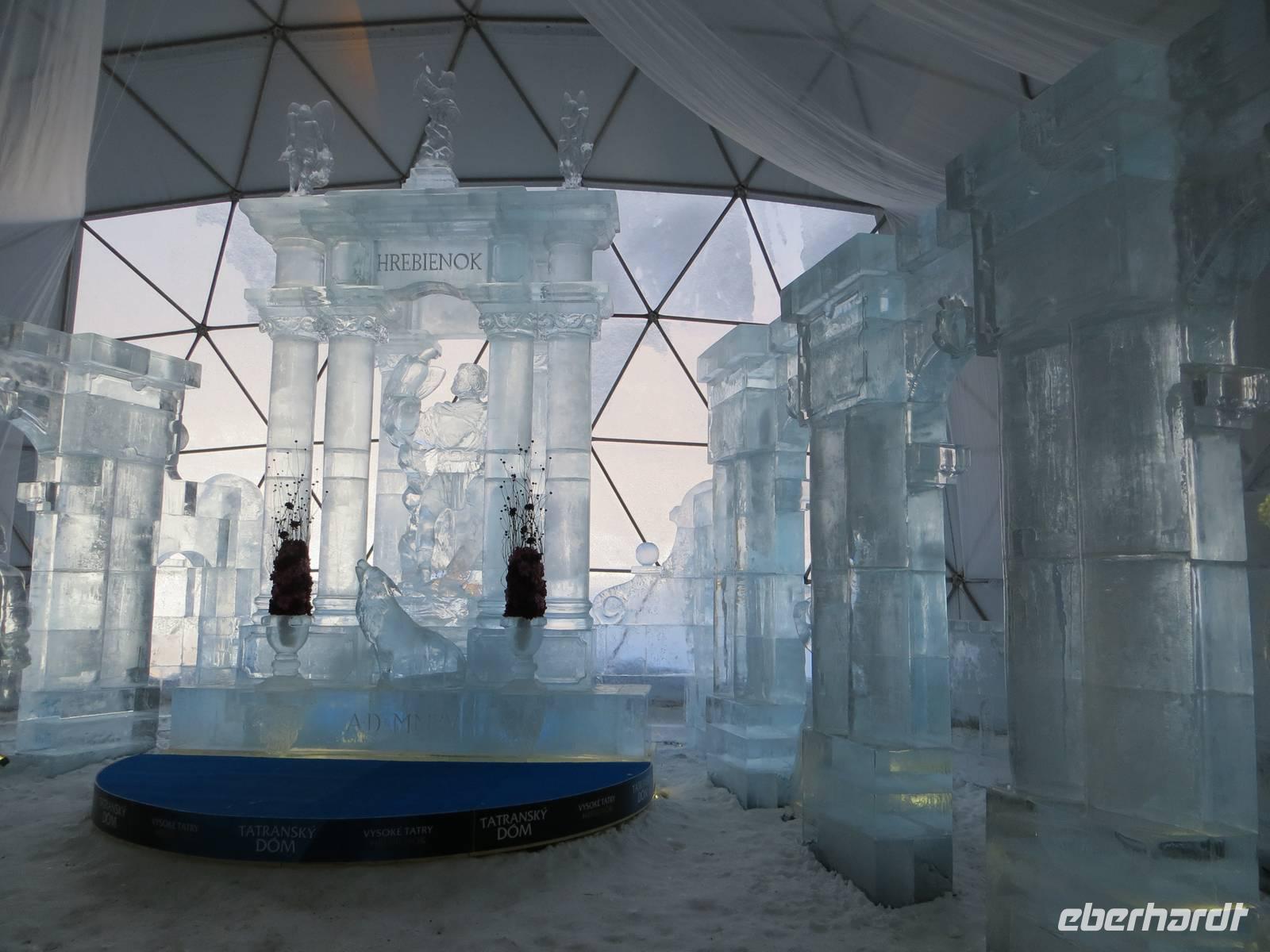 Bei - wie an bisher allen Tagen - blauem Himmel starteten wir zu Fuß den etwa ein Kilometer langen Weg durch das Zentrum von Stary Smokovec zur unteren Bahnstation der Bahn auf den Hrebienok: der erste Teil des fakultativen Ausflugstages. In wenigen Minuten fuhren wir auf Gleisen hinauf zum Hrebienok in 1.285 Meter Höhe. Im Sonnenschein präsentierten sich die Tatragipfel in Nähe der Lomnitzer Spitze und Wolkenschwaden zogen über Poprad und den Liptauer Talkessel. Im Süden ragten die östlichen Gipfel der Niederen Tara hervor. Die Möglichkeit in wenigen hundert Metern die Bilikova-Hütte zu erreichen, nutzte wohl niemand, nachdem auf einer winzig kleinen Eisfläche bereits unser Busfahrer gestürzt war. Dafür schauten sich wohl alle die eisige Pracht einer pseudoantiken Kolonnade im Igloo neben der Berghütte an.