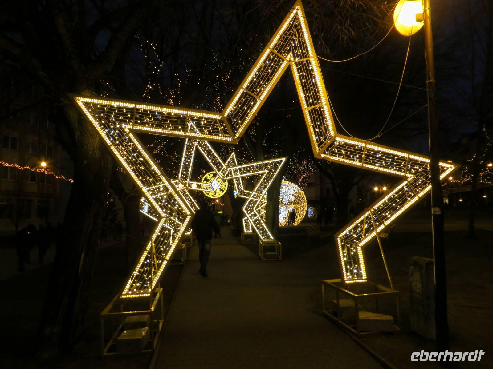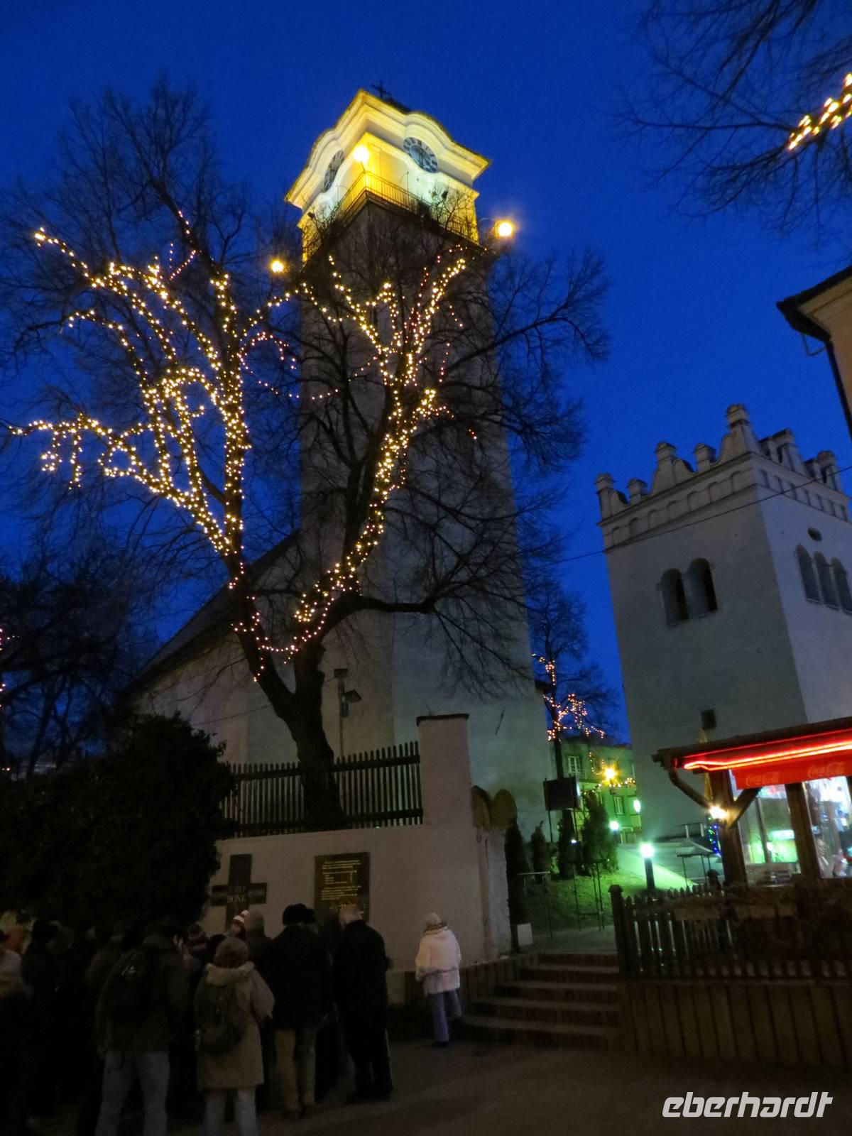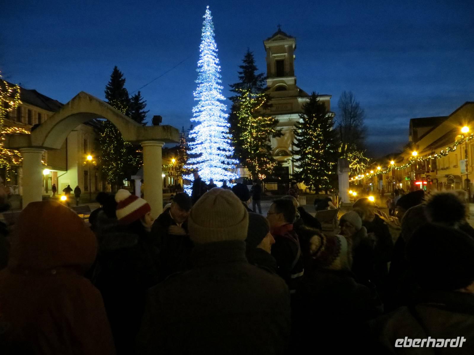 Nach einem kurzen Intermezzo wieder im Hotel starteten wir am späten Mittag nach Spisska Subota / Deutsch Georgsberg, einem Stadtteil von Poprad. Rund um Kirche und Renaissanceglockenturm sind entlang des langen Platzes bestens rekonstruierte regionaltypische Häuser angesammelt: im oberen Teil die größeren der deutschen Bauherren und im unteren, um heute protestantische Kirche, die der bäuerlichen slowakischen Erbauer. Im rustikalen Wirtshaus Sobota nahmen wir einen kleinen typisch Zipser Imbiss ein, der sich dann doch als recht üppiges Mahl herausstellte. So verlegten wir die abendliche Tischzeit um zwei Stunden. Das verschaffte uns ausreichend Zeit für einen Bummel durch die Innenstadt von Poprad, wo wir uns an der weihnachtlichen Illumination erfreuten und auch am Denkmal für die Opfer des 21. August 1968, dem Tag des Einmarsches von Armeen der Warschauer Vertragsstaaten in die Tschechoslovakei, stehen blieben.