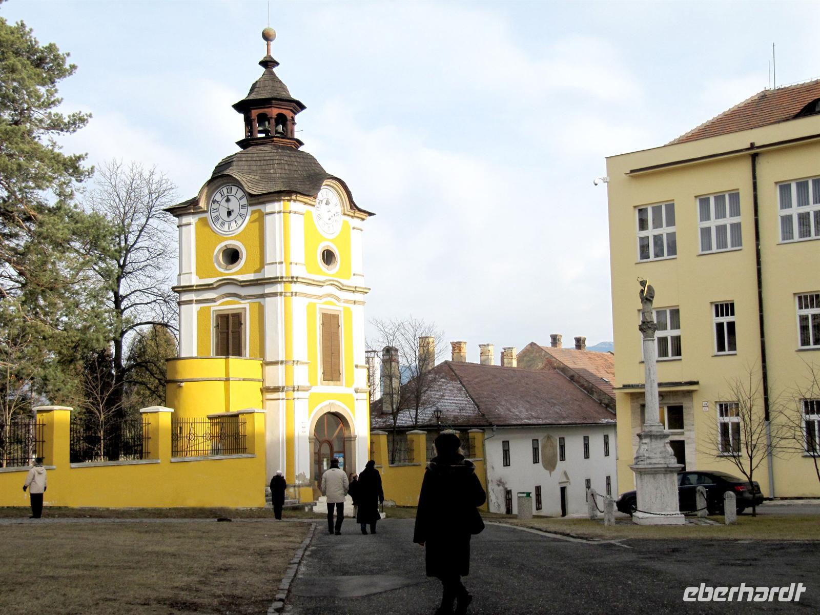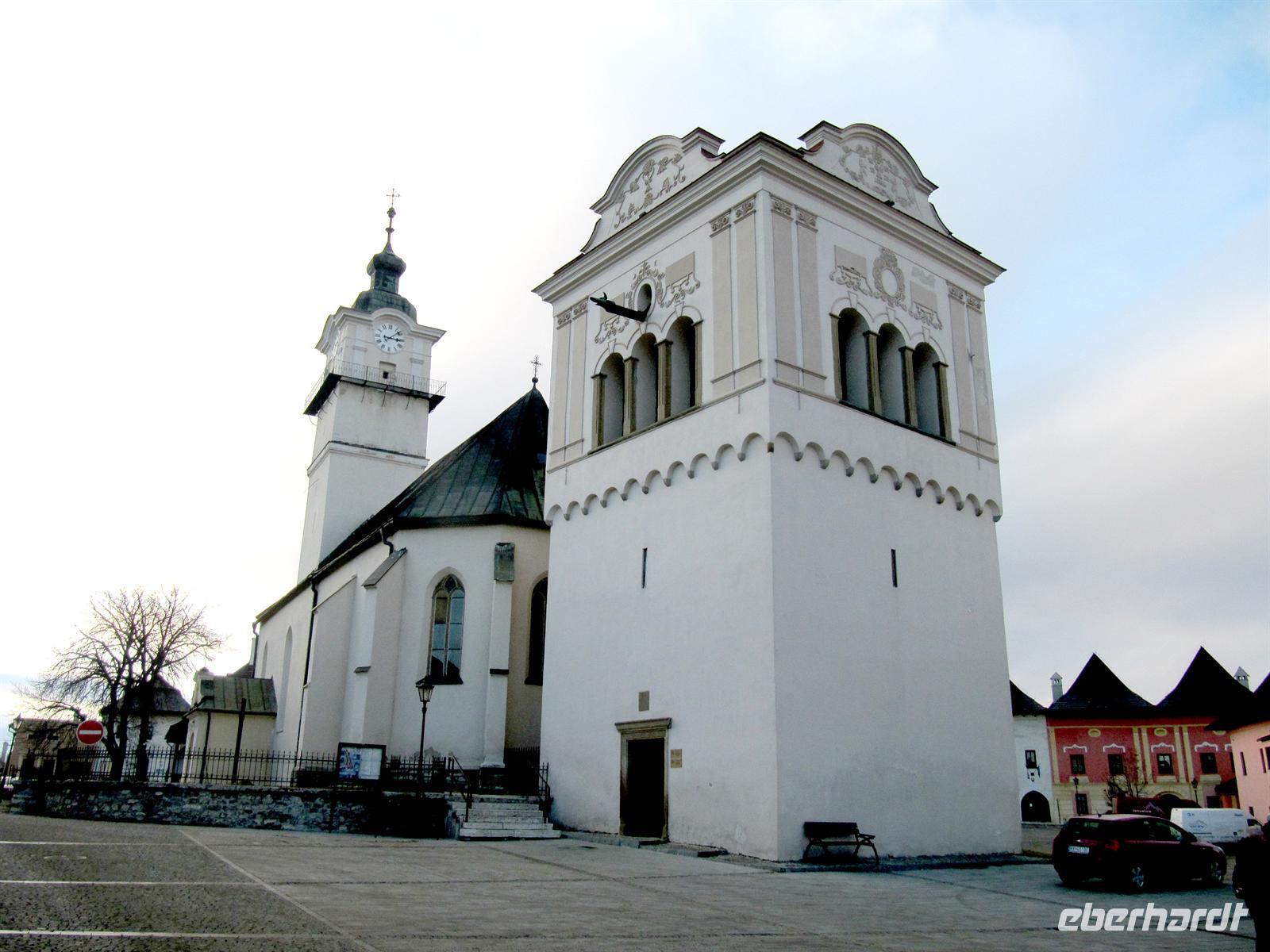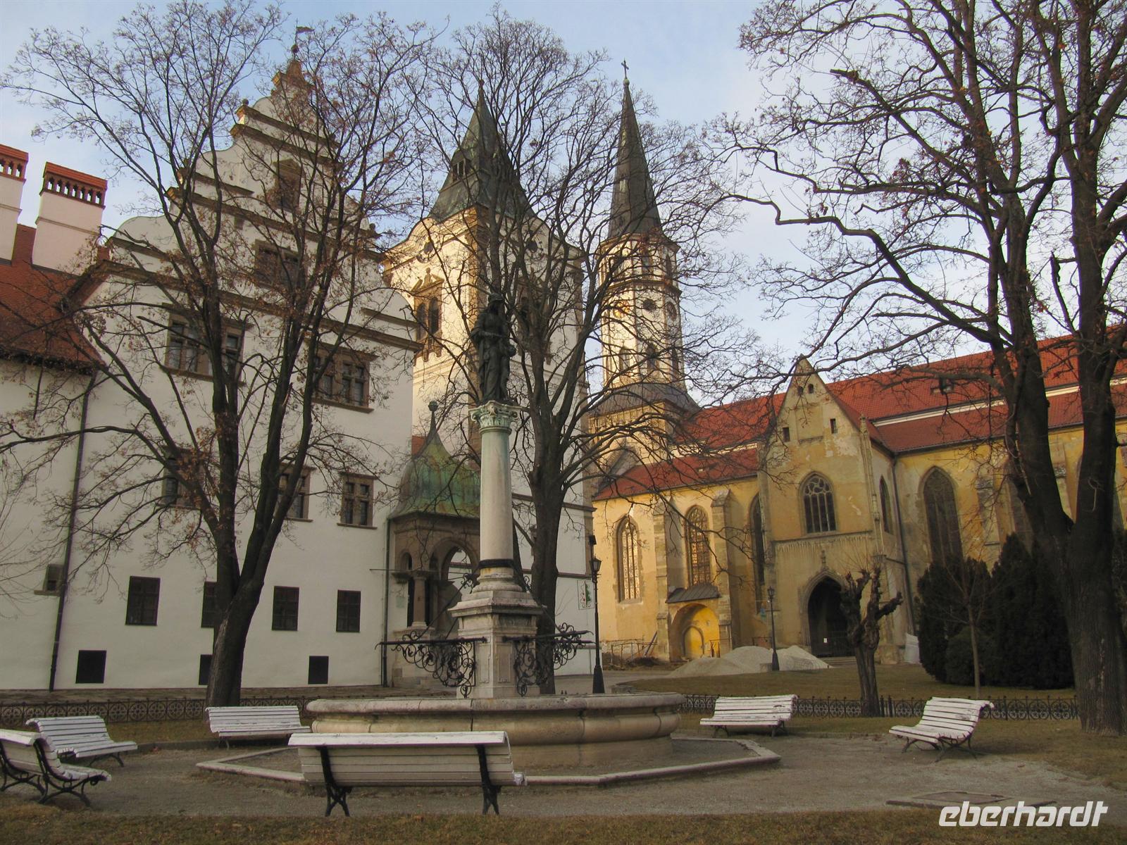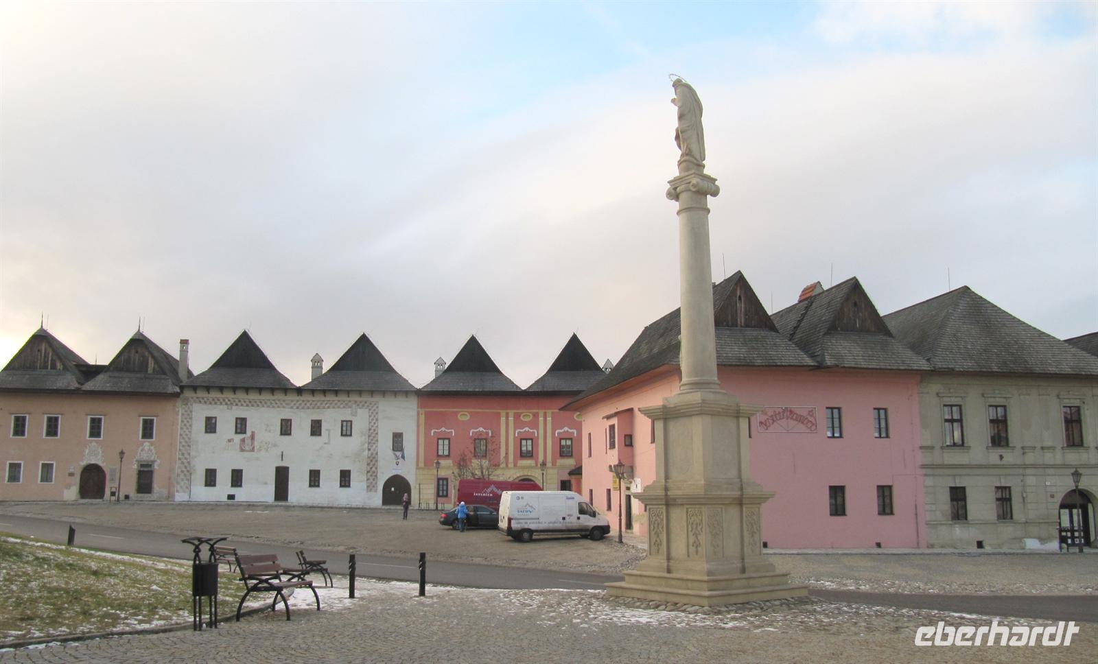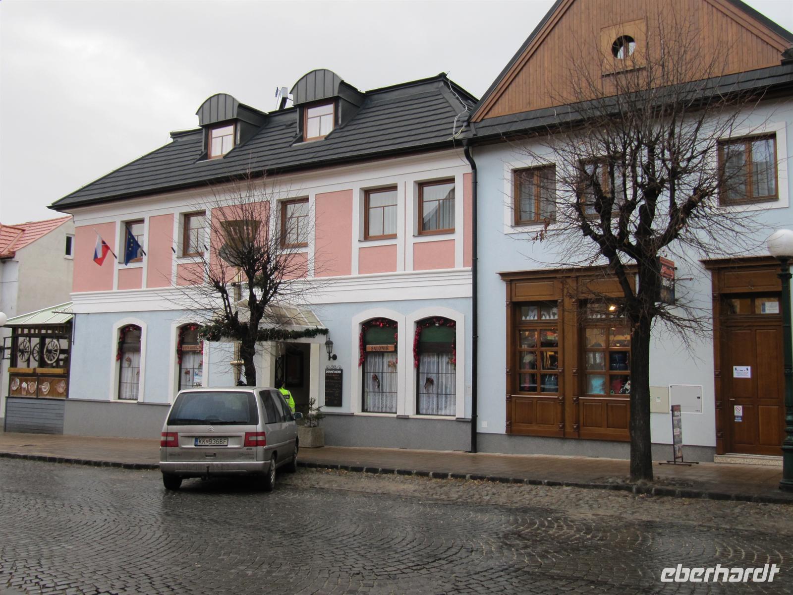 Jeder Reisegast stärkte sich in diesem rustikalen Ambiente ganz nach seinen Wünschen. Vorbei an den Orten Podolinec, Busovce und Spisska Bela führte uns unser Ausflug nun nach Spisska Sobota, einer alten bedeutenden Stadt der Zipps. Auch hier siedelten nach dem Tatareneinfall von 1241 deutsche Kolonisten, die Zipser Sachsen. Sie gründeten eine Marktsiedlung mit verschiedenen Handwerken. Die Stadt gehörte zum Bund der 24 Zipser Städte und zur Bruderschaft der 24 königlichen Pfarrer. Der Marktplatz präsentierte sich uns in der für die Zips typischen langgestreckten Form mit einer Kirche und dem separaten Glockenturm. Wir besichtigten die Kirche des Hl. Georg, eine römisch-katholische Kirche aus dem Jahr 1273, und bestaunten die fünf spätgotischen Flügelaltare und den Hauptaltar des Hl. Georg, ein Werk des Paul von Letschau. Und auch hier staunten wir über diese meisterhafte Ausführung der lebensgroßen Figuren. Wir verweilten einen Moment auf dem Marktplatz, der mit viel Liebe rekonstruiert wird, und setzten unseren Ausflug schließlich nach Poprad fort. Hier unternahmen wir einen Bummel in der restaurierten Fußgängerzone vorbei an der evangelischen Kirche.