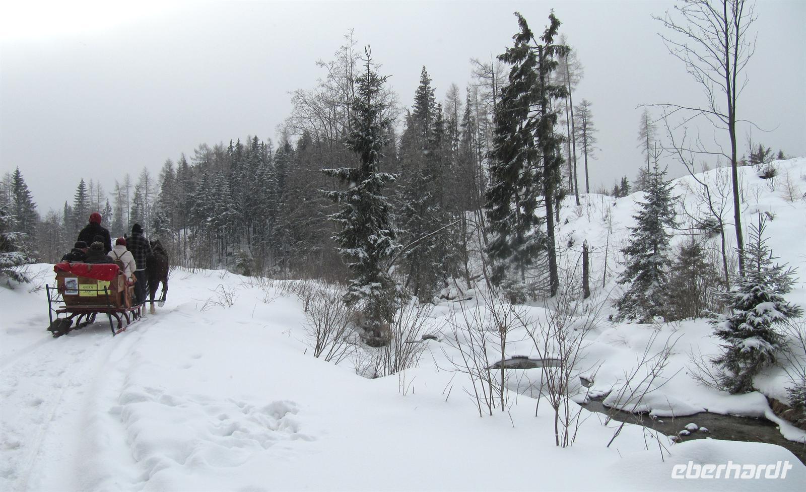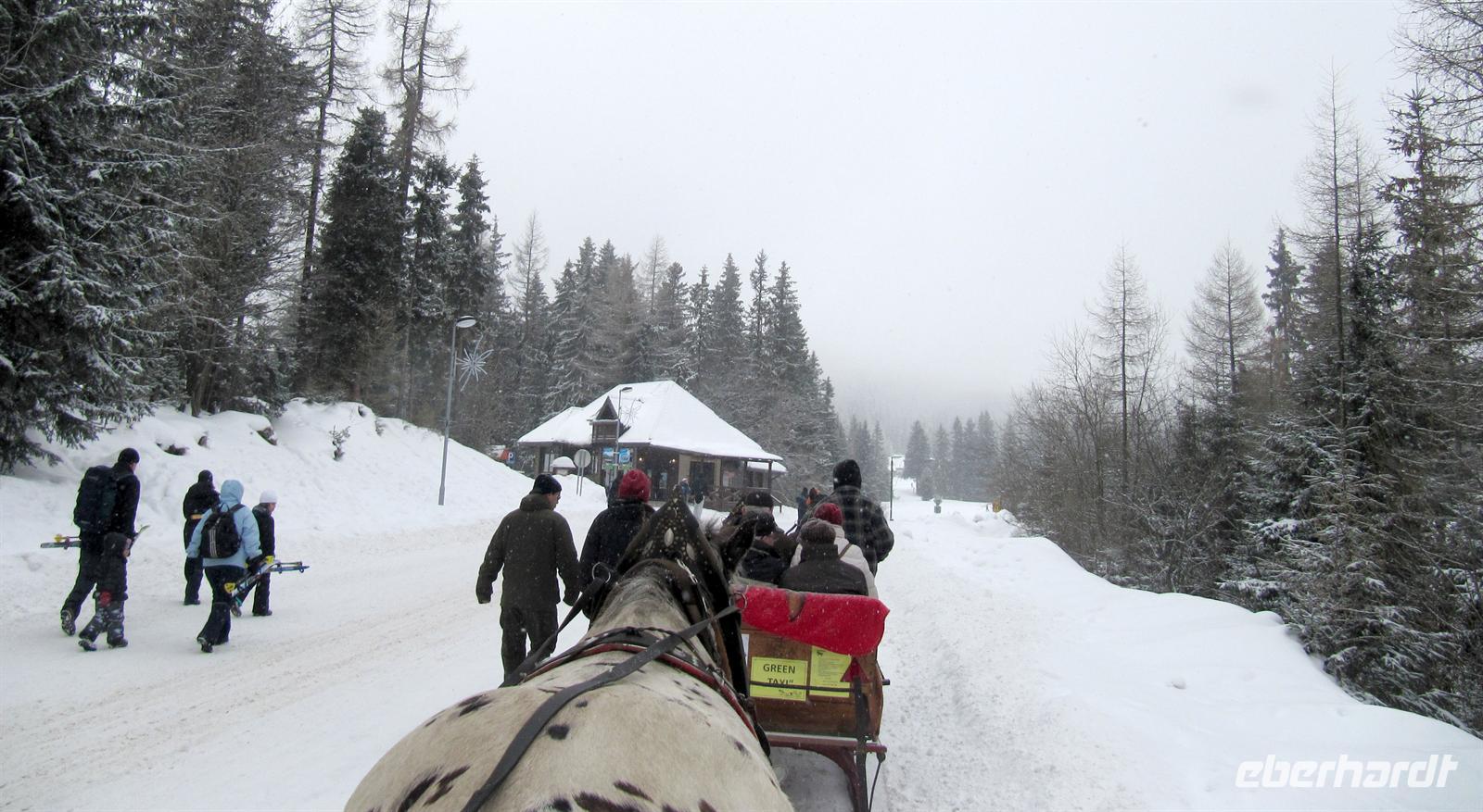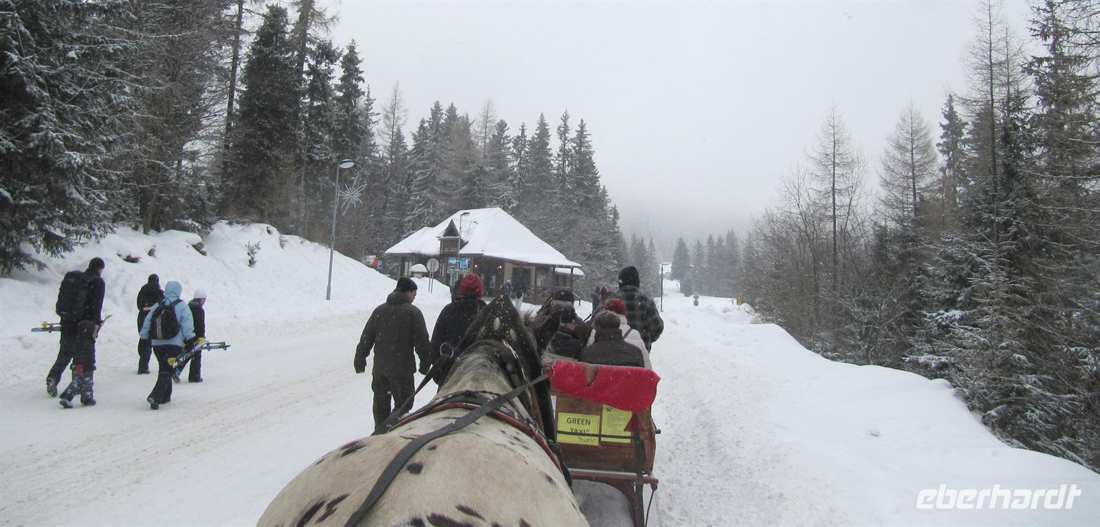 Der Morgen des Silvestertages begrüßte uns mit Sonnenschein. Unser erstes Ziel des Tages war der höchstgelegenste Ort der Slowakei und das Eldorado der Skifahrer, Strbske Pleso. Vorbei an Tatranska Lomnica und über die Straße der Freiheit erreichten wir den großen Parkplatz in 1.335 Metern Höhe. Unterwegs berichtete Helena von den Auswirkungen des Orkans von 2004, der 12.600 Hektar des dichten Fichtenwaldes vernichtete. Die breiten Schneisen zeugen noch heute von dieser Naturkatastrophe. Strbske Pleso und der Tschirmer See begrüßten uns mit tollem Winterwetter, Schneeflocken tanzten flott um die Wette. Ein Anblick, den wir in diesem Winter bisher noch nicht genießen durften! Für uns standen Pferdekutschen bereit ... Eine gemütliche Tour führte uns bis zu den Skisprungschanzen, zum Hotel „Patria“ und dann direkt in den wundervoll verschneiten Wunderwald in die Nähe des Liebessees. Wir hatten anschließend genügend Zeit, um am See und im Ort zu bummeln oder in einem der Restaurants einzukehren. Der Schneefall wurde immer dichter, ein Anblick, der uns sehr erfreute. Anschließend wechselten wir das Verkehrsmittel. Wir fuhren mit dem Panoramazug der Tatrabahn von Strbske Pleso hinab nach Stary Smokovec. Unterwegs boten sich uns freie Blicke in das Poprader Becken und zur Niederen Tatra. In Stary Smokovec angekommen unternahmen wir einen Spaziergang in der Stadt zu den Bergbahnen, zu den prächtigen Bauten der Jahrhundertwende wie der Heilanstalt Palace oder dem Grand Hotel. Helena berichtete von dem Vorhaben des Schweizer Arztes Nikolaus Szontagh, der hier vor allem Tuberkulose-Kranke behandelte und die Vision hatte, in dieser klaren Bergluft ein zweites Davos zu verwirklichen. Der Weg führte uns auch zur Quelle des Kurortes, des seit uralten Zeiten bekannten „Altschmeckser Sauerwassers“. Hier bauten wir im Schnee einen kleinen Glücksschneemann für das Jahr 2012. Die Legende besagt, dass der Bau eines Schneemannes ebenso Glück bringt wie in Norwegen der eines Trolles! So soll er unser Glückssymbol für das Neue Jahr werden.
