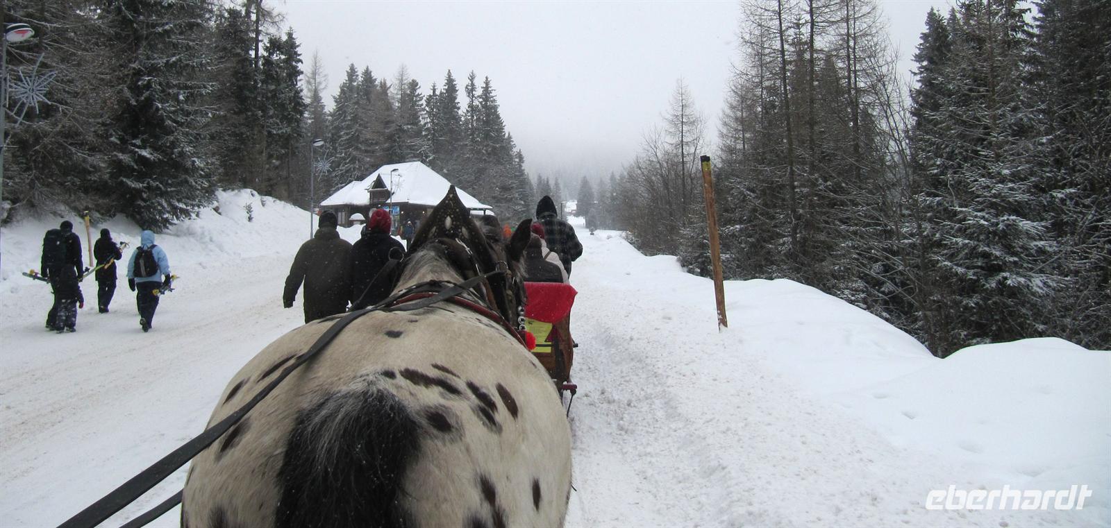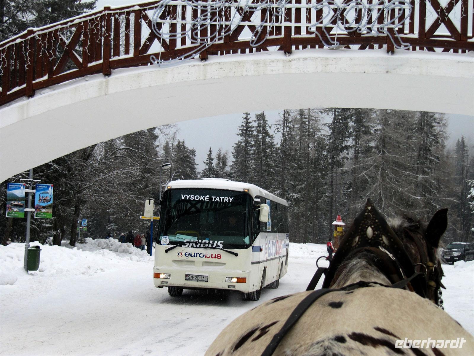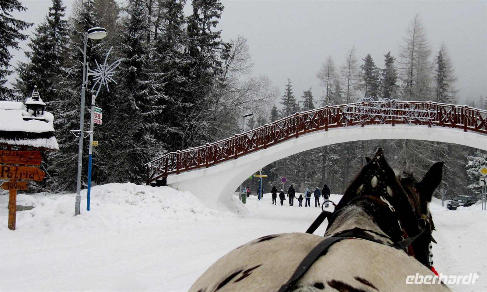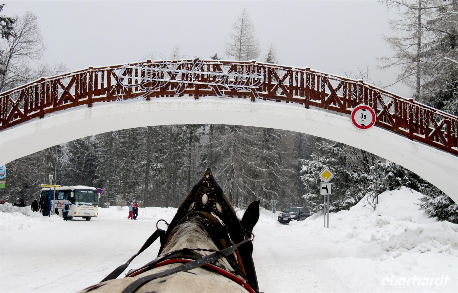 Der Morgen des Silvestertages begrüßte uns mit Sonnenschein. Unser erstes Ziel des Tages war der höchstgelegenste Ort der Slowakei und das Eldorado der Skifahrer, Strbske Pleso. Vorbei an Tatranska Lomnica und über die Straße der Freiheit erreichten wir den großen Parkplatz in 1.335 Metern Höhe. Unterwegs berichtete Helena von den Auswirkungen des Orkans von 2004, der 12.600 Hektar des dichten Fichtenwaldes vernichtete. Die breiten Schneisen zeugen noch heute von dieser Naturkatastrophe. Strbske Pleso und der Tschirmer See begrüßten uns mit tollem Winterwetter, Schneeflocken tanzten flott um die Wette. Ein Anblick, den wir in diesem Winter bisher noch nicht genießen durften! Für uns standen Pferdekutschen bereit ... Eine gemütliche Tour führte uns bis zu den Skisprungschanzen, zum Hotel „Patria“ und dann direkt in den wundervoll verschneiten Wunderwald in die Nähe des Liebessees. Wir hatten anschließend genügend Zeit, um am See und im Ort zu bummeln oder in einem der Restaurants einzukehren. Der Schneefall wurde immer dichter, ein Anblick, der uns sehr erfreute. Anschließend wechselten wir das Verkehrsmittel. Wir fuhren mit dem Panoramazug der Tatrabahn von Strbske Pleso hinab nach Stary Smokovec. Unterwegs boten sich uns freie Blicke in das Poprader Becken und zur Niederen Tatra. In Stary Smokovec angekommen unternahmen wir einen Spaziergang in der Stadt zu den Bergbahnen, zu den prächtigen Bauten der Jahrhundertwende wie der Heilanstalt Palace oder dem Grand Hotel. Helena berichtete von dem Vorhaben des Schweizer Arztes Nikolaus Szontagh, der hier vor allem Tuberkulose-Kranke behandelte und die Vision hatte, in dieser klaren Bergluft ein zweites Davos zu verwirklichen. Der Weg führte uns auch zur Quelle des Kurortes, des seit uralten Zeiten bekannten „Altschmeckser Sauerwassers“. Hier bauten wir im Schnee einen kleinen Glücksschneemann für das Jahr 2012. Die Legende besagt, dass der Bau eines Schneemannes ebenso Glück bringt wie in Norwegen der eines Trolles! So soll er unser Glückssymbol für das Neue Jahr werden.