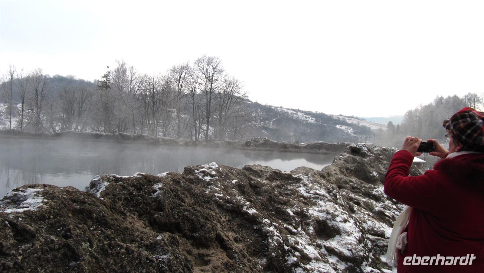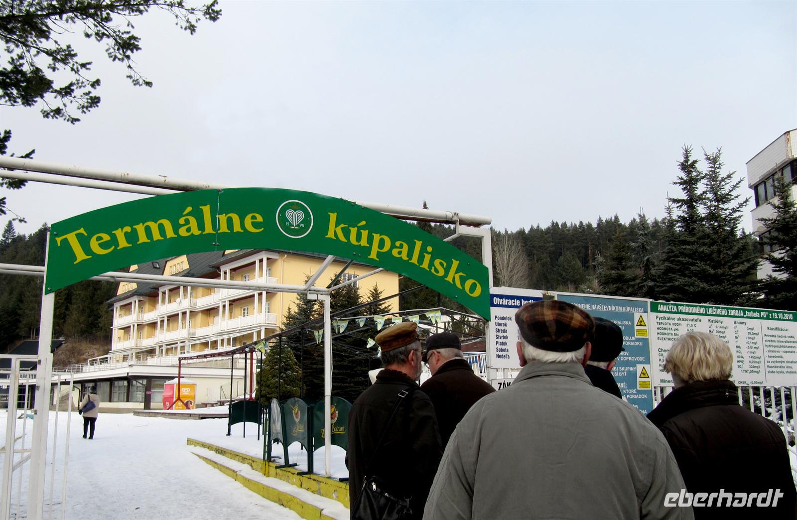 Nach dem späten Frühstück 11.00 Uhr fuhren wir in den Kurort Vysne Ruzbachy im Magura-Gebirge. Unser Neujahrsspaziergang führte uns vorbei am Weißen Haus, dem Zentrum des Kurortes, zum Grand-Hotel. Das Wasser der Heilquellen ist angereichert mit Schwefelkohlenstoff, Kalk und Magnesium. Aus neun Quellen sprudeln 150 Liter Wasser pro Sekunde mit einer Temperatur von 19 °C bis 22 °C. Behandelt werden hier vor allem Erkrankungen des Bewegungsapparates und der Nerven. Als besondere Attraktion gilt der größte Kratersee der Slowakei mit 20 Metern Durchmesser und 3 Metern Tiefe. Zum Mittagessen waren für uns Plätze im Restaurant der Pension „Kamenny dvor“ reserviert.