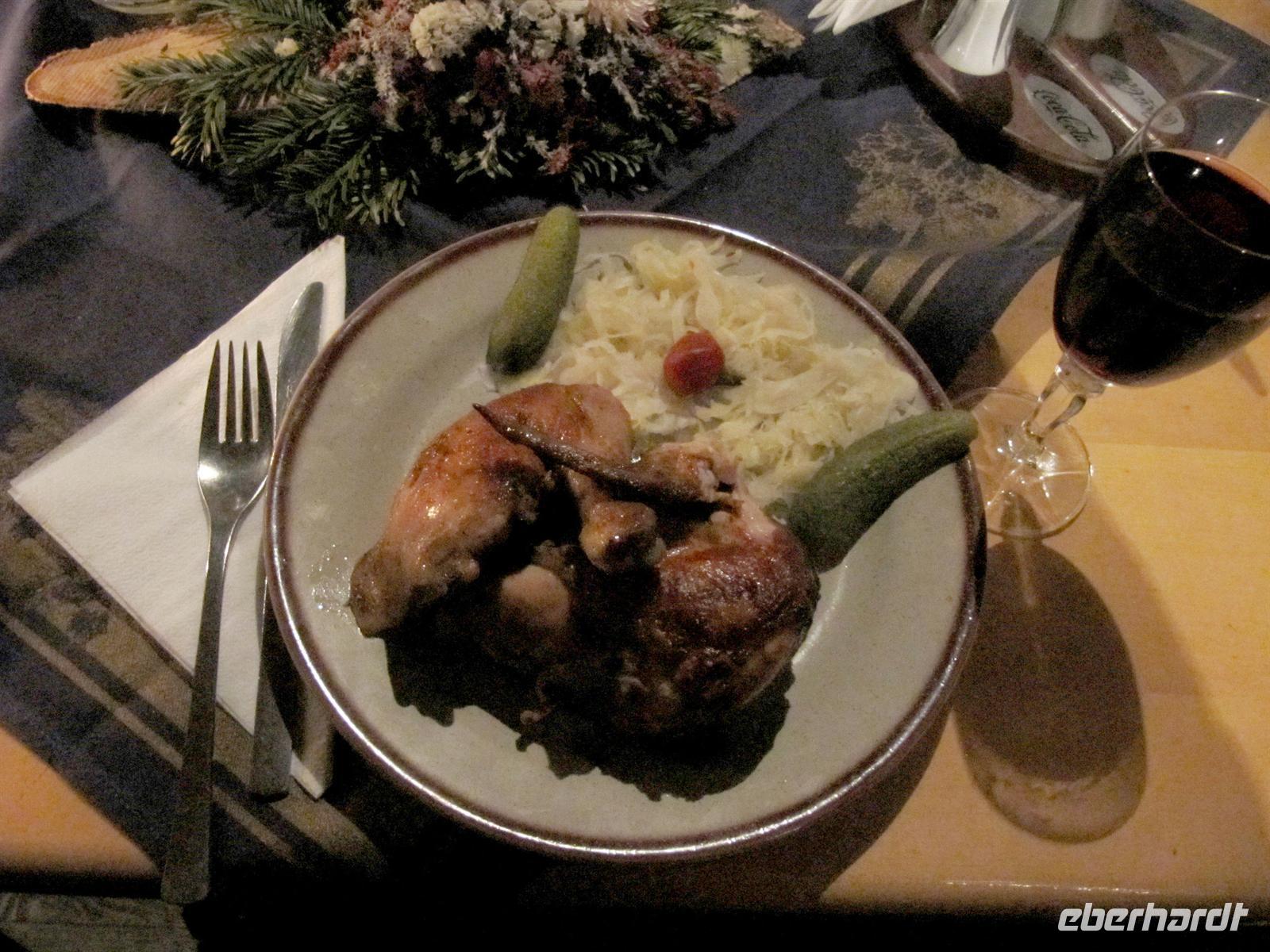 Nach diesem interessanten Ausflug brachte uns Thomas zurück nach Kezmarok. Wir hatten so, etwas Zeit, um uns auf die Silvesterfeier vorzubereiten. Das Team Hotels hatte das Restaurant für uns festlich ausgestaltet, die Küche ein schmackhaftes Menü vorbereitet: Teigroulade mit Brokolicreme, Hirschfilet mit Preiselbeeren, Kuchen und Kaffee. Der Seniorchef des Hotels, Michael, ließ es sich nicht nehmen, uns herzlich zu begrüßen und den Tanz zu eröffnen. Das Trio „Harmonie“ unterhielt uns stimmungsvoll mit slowakischer Musik, deutschen Schlagern und internationalen Hits. Zudem fand im Haus eine Hochzeit statt. Die Hochzeitsgesellschaft erfreute uns mit slowakischen Tänzen. Schnell waren wir einbezogen. Die Zeit verging wie im Fluge. 23.00 Uhr überraschte uns die Küche mit einem Spanferkel! Wir wurden wirklich verwöhnt ... Um Mitternacht stießen wir auf ein glückliches Jahr 2012 mit Sekt an! Das „Rezept für das Jahr 2012“ soll uns über das Jahr der 366 Tage begleiten. Bis ca. 02.00 Uhr tanzten wir weiter in das Neue Jahr hinein.
