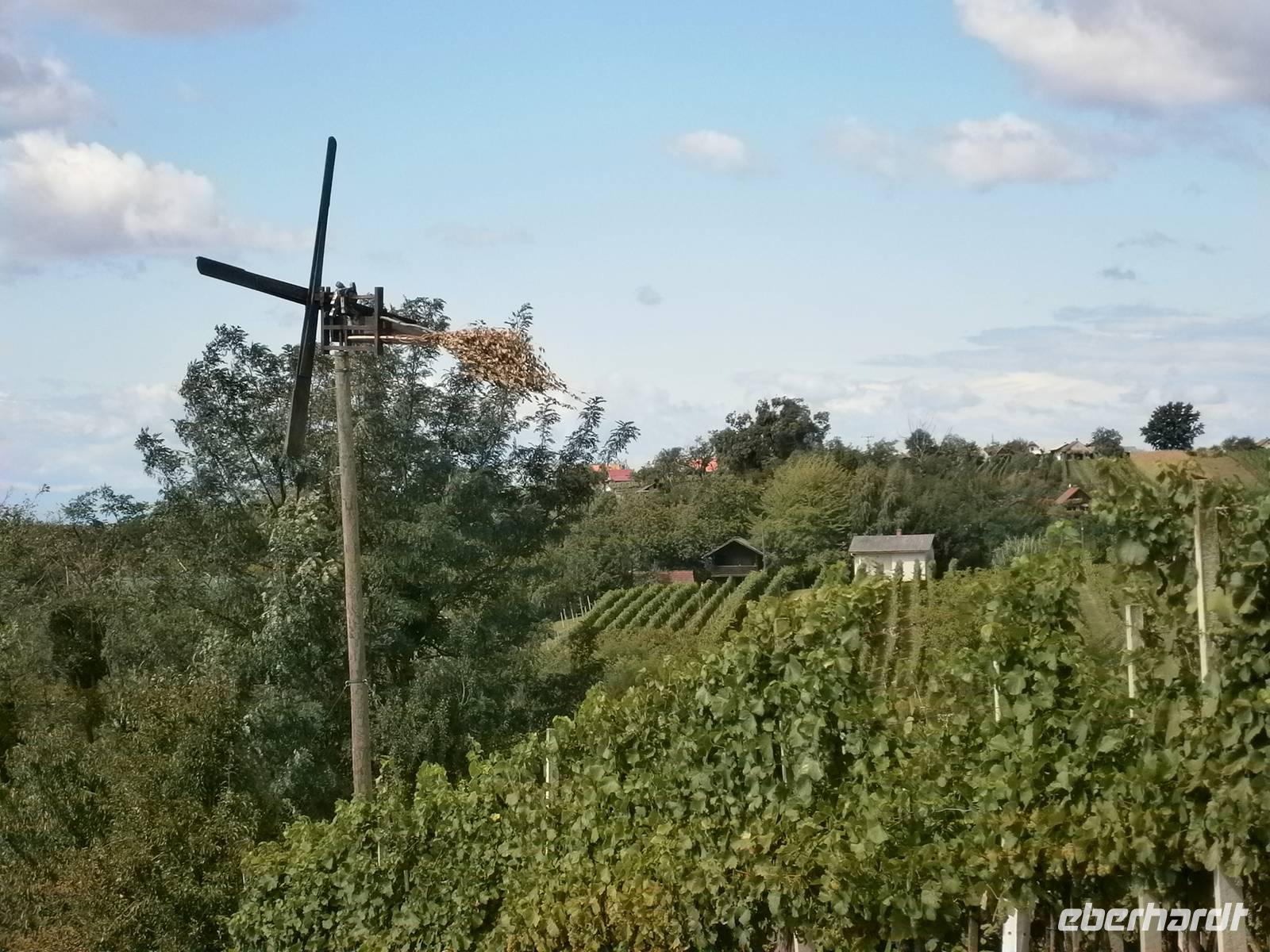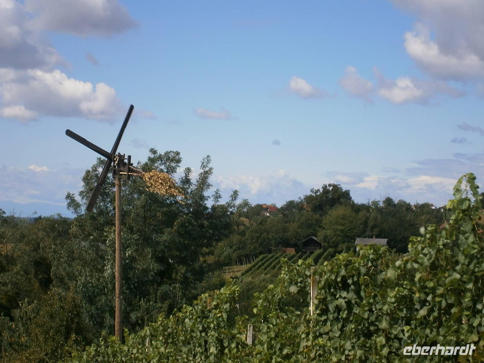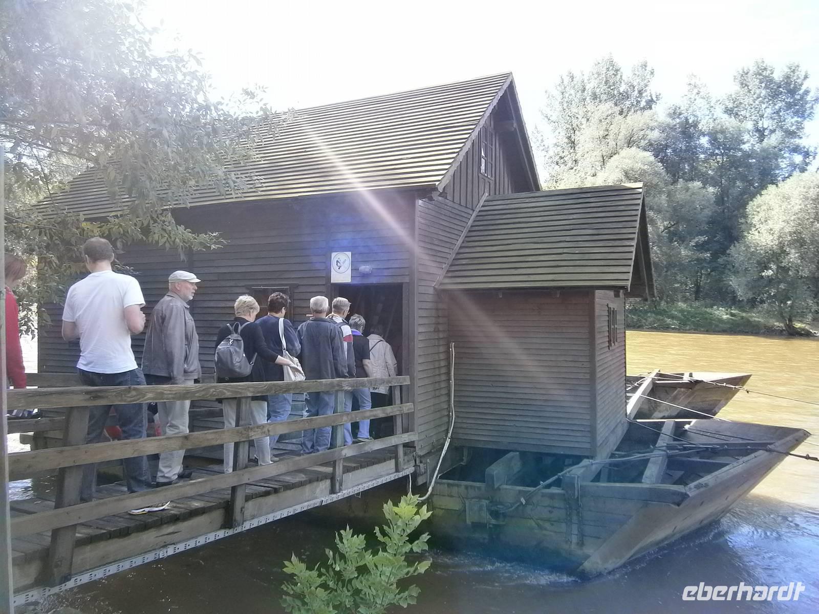 Das Programm für den heutigen Tag war vielseitig und interessant. Zuerst fuhren wir an die Mur und besuchten die Liebesinsel. Wir unternahmen einen Rundgang auf der Insel in Ižakovci, die von einem Flussarm der Mur umgeben ist. Wir besuchten das Museum und sahen einen Film über die harte Arbeit der Menschen. Anschließend besuchten wir die funktionstüchtige schwimmende Mühle. Die Mühle an der Mur verzaubert mit Natur und Brauchtum. Die Schiffsmühle in Ižakovci wurde als authentische Schiffsmühle in Slowenien neu erbaut und schwimmt auf zwei Booten. In unmittelbarer Nähe befindet sich auch eine Murfähre, welche Prekmurje und Prlekija verbindet. Natürlich mußten wir mit der Fähre über die Mur fahren. Zum Mittagessen waren wir im Weingut Urisk eingeladen. Herr Smako erwartete uns schon. Wir mußten uns das Mittagessen erst erarbeiten, den das Weingut liegt auf einem Berg mitten in den Weinbergen. Im gastlichen Weingut war der Tisch schon mit Schinken und Käse aus der Region gedeckt, dazu gab es eigenen Wein. Wir ließen es uns schmecken. Anschließend besuchten wir eine Imkerei. Wir besichtigten das kleine Museum, in einem Bienenhaus aus dem 19. Jahrhundert wird das reiche Kulturerbe dargestellt. Wir erfuhren interessantes und wissenswertes über die Imkerei, die Bienenvölker und die Honigherstellung. Natürlich probieren wir die verschiedenen Sorten Honig und den hervorragenden Honiglikör. Anschließend wartet eine der schönsten Sektkellereien von Slowenien auf unseren Besuch. Wir besuchten den Weinkeller. Ein normaler Keller, doch plötzlich hörten wir es rauschen. Das Licht ging an und wir standen direkt vor einem Wasserfall. Ein Glas Sekt passte zu dieser Überraschung. Nach einem kleinen Rundgang probieren wir noch zwei Weine.
