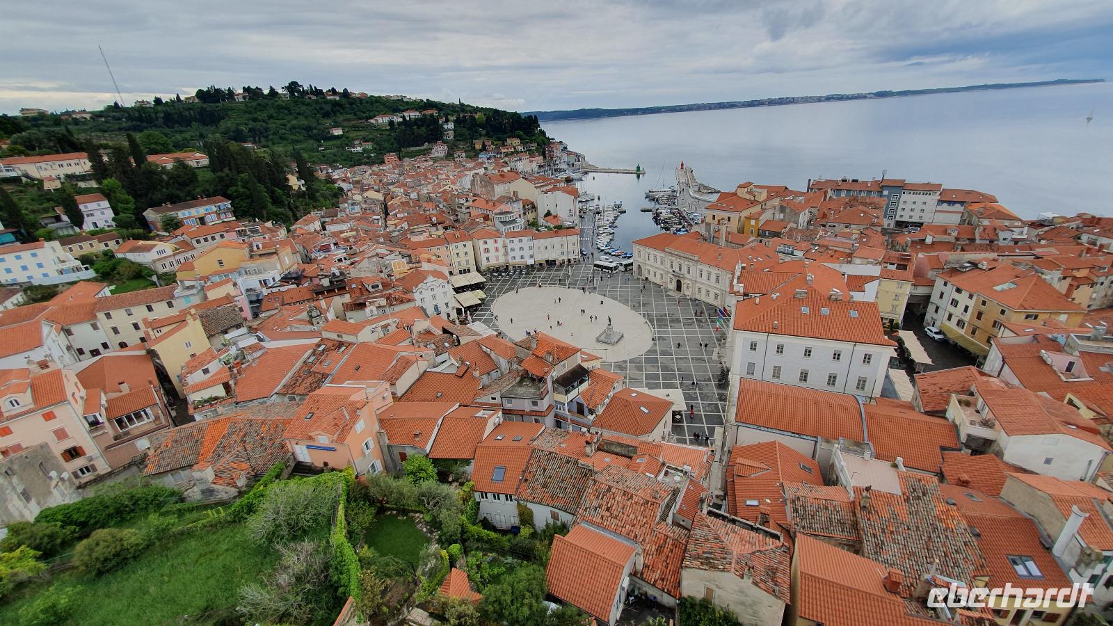 Ein Tag zur freien Verfügung - geschlossen begab man sich mit dem Linienbus nach Piran - eine wundersame kleine Stadt zum Verlieben. Tartini Platz, die verwinkelten Gässchen, die St.Jurij Kirche. Übrigens, die Staute von St.Jurij auf dem Kirchenturm dreht sich abhängig vom Wetter. Schaut er gen Triest, wir das Wetter schön. In die andere Richtung bedeutet nicht so toll. Und Jurij steht bei unserem Besuch in andere Richtung. Allerdings, Sie ahnen ja schon: wenn die Engel reisen... Uns streichelt die Sonne und unsere Füße erleben ein salziges Bad. Ganz Mutige, baden in ca. 15 Grad „warmen" Wasser - Respekt!
