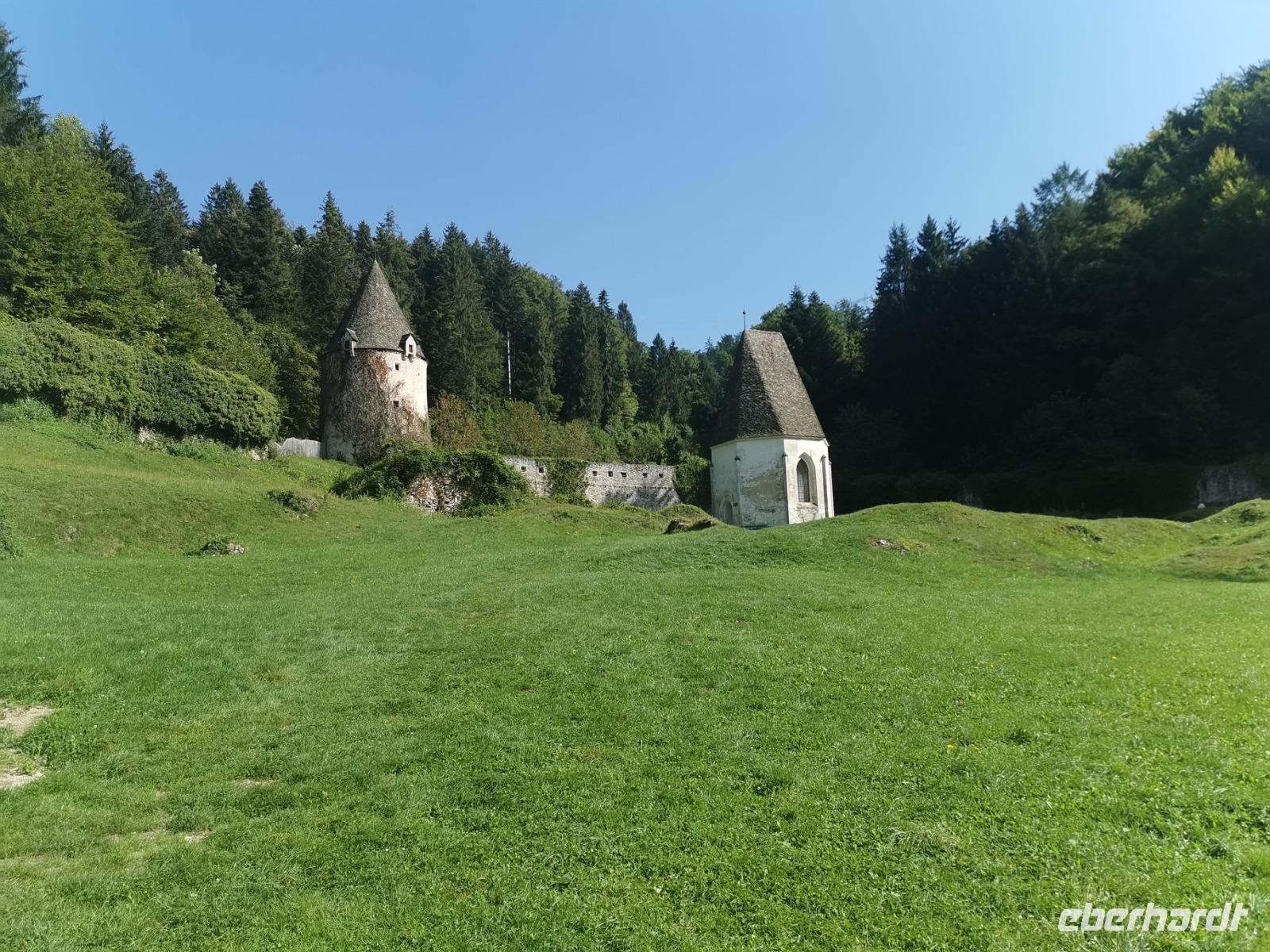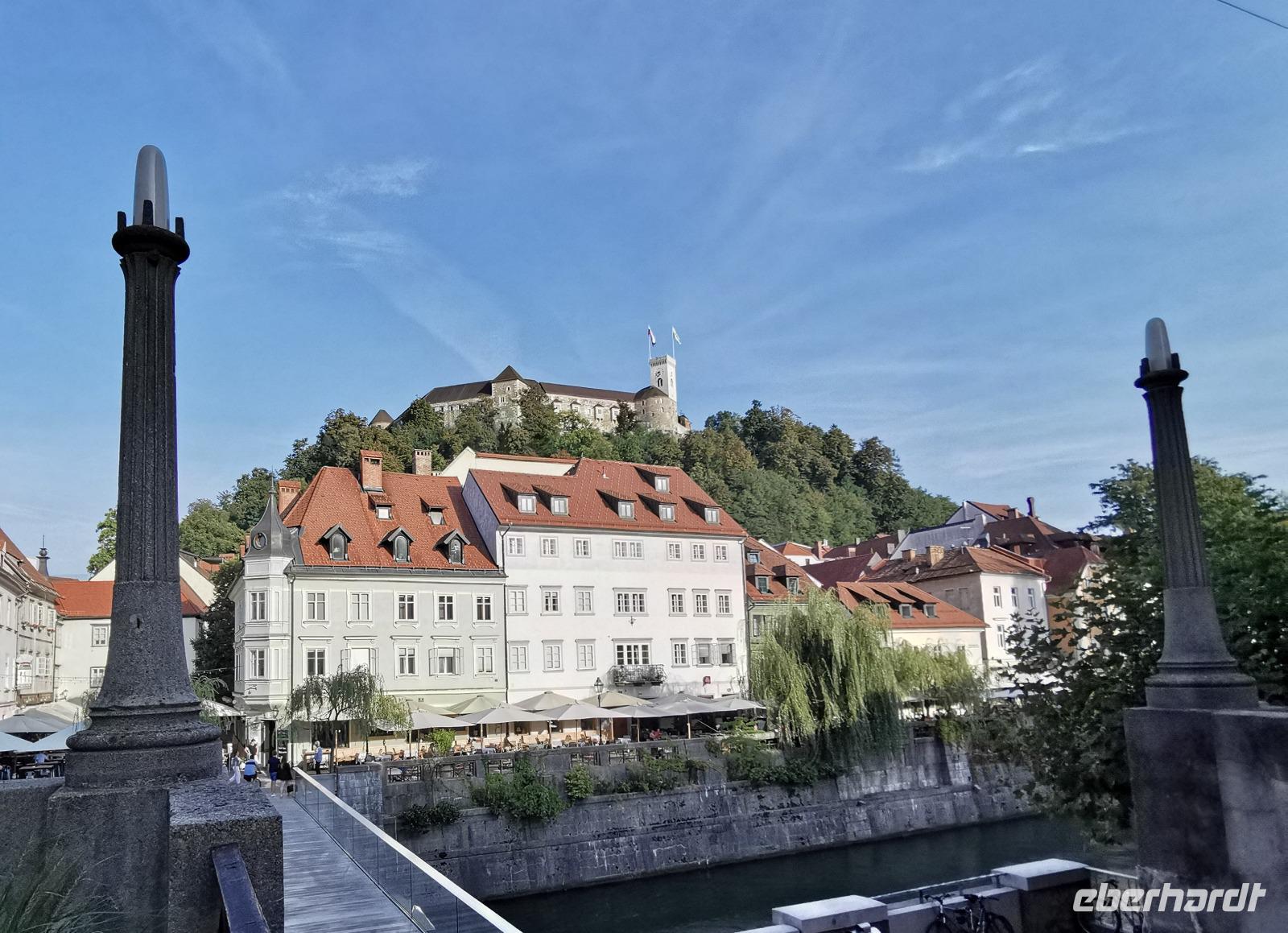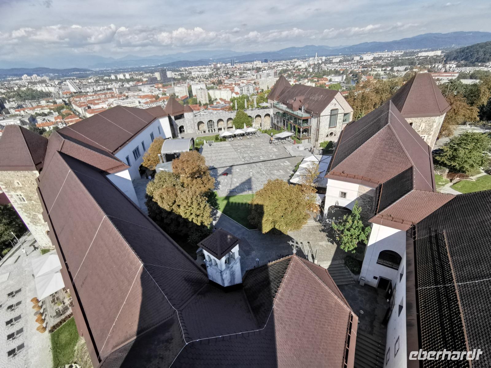 Wir liefen vom Restaurant aus zur Seilbahnstation, um auf den Hausberg mit der imposanten Burg zu fahren. Diese mittelalterliche Festungsanlage, auf deutsch die Burg von Laibach, ist das Wahrzeichen der Hauptstadt und liegt 376 Meter hoch. Die heute noch zu besichtigenden ältesten Gebäudeteile der Burg sind die 1489 geweihte Kapelle St. Georg und der 1496 errichtete Turm.