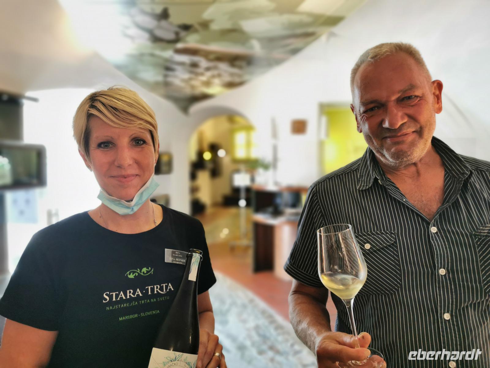 Am Nachmittag trafen wir uns an der Alten Rebe wieder und verkosteten dort einige der köstlichen slowenischen Weine. Wir durften drei Weine kennen lernen, von denen den meisten Gästen der zweite Wein am besten schmeckte, ein Ranina, der autochthon in Slowenien ist. Dazu gab es Brot mit dem regionalen Kürbiskernöl und Salz aus Piran, das kam bei den Gästen sehr gut an. Danach bummelten wir langsam zum Hotel zurück, wo schon das Abendessen auf uns wartete.
