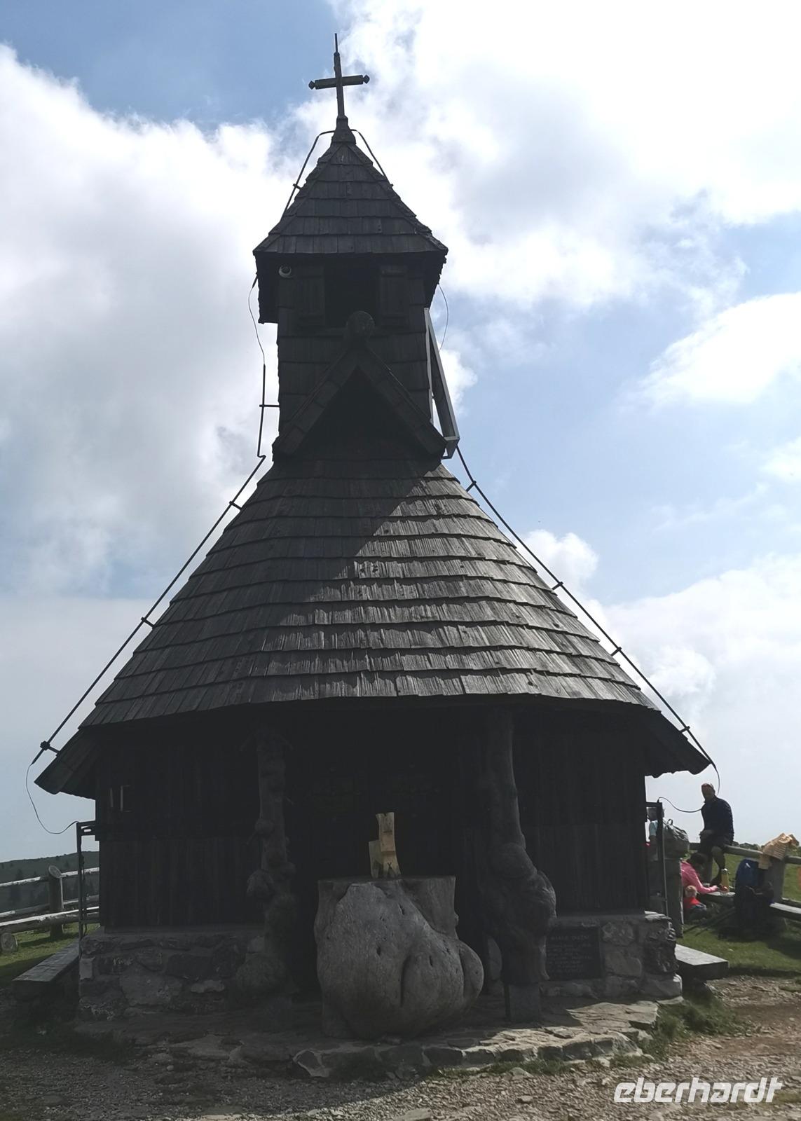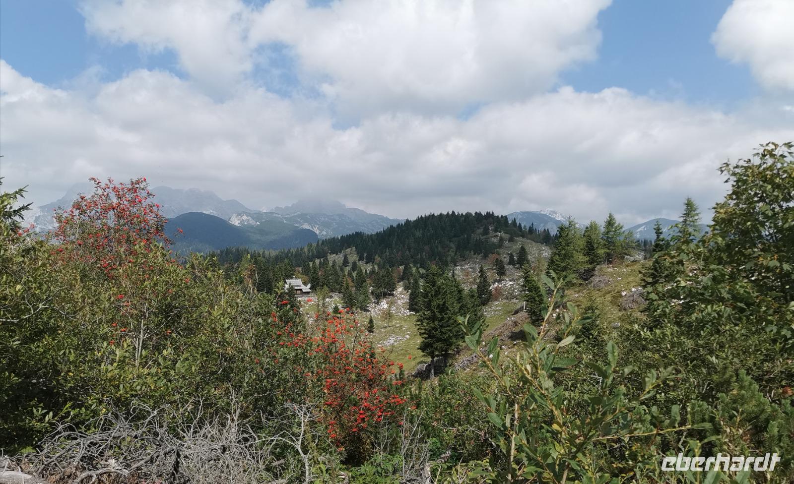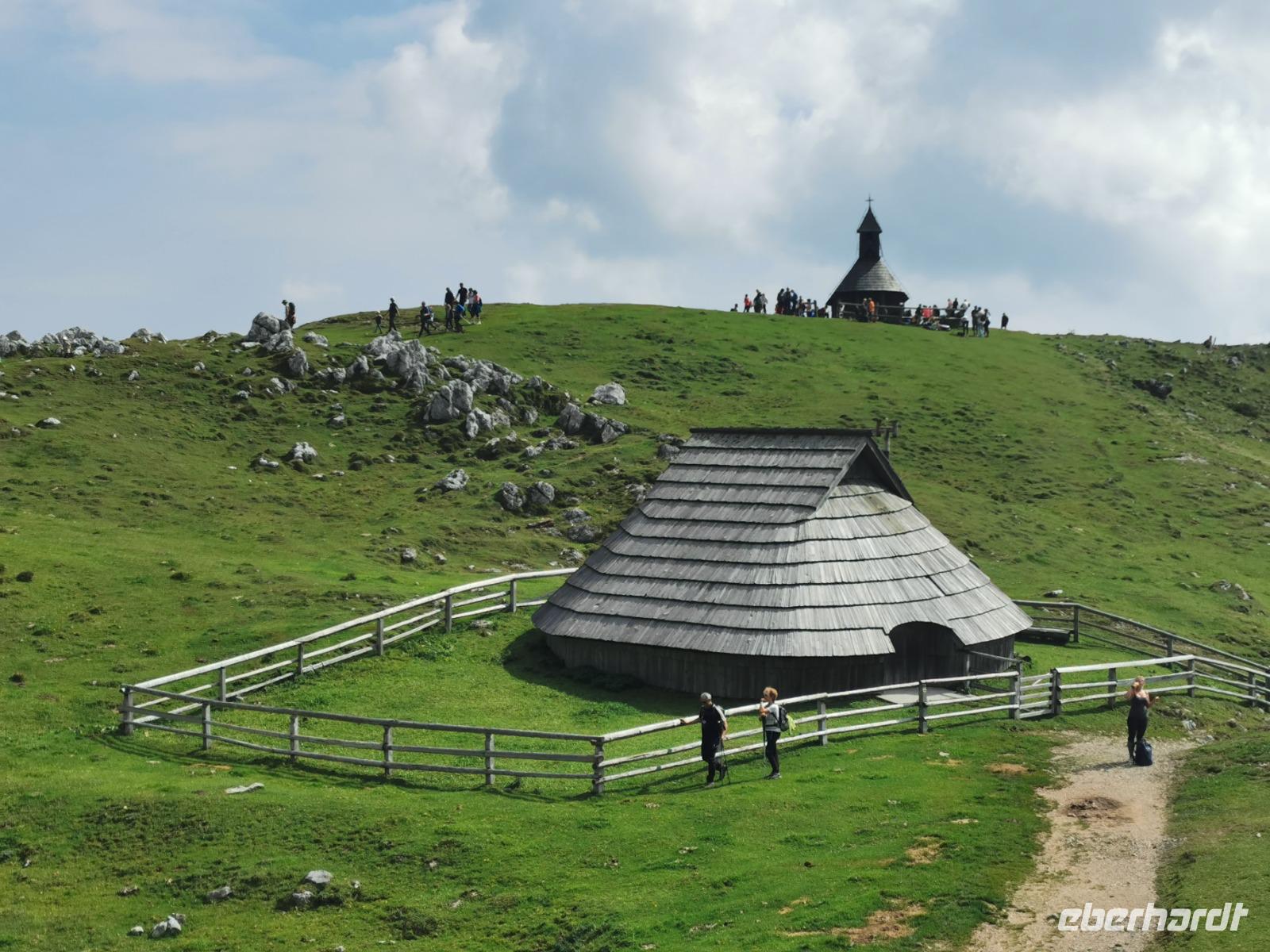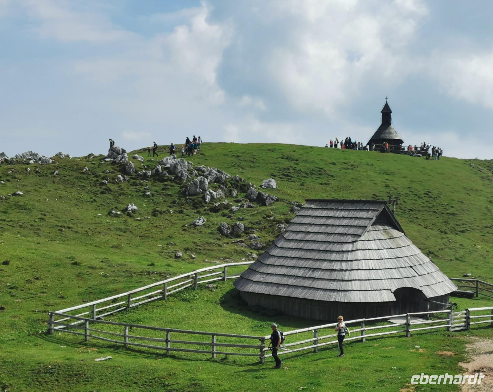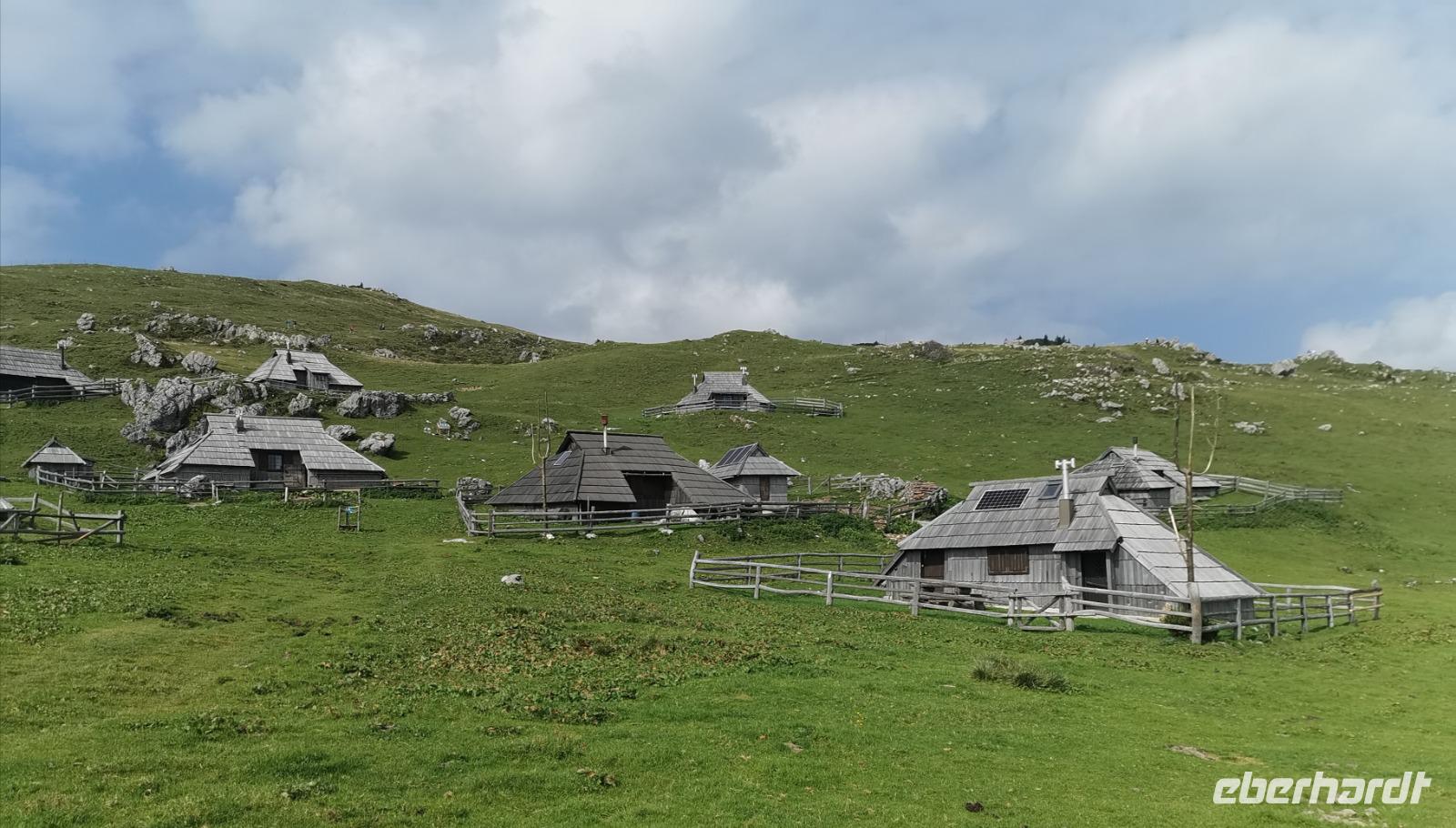 Die Hütten auf der Hochalm stammten eigentlich aus dem 16. Jahrhundert und hatten ovale Grundrisse. Darüber waren fensterlose schindelgedeckte einstöckige Holzgebäude mit einem mittigen Schornstein. In der Hüttenmitte befand sich traditionsgemäß die Küche, wo der luftgetrocknete Käse hergestellt wurde. Oberhalb der Küche war saisonal der Schlafraum des Hirten. Diese Hütten waren nur von Juni bis September vom männlichen Familienmitglied bewohnt. Sie zogen am Berg auf und ab, je nachdem, wo das Vieh das beste Futter fand. Im September trieb man die Tiere wieder in die Täler und lebte dort in festen Häusern. Leider wurden sowohl diese schönen alten Hütten als auch die 1938 im gleichen Stil nach Plänen des Architekten Plecnik errichtete Kirche während des 2. Weltkrieges von den deutschen Besatzern zerstört, so daß keine Originalbauten mehr erhalten geblieben sind.