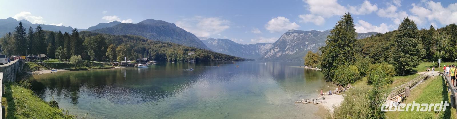 Als wir zum Ufer zurückkehren, wartet Andreas mit dem Bus bereits auf uns und schon ging es weiter zu unserem nächsten Ziel, dem Bohijnsee. Dieser See ist mit seiner Fläche von etwas mehr als 3 km² recht groß, hat glasklares Wasser, liegt auf 525 Metern Höhe und ist bis zu 45 Meter tief. Als Badeparadies gehört er ebenfalls zum Triglav-Nationalpark. Also ein optimales Plätzchen für einen Fotostop mit Traumblick und eine Mittagspause.