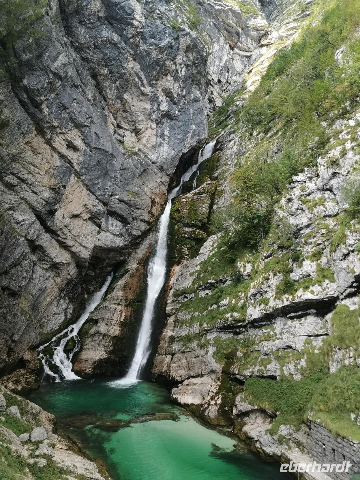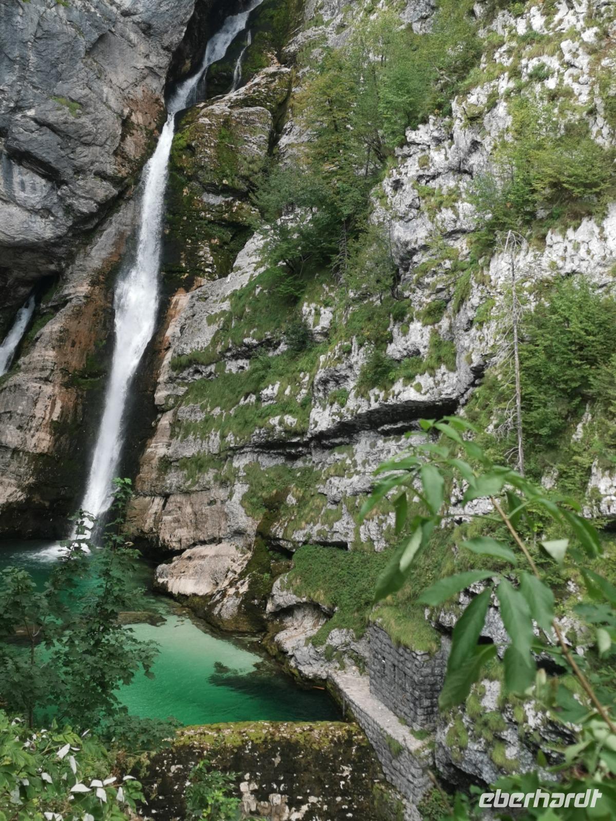 Nach der Stärkung gehts weiter durch den Wald zum Slap Savica, einem herrlichen Wasserfall im Bohinjtal. Dieser beeindruckende Fall liegt mitten im Triglav Nationalpark und fließt zuerst 38 Meter über Felsen, um dann in einem Winkel von 50 Grad 51 Meter abwärts zu stürzen. Dort fällt er in einen smaragdgrünen Stausee. Bis man diesen tollen Anblick allerdings genießen kann, muß man 531 Stufen und sich steil nach oben schlängelnde Treppen beschreiten, aber alle sind wohlbehalten oben angekommen und tolle Fotos entstehen.
