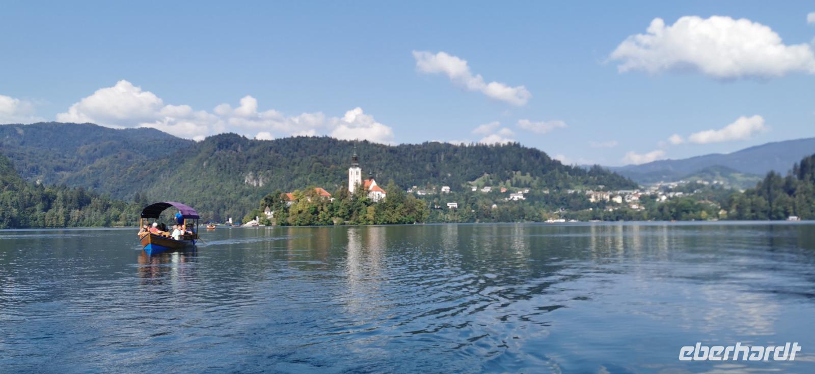 Heute Morgen genießen wir eine kurze Fahrt entlang des traumhaft schönen Bleder Sees hin zu den Anlegern für die hölzernen Pletna-Boote. Dort angekommen lassen wir uns von Robert zur Insel mit der darauf befindlichen Marienkirche übersetzen und natürlich hat man vom Boot aus den besten Blick auf die Umgebung des Sees und die sich rundum hoch erhebenden Gipfel der Julischen Alpen.