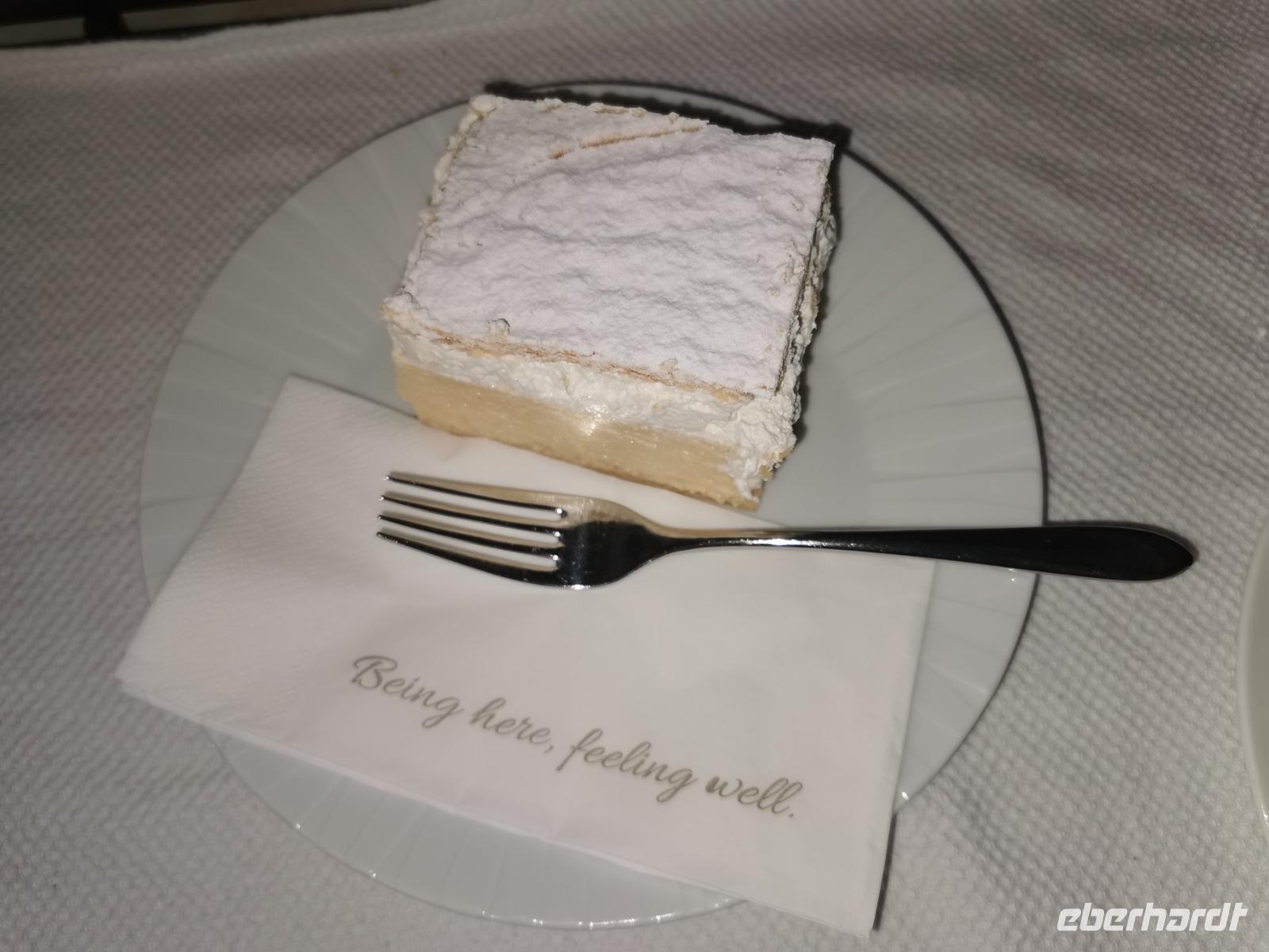 Am Nachmittag gibt es noch eine wunderschöne Überraschung. In Bled wurde eine Spezialität erfunden: Die Bleder Schnitte. Dieses herrlich fluffige kalorienhaltige Kremschnittchen wird uns von unserem Astoria Hotel am Nachmittag auf der Außenterrasse serviert und wir schlemmen und erholen uns vom anstrengenden Wasserfallaufstieg. Danach genießen wir im Luftkurort unsere wohl verdiente Freizeit und treffen uns zum Abendessen alle wieder.