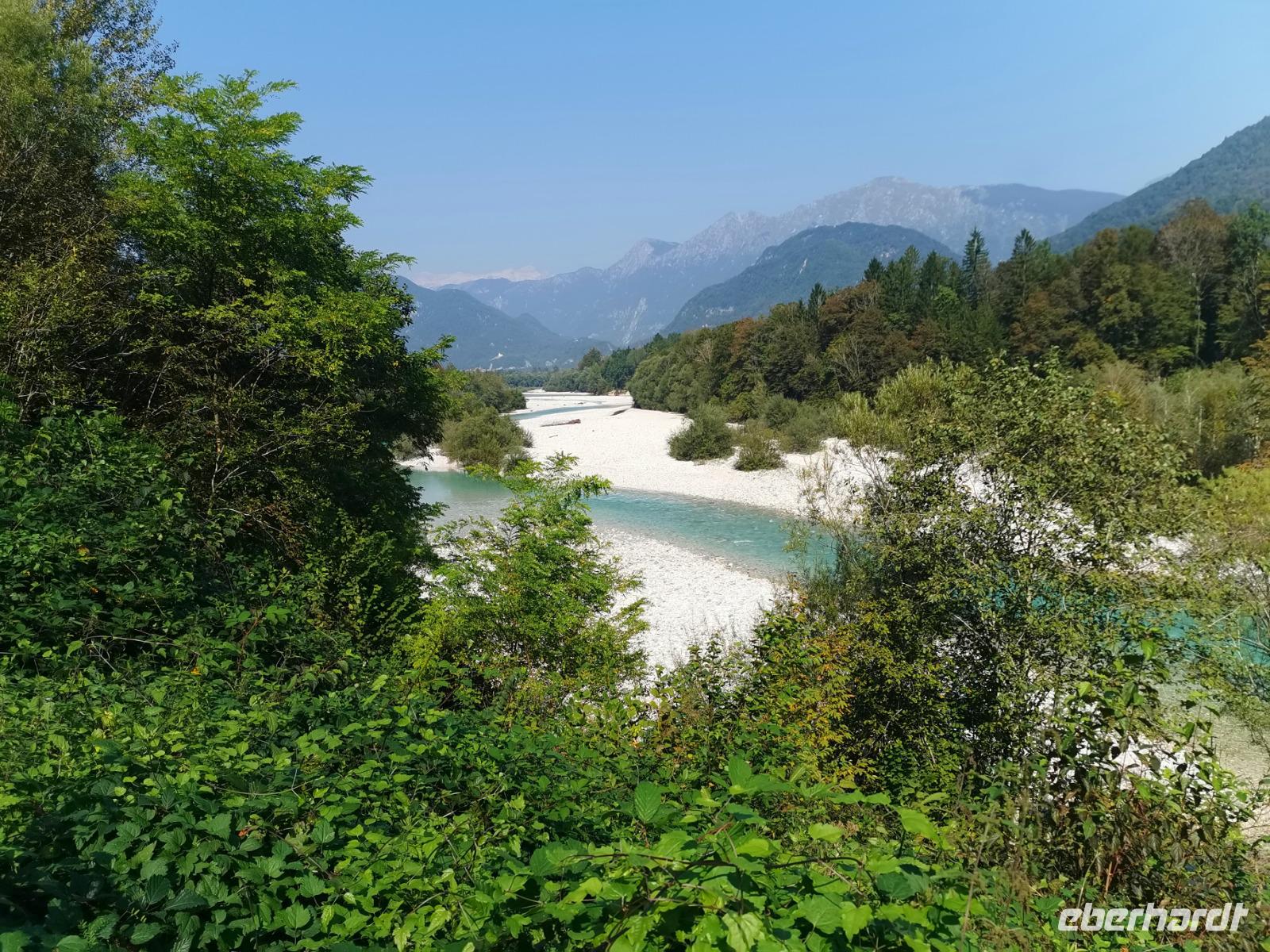 Durch dieses paradiesische Tal fließt der gleichnamige Fluß. Er zählt mit seiner blaugrünen Farbe zu einem der schönsten Flüsse in ganz Europa. Die Soca entspringt am Fuß des Travnikberges in den julischen Alpen und fließt 140 Kilometer lang bis in den Golf von Triest. Der Verlauf dieses smaragdgrünen Flusses wird von kleinern und größeren Wasserfällen, Stromschnellen und engen Felsschluchten geprägt. Das ganze Tal ist ein Muß für Naturliebhaber und Wassersportler. So sehen wir unterwegs etliche Kajakfahrer und Raftingboote auf dem Wasser und Badestellen, die sehr einladend aussehen.