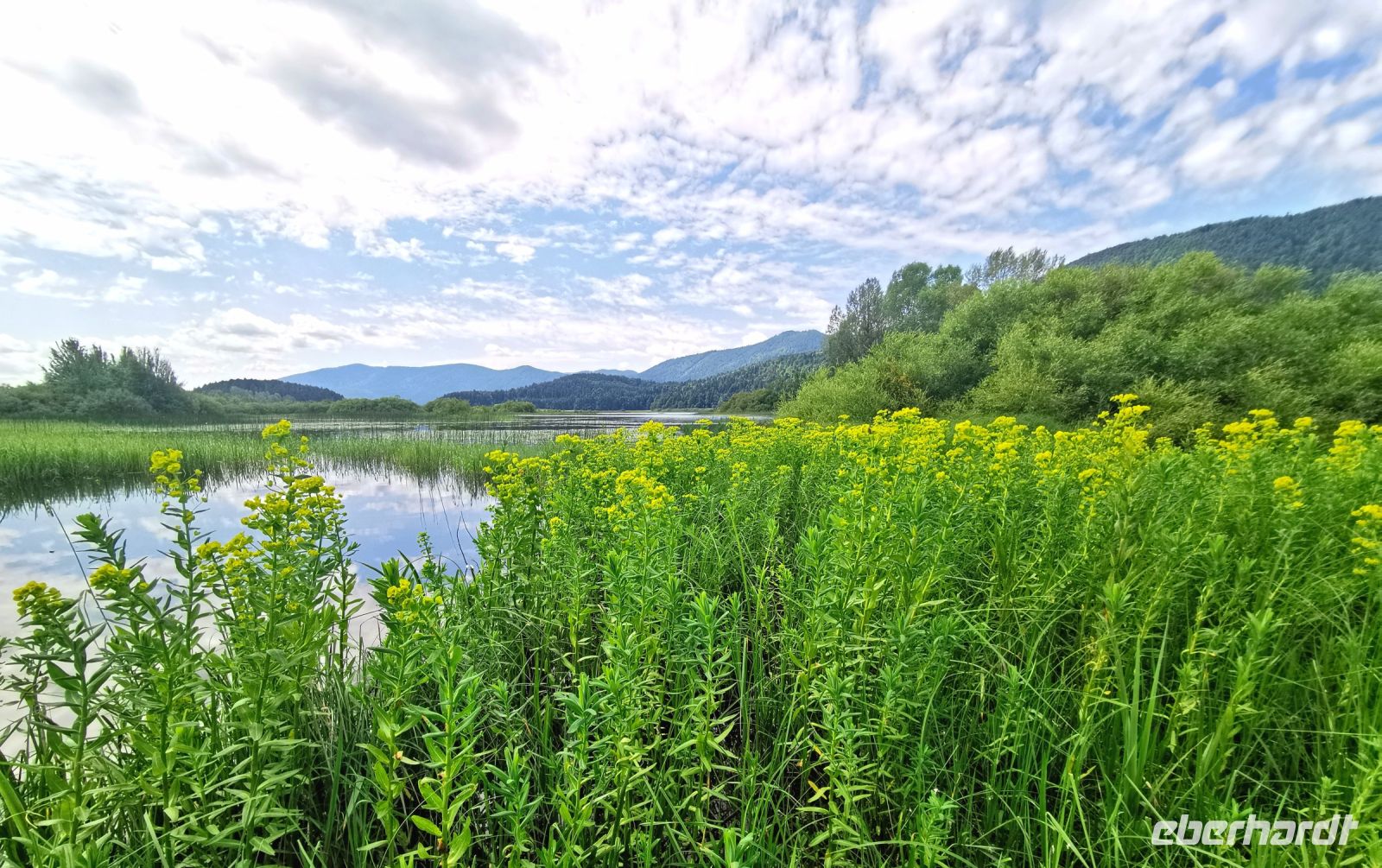 Wir laufen ein Stück am See entlang, die Landschaft erinnert sehr an Kanada, auf den Wiesen wachsen Wildblumen, wir können einen kleinen Frosch beobachten, der versucht, den Weg zu überqueren, die Bienen und Maikäfer umschwirren uns.