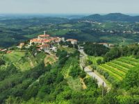 Unsere erste Pause machen wir am Gonjace Lookout Tower. Auf diesen 23 Meter hohen Aussichtsturm steigen wir die 144 Stufen hinauf und es läßt sich kaum beschreiben, wie grandios der Blick von hier oben über die sanften Hügel der Brdaregion ist. Bei gutem Wetter kann man bis zum Triglav blicken. Vor uns liegen unzählige Weinberge, dahinter saftig grüne und bewaldete Hügel und auf jeder Hügelspitze thront ein mittelalterliches Dörfchen. Wir sehen ein Panorama in allen vier Himmelsrichtungen, die Karnischen und die Julischen Alpen, die Dolomiten, Friaul, den Golf von Triest, den Karst, das Vipavatal und den Hoch- und Schwarzwald Trnovski gozd. Als wir gerade vom Turm herunter kommen, fährt ein Konvoi mit lauter Oldtimern auf dem Kreisverkehr laut hupend seine Runden, so sieht es in Slowenien aus, wenn die Senioren einen Ausflug machen.