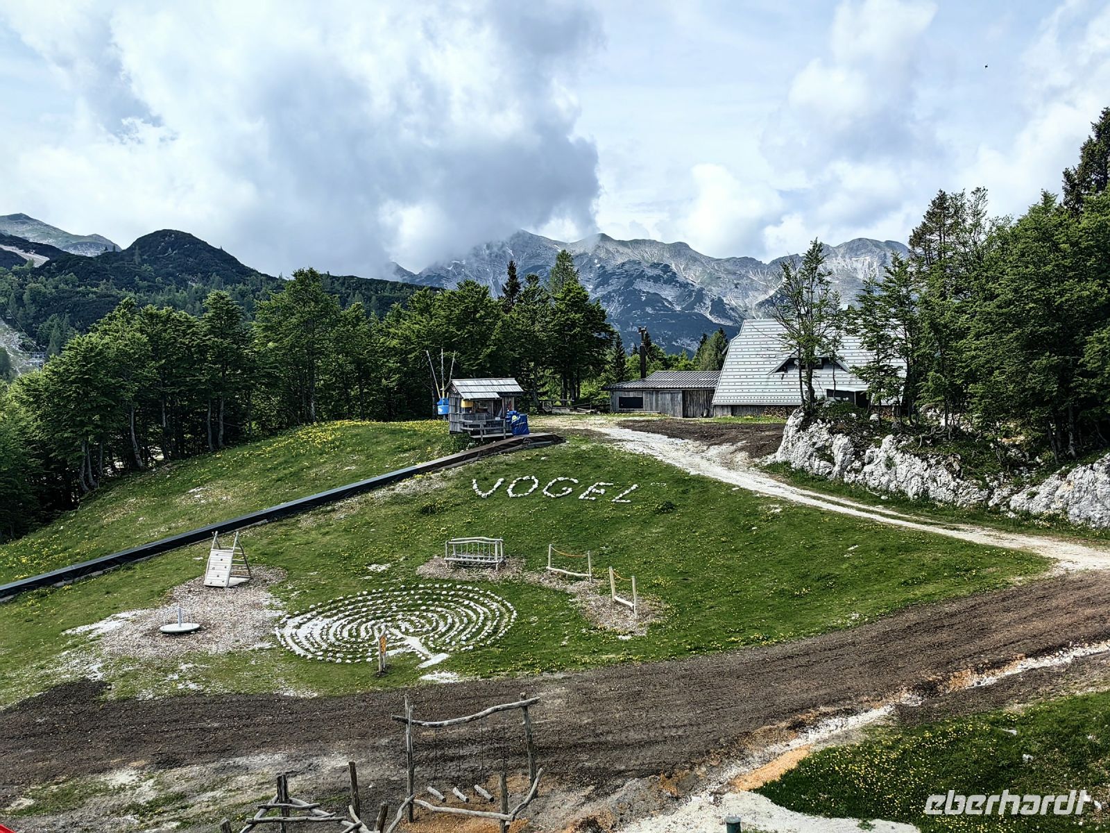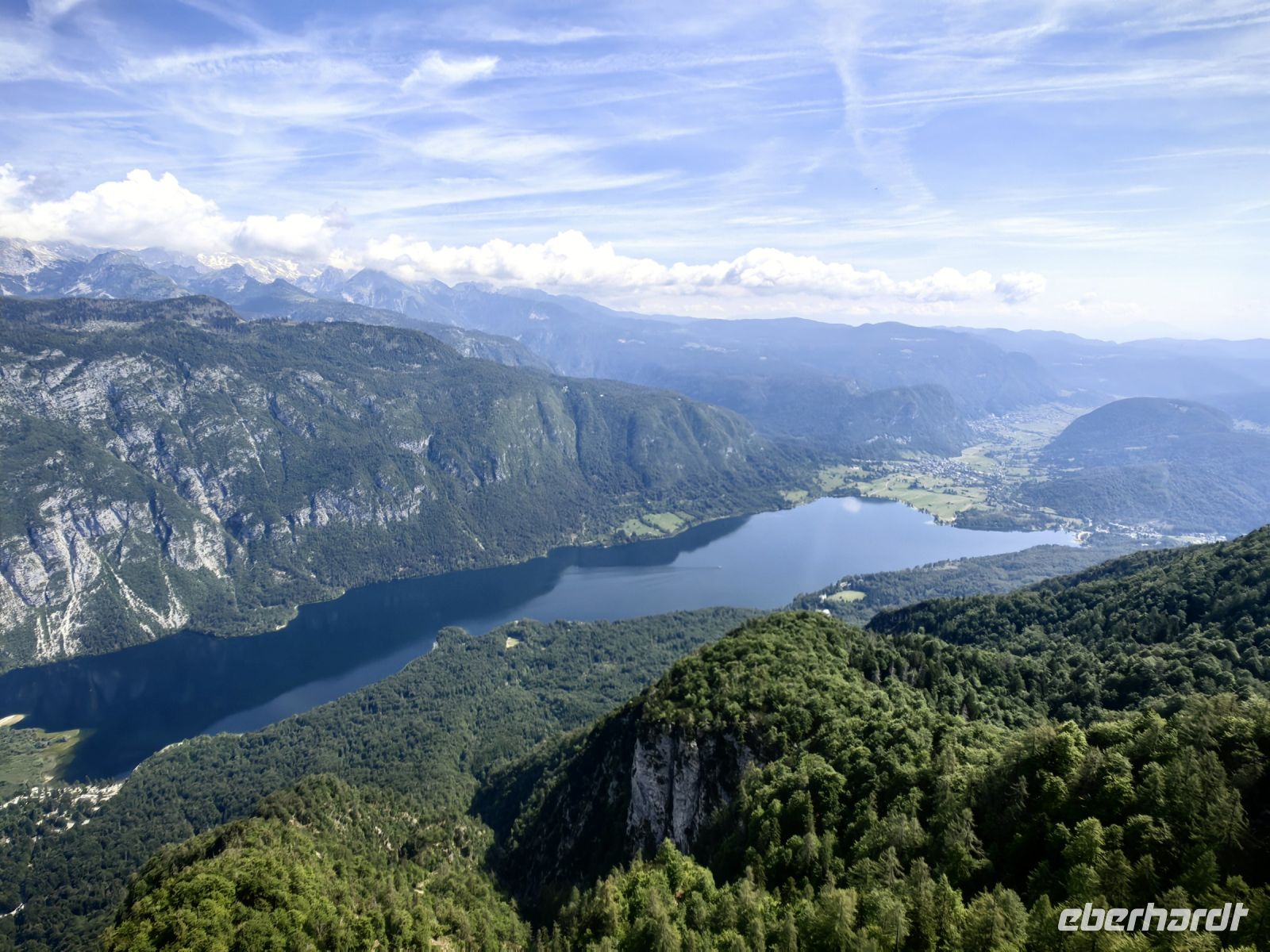Um diese spektakuläre Aussicht so richtig genießen zu können, machen wir mit der Seilbahn einen Ausflug zum Vogelplateau. Hier oben leben einige Senner während der Sommermonate auf der Hochalm und im Winter fahren die Skifahrer auf den längsten Pisten des Landes entlang. Bei gutem Wetter hat man einen fantastischen Blick auf die Julischen Alpen und das Triglavgebirge mit dem höchsten Gipfel, dem Triglav, der mit seiner Höhe von 2.863 Metern und seiner markanten Form alles überragt. Nach nur fünfminütiger Fahrt steil nach oben erreichen wir das Plateau über 1.500 Meter über dem See und der Ausblick verschlägt uns schier den Atem, obwohl sich die höchsten Riesen in den Wolken verstecken.