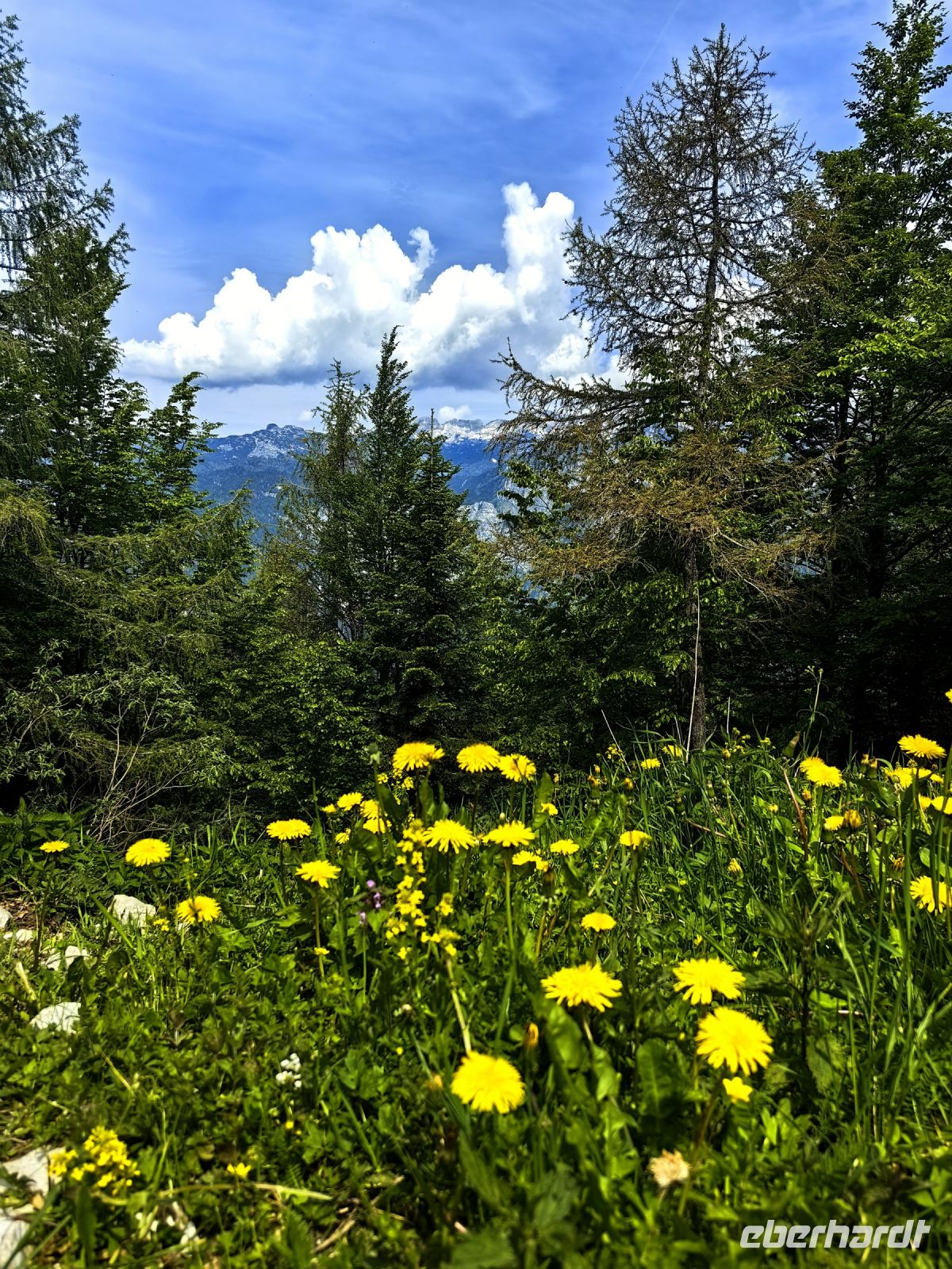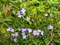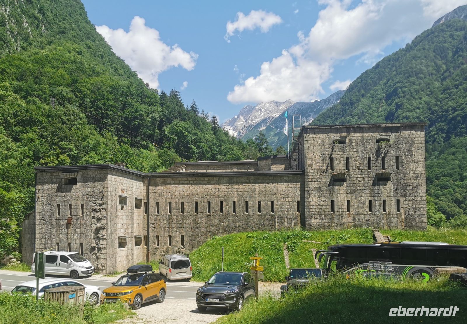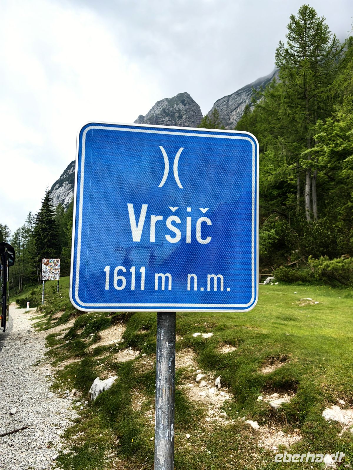 Am Scheitelpunkt auf 1.611 Metern machen wir Fotos am Schild mit der Höhe des Passes, suchen Enzian und bestaunen die reiche Flora auf den Wiesen. Ein Gast ist so ergriffen von der Blumenpracht, daß sie über der Betrachtung ganz unsere Abfahrtszeit vergißt, aber wenig später sind wir alle wieder beisammen und setzten unsere Fahrt hinunter ins Tal der Soca in Richtung Trenta fort. Leider sind die Wolken noch immer nicht weiter gezogen und der König der Julischen Alpen, der Triglav, verbirgt sich weiterhin vor uns.