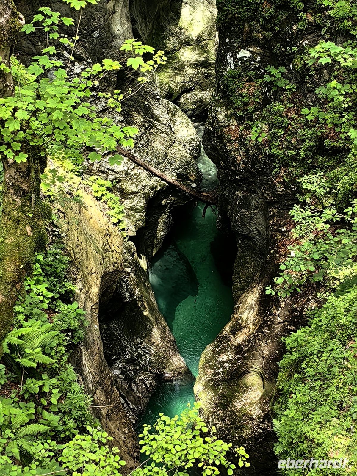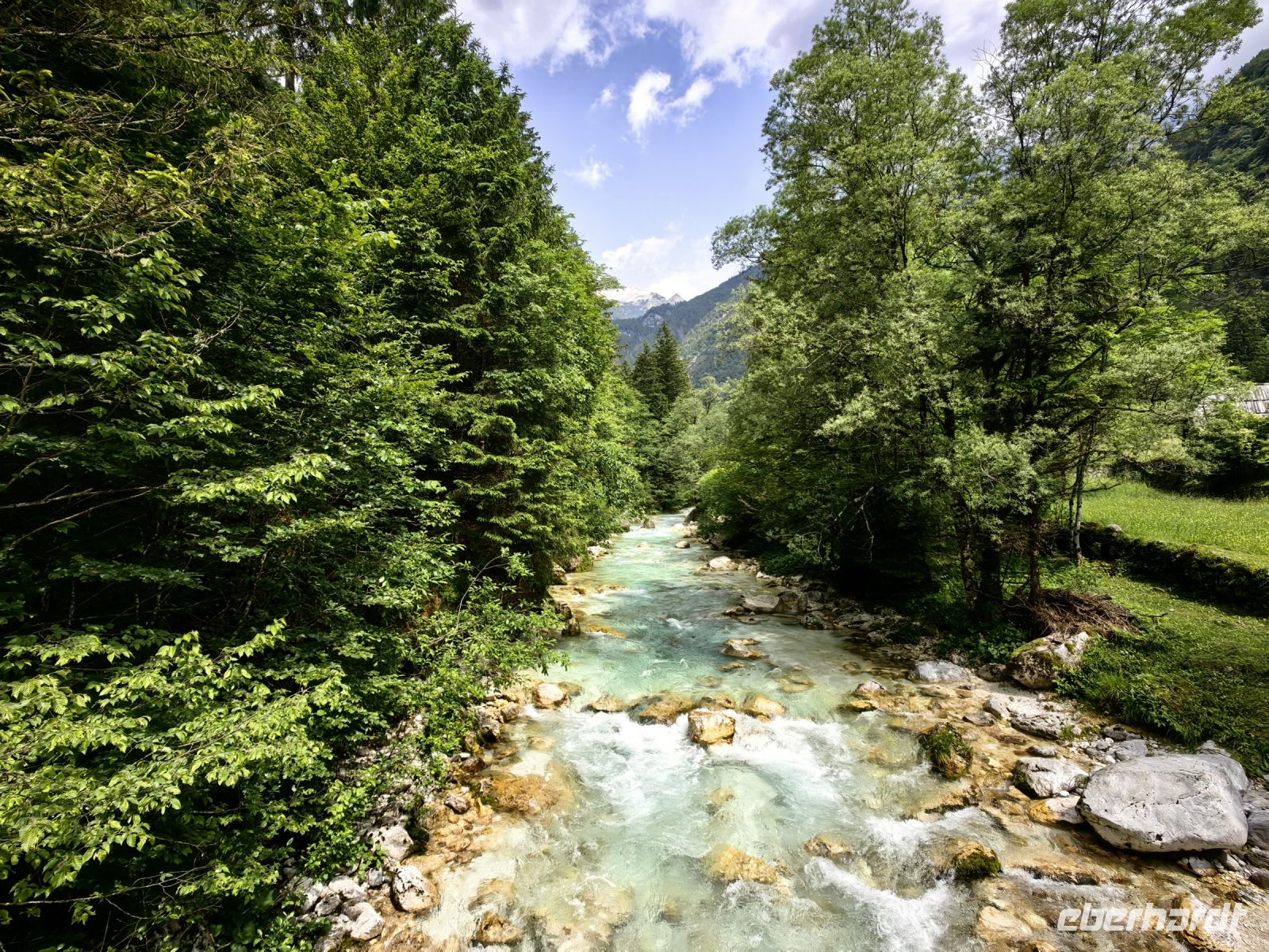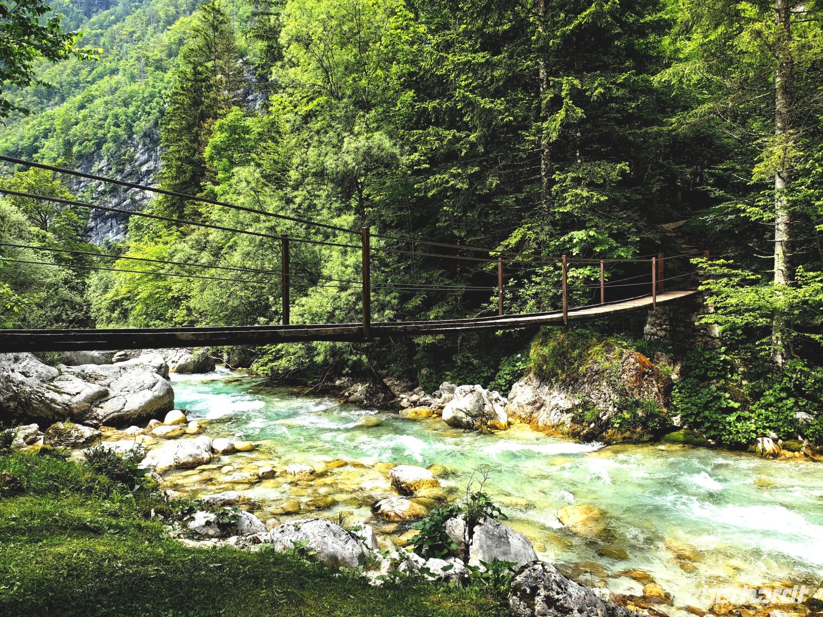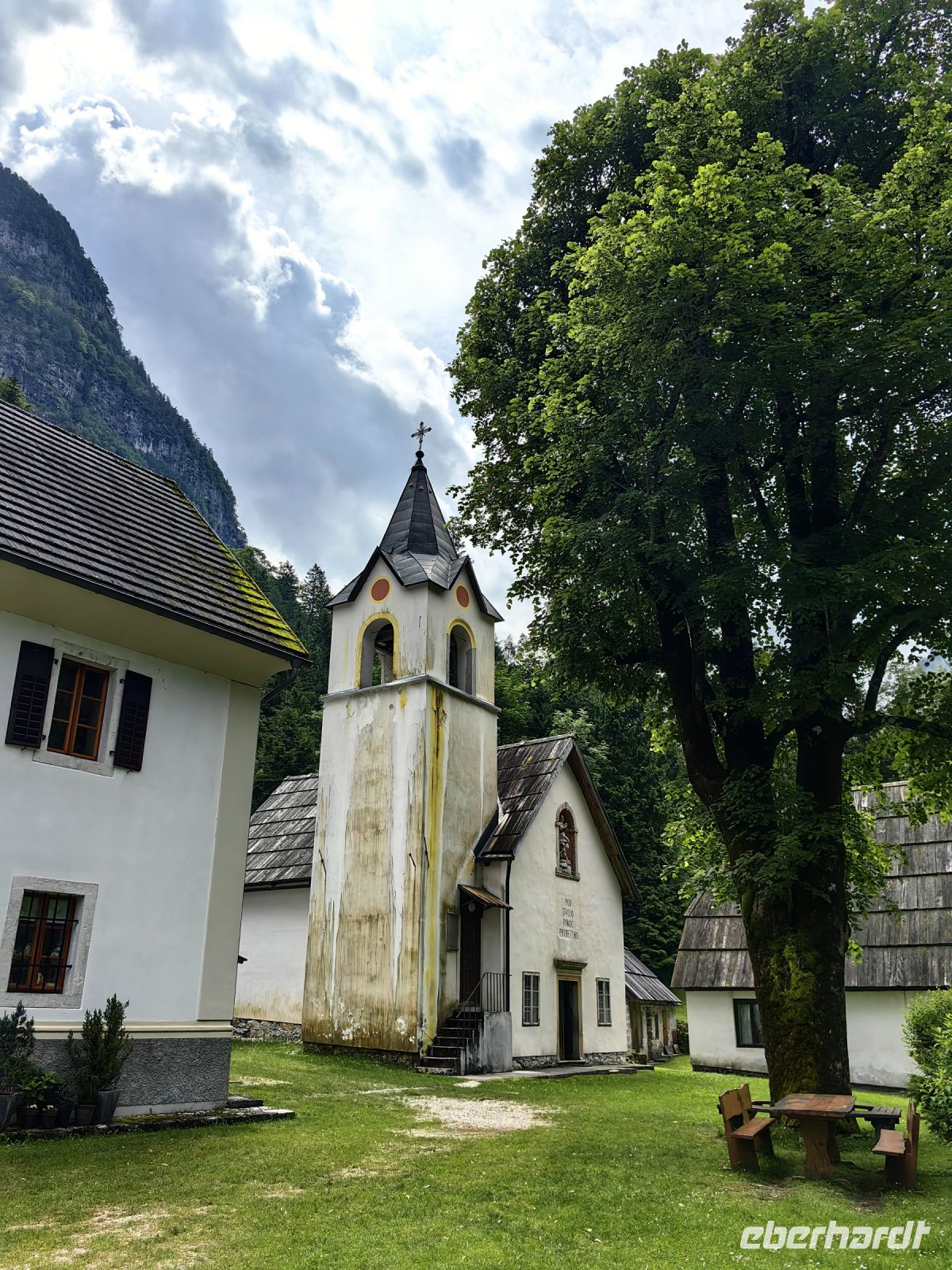 Kurz vor Trenta schauen wir uns die kleine Kirche der heiligen Madonna von Loreto an, die mit den Fresken des berühmten slowenischen Malers Tone Kralj gestaltet ist. Gleich gegenüber der Kirche laufen wir auf einer Hängebrücke über die Soca. Der Verlauf dieses smaragdgrünen Flusses wird von kleineren und größeren Wasserfällen, Stromschnellen und engen Felsschluchten geprägt. Das ganze Tal ist ein Muß für Naturliebhaber und Wassersportler. Allein die Farbe des Flusses begeistert uns und von der Brücke aus kann man ihn gut sehen und fotografieren.