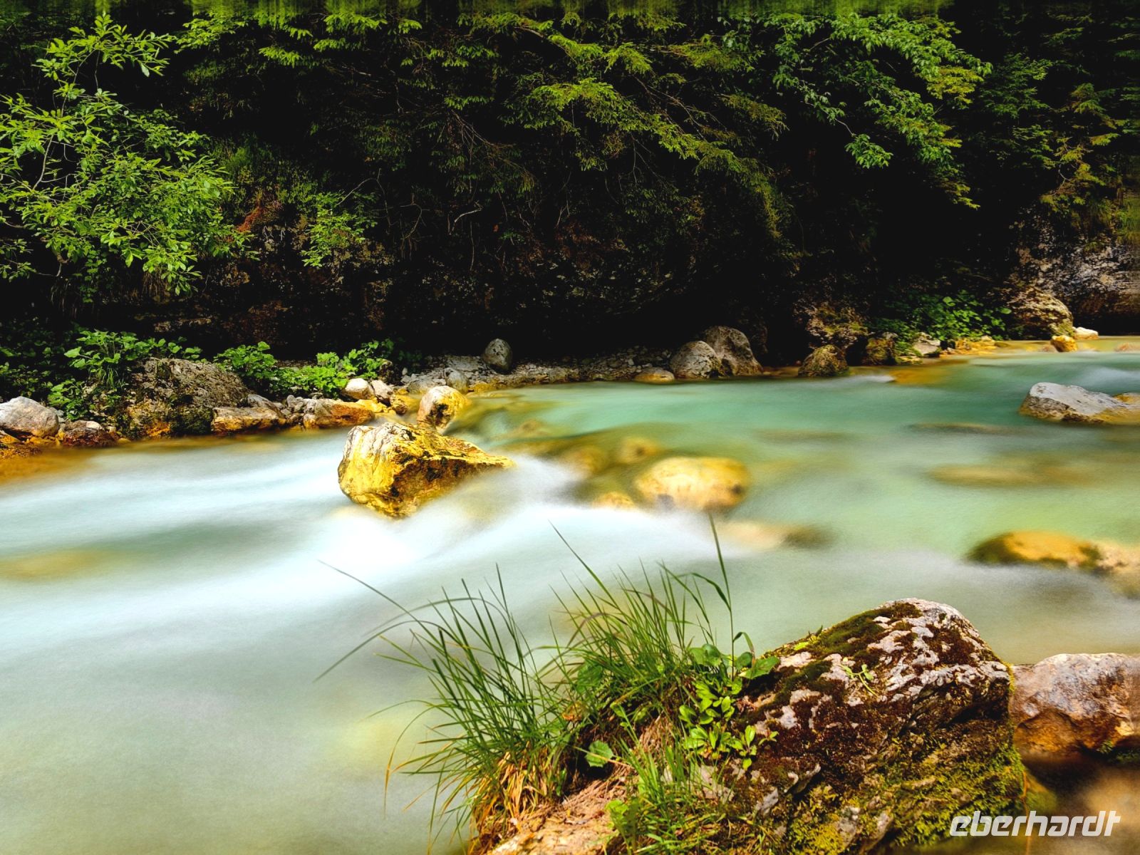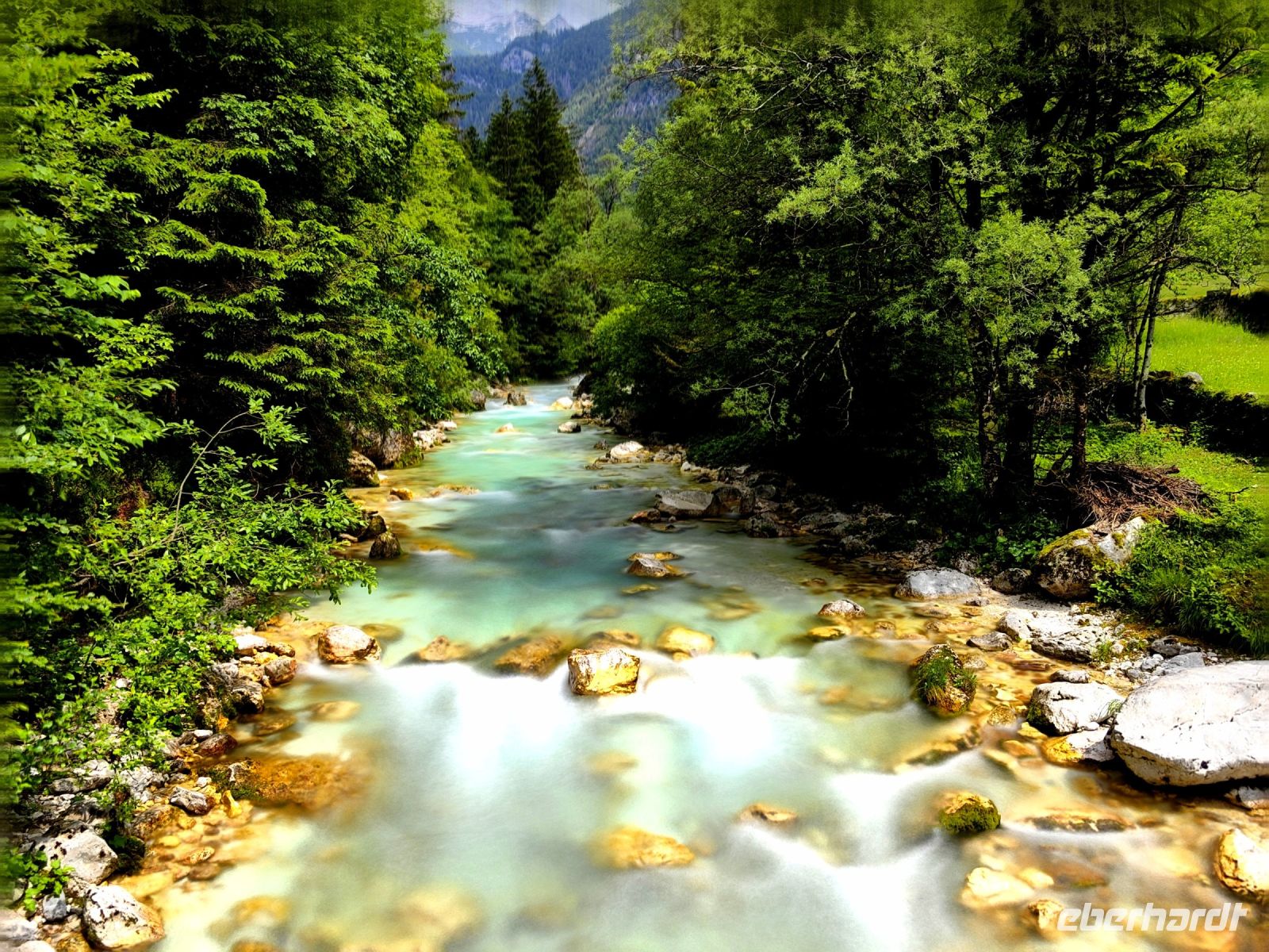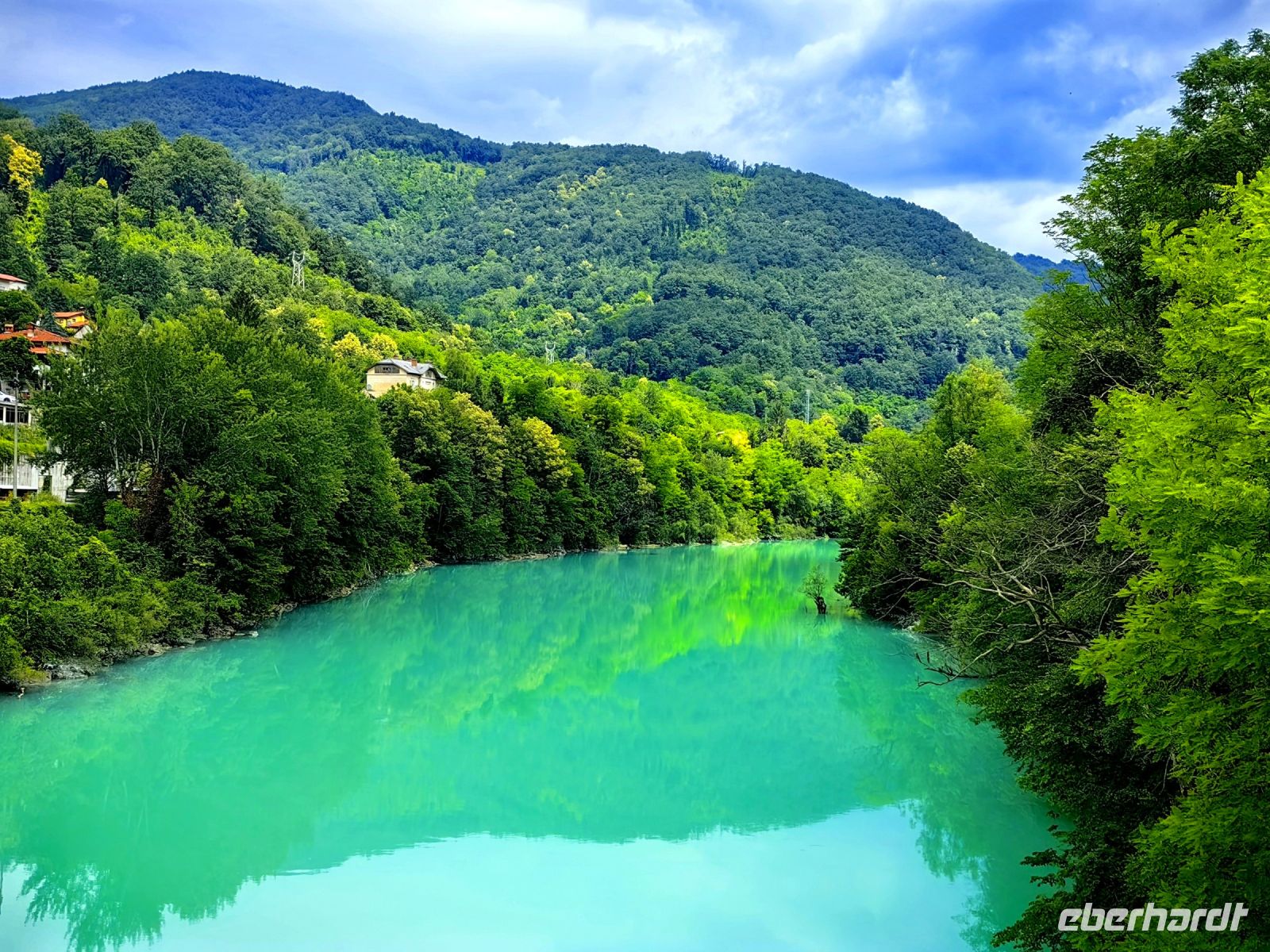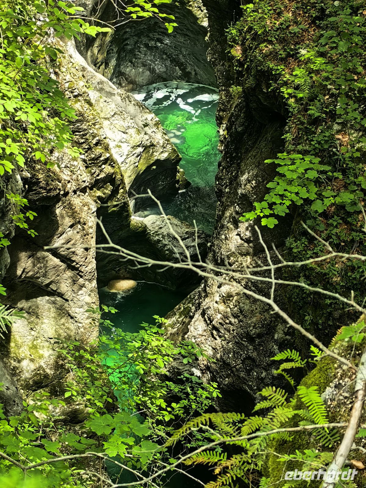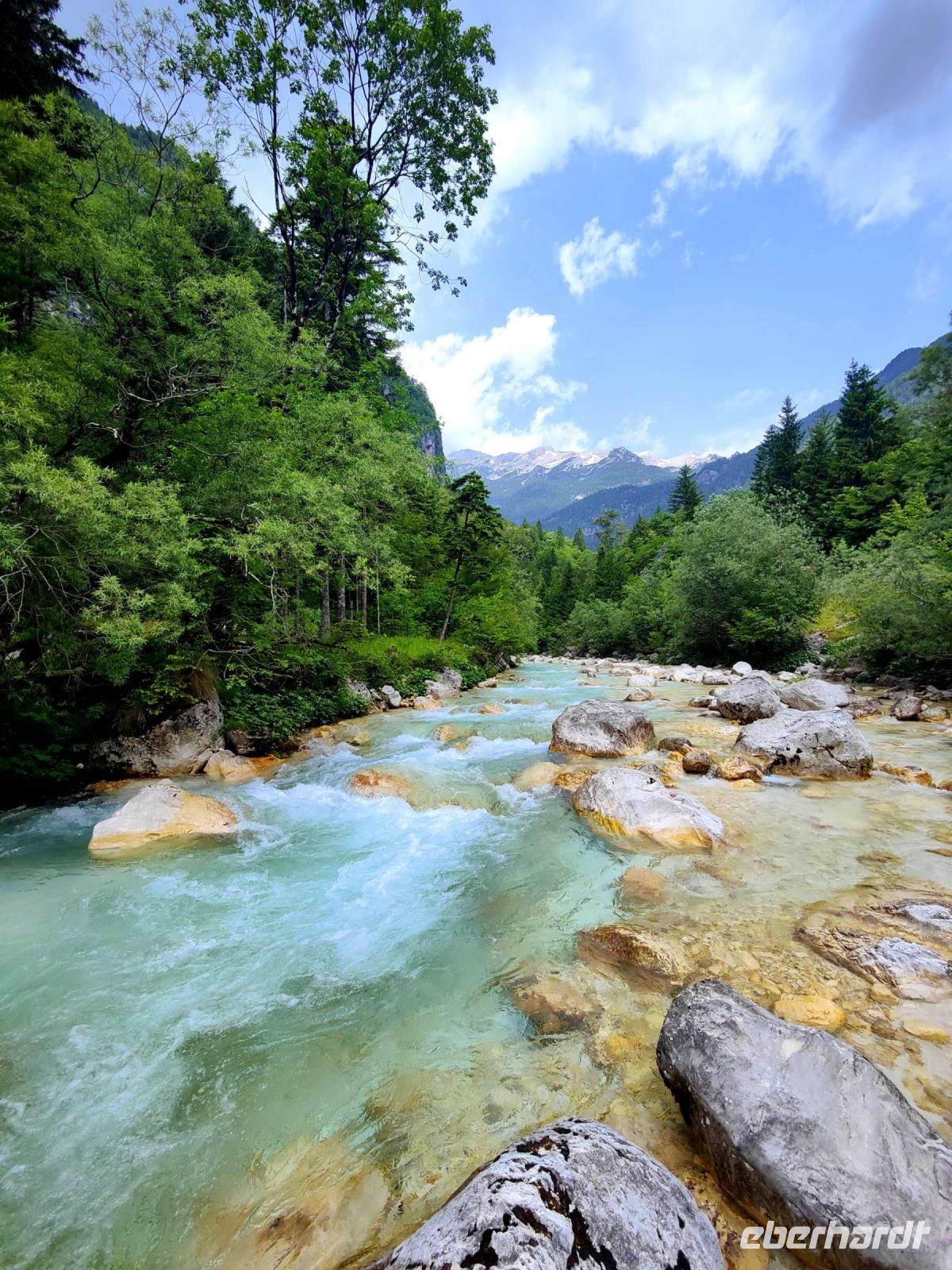 Kurz vor Trenta schauen wir uns die kleine Kirche der heiligen Madonna von Loreto an, die mit den Fresken des berühmten slowenischen Malers Tone Kralj gestaltet ist. Gleich gegenüber der Kirche laufen wir auf einer Hängebrücke über die Soca. Der Verlauf dieses smaragdgrünen Flusses wird von kleineren und größeren Wasserfällen, Stromschnellen und engen Felsschluchten geprägt. Das ganze Tal ist ein Muß für Naturliebhaber und Wassersportler. Allein die Farbe des Flusses begeistert uns und von der Brücke aus kann man ihn gut sehen und fotografieren.