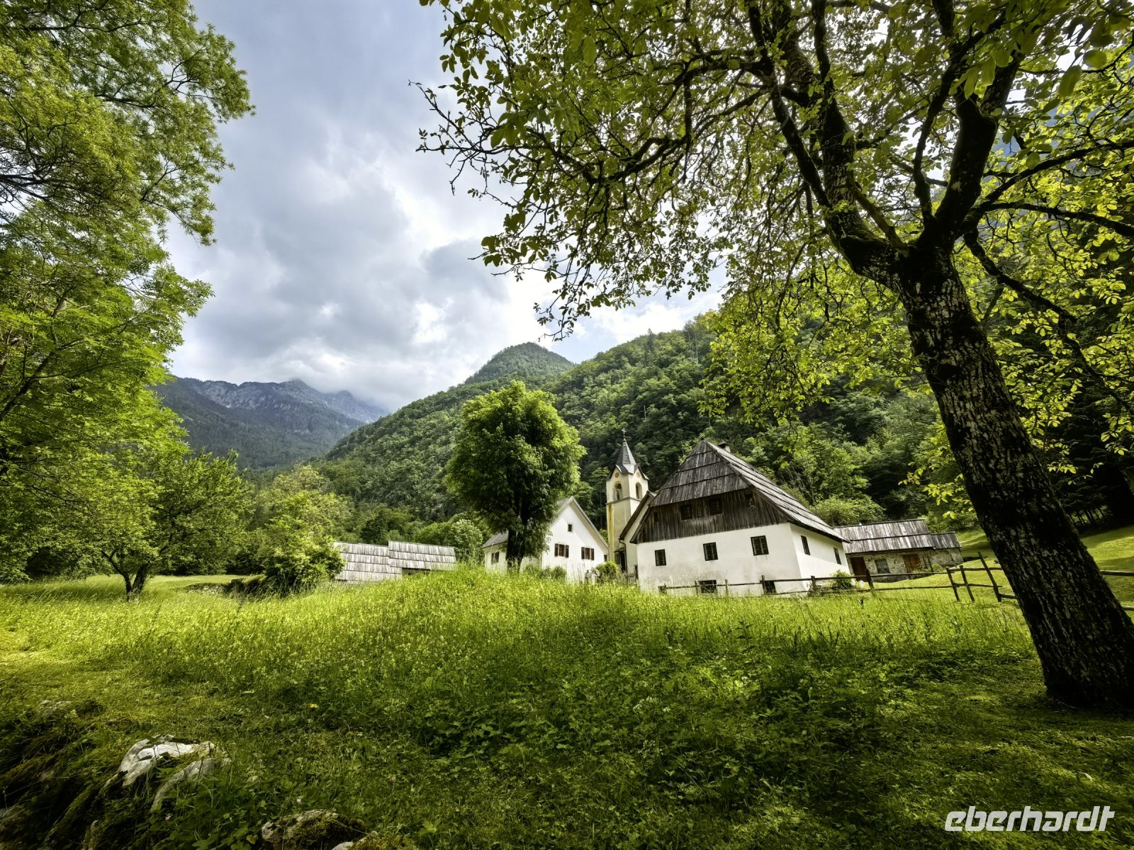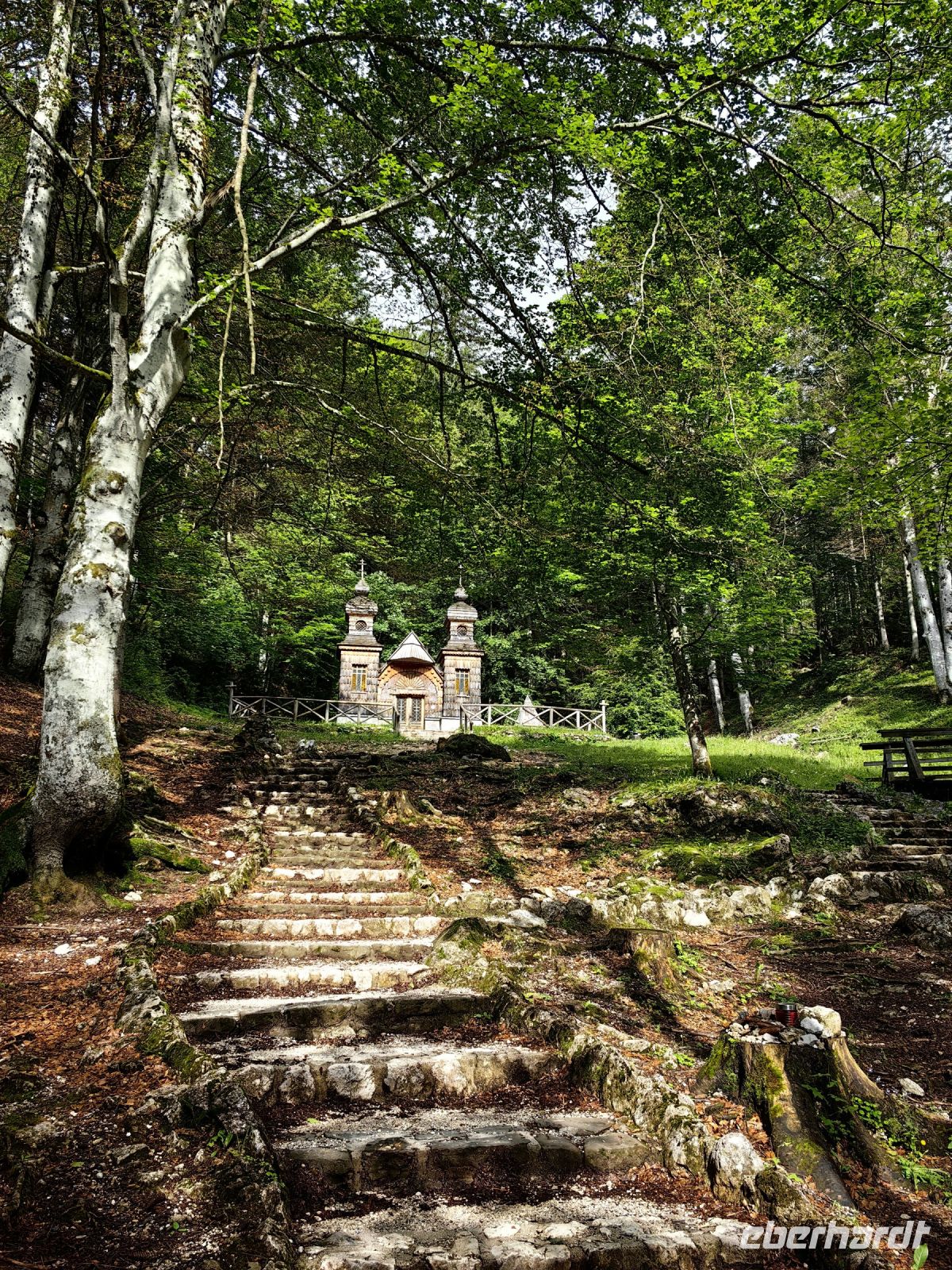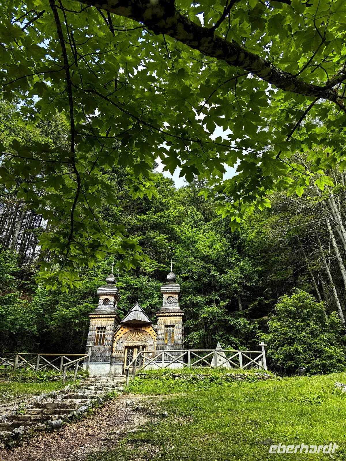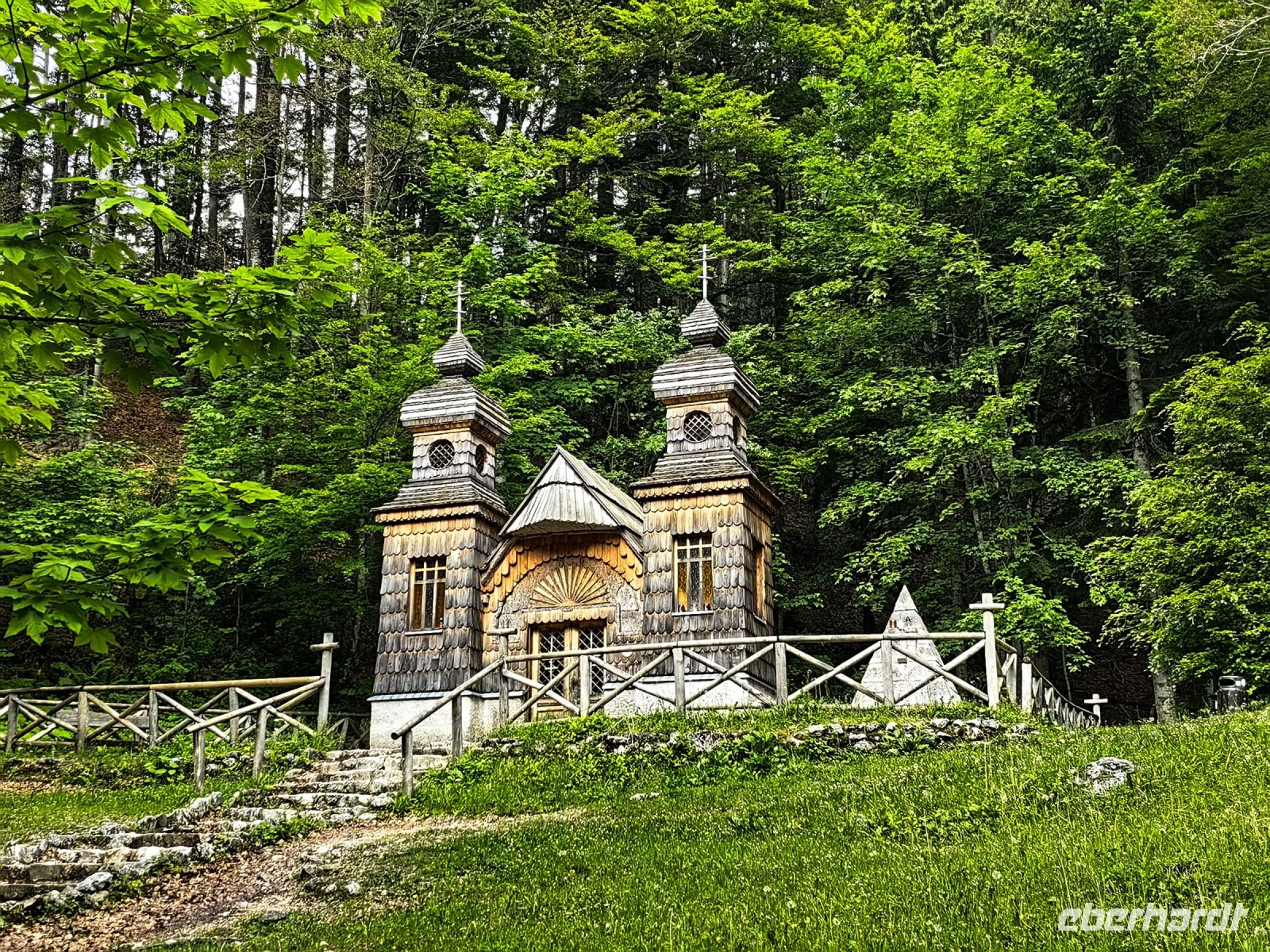Wir beginnen unsere spektakuläre Rundfahrt am Vrsic Paß, dem mit 1.611 Metern höchsten Paß der östlichen Julischen Alpen. 24 enge Haarnadelkurven winden wir uns nach oben, 26 wieder nach unten. Bei der Auffahrt halten wir an der Russischen Kapelle, die zum Andenken an die beim Lawinenabgang verunglückten Kriegsgefangenen errichtet wurde. Sie steht mitten im Grünen, hinter den Zwiebeltürmchen aus Holz erheben sich die Bergriesen und neben ihr schlängelt sich ein kleiner Bach den Steilhang hinunter.