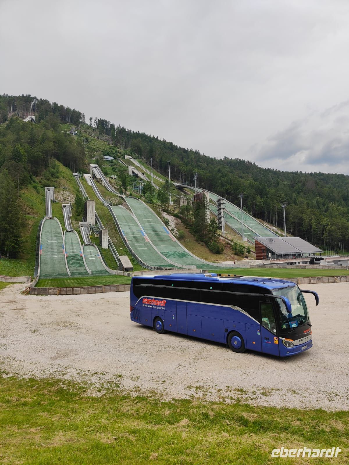 Am Nachmittag erreichen wir das unweit von unserem Hotel gelegene Örtchen Planica, welches die meisten Gäste aus dem Fernsehen von den Wintersportweltmeisterschaften her kennen. Hier befinden sich mehrere Skisprung- und Skiflugschanzen, daher wird der Ort auch das "Tal der Schanzen" genannt. Die erste Schanze wurde bereits 1930 am Berg Ponca errichtet. Bei den sommerlichen Temperaturen fällt es uns schwer, uns den vielen Schnee und die unzähligen Besucher bei den Meisterschaften vorzustellen. Bei unserem Besuch werden die Schanzen gerade ausgebessert und auf die nächste Saison vorbereitet. Nur wenige Schaulustige sind da und eine dunkle Wolkenfront läßt uns schnell ins Besucherzentrum fliehen. Dort genehmigen wir uns Kaffee oder Limonade und betrachten die gegenüberliegende Anlage.