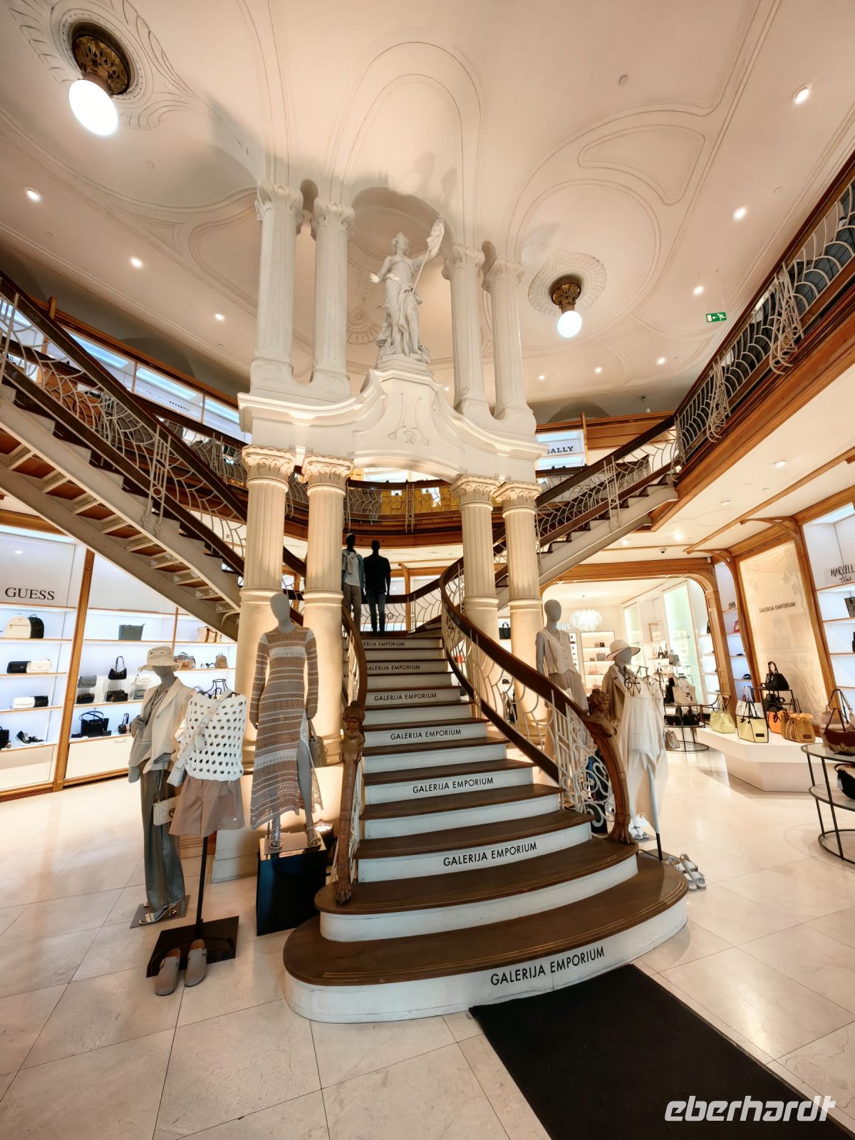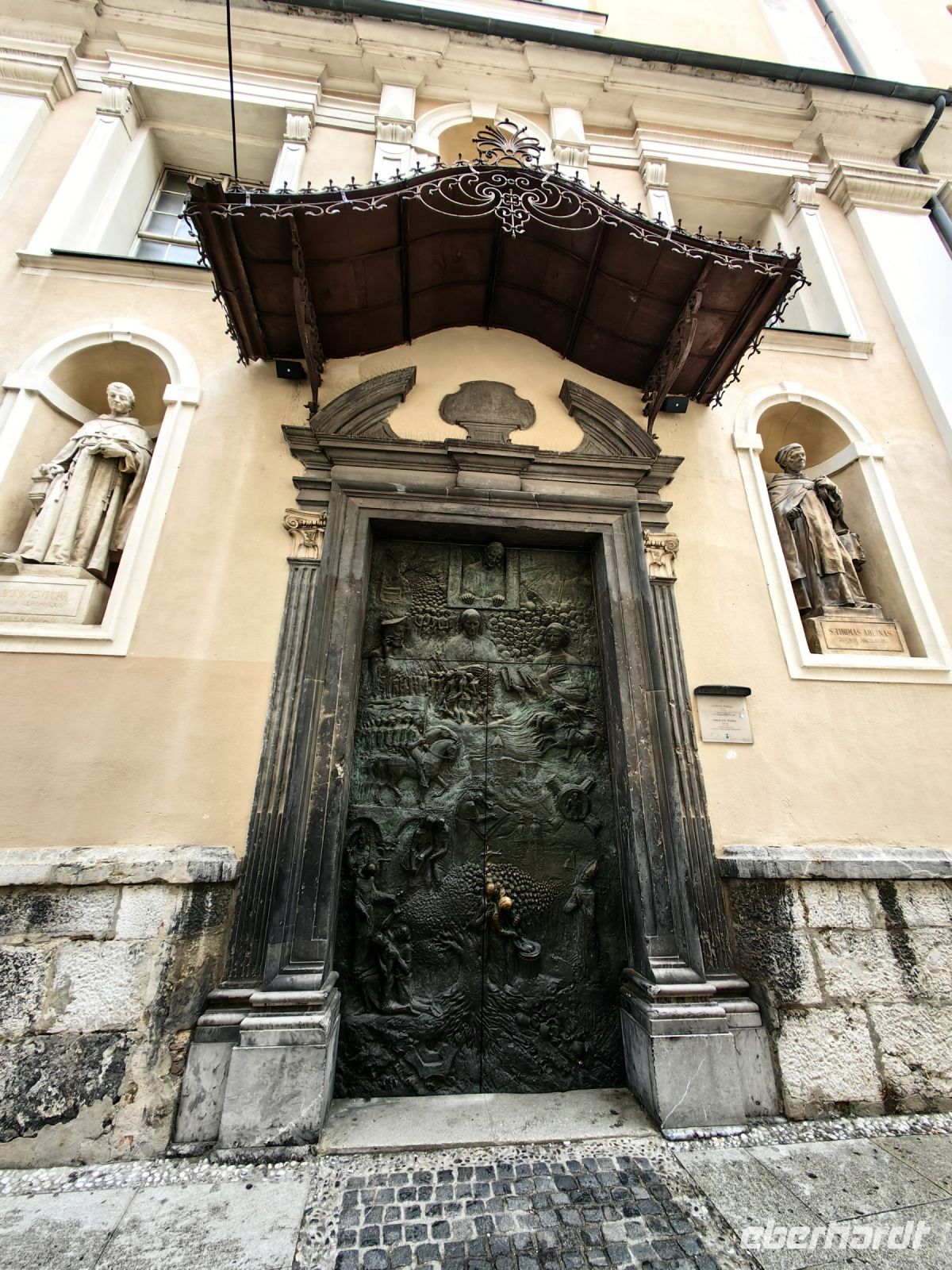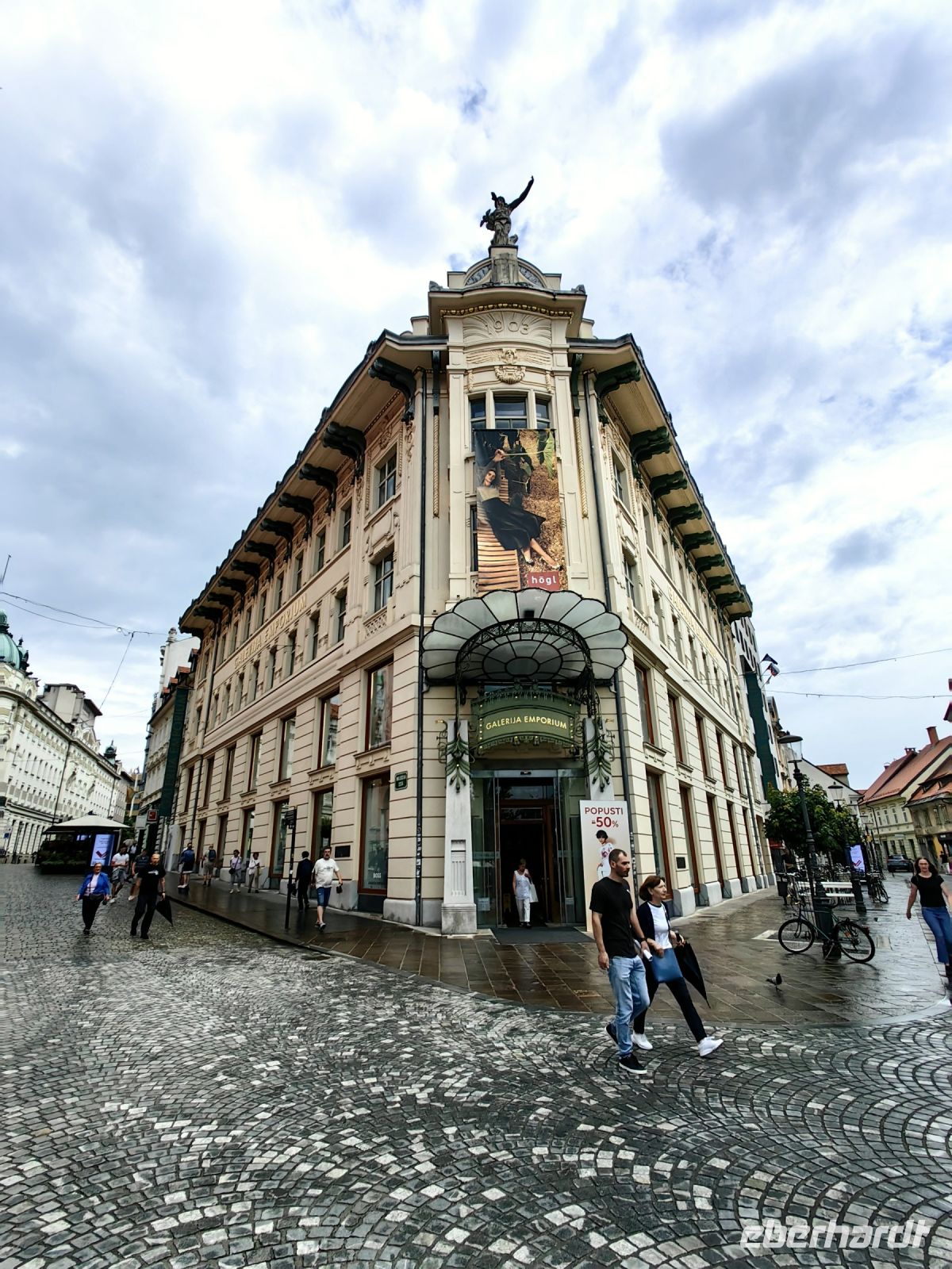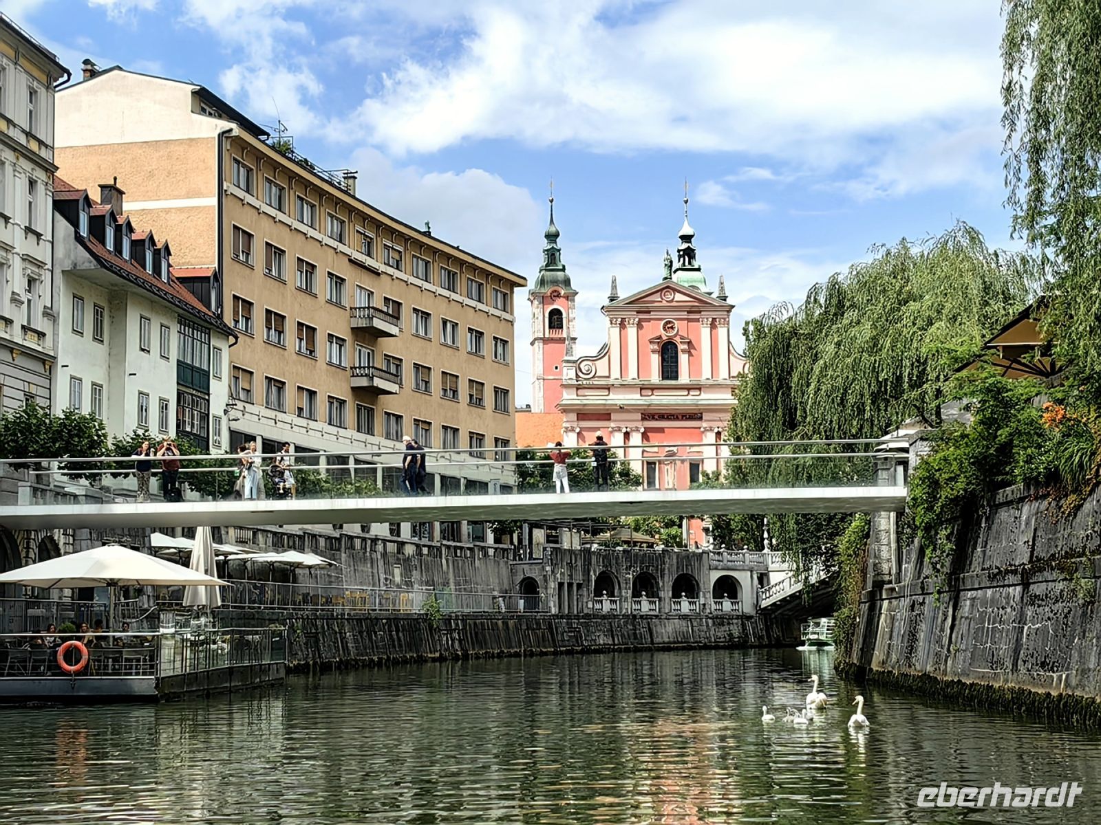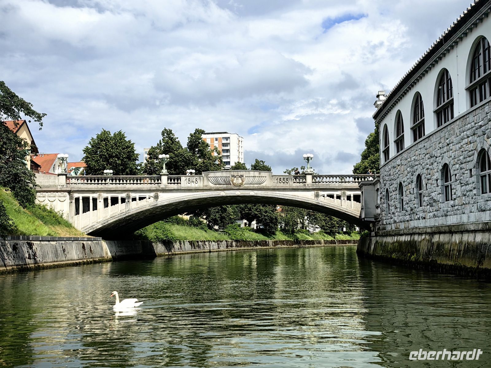 Vorbei an den Fakultäten der Universität und den berühmten drei Steinbrücken bummeln wir weiter, sehen auf der Ljublijanica die Ausflugsboote fahren, bewundern die Jugendstil-Fassaden und verweilen ein wenig vor der Kirche Maria Verkündigung mit ihrer barocken Fassade.