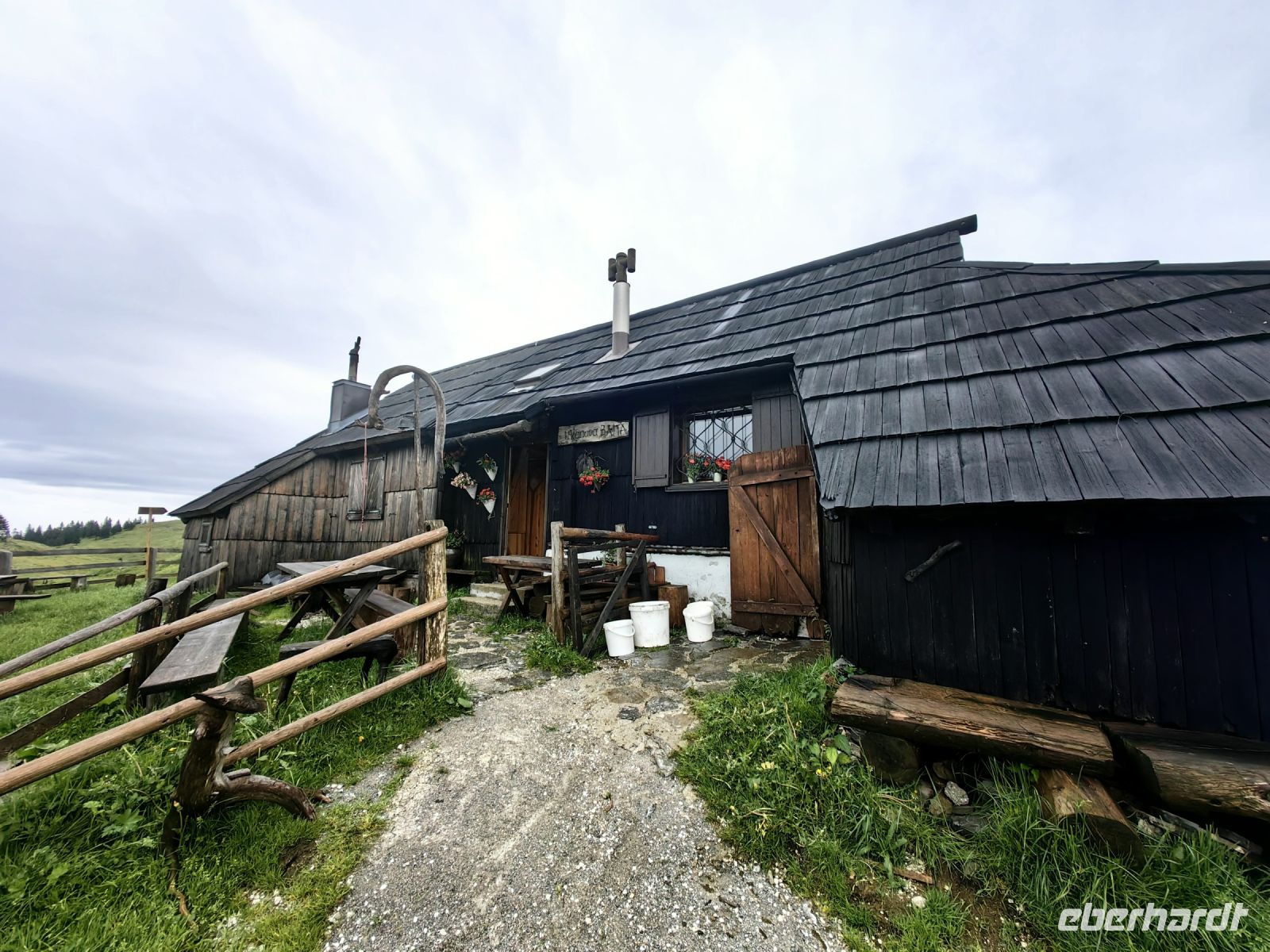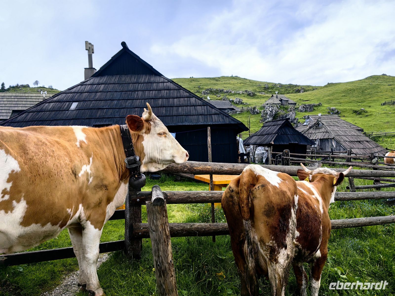 Die früheren Hütten auf der Hochalm stammten aus dem 16. Jahrhundert und hatten ovale Grundrisse. Darüber waren fensterlose schindelgedeckte einstöckige Holzgebäude mit einem mittigen Schornstein. In der Hüttenmitte befand sich traditionsgemäß die Küche, wo der luftgetrocknete Käse hergestellt wurde. Oberhalb der Küche war saisonal der Schlafraum des Hirten. Diese Hütten wurden einst nur von Juni bis September vom männlichen Familienmitglied bewohnt. Sie zogen am Berg auf und ab, je nachdem, wo das Vieh das beste Futter fand. Im September trieb man die Tiere wieder in die Täler und überwinterte dort in festen Häusern. Leider wurden sowohl diese schönen alten Hütten als auch die 1938 im gleichen Stil nach Plänen des Architekten Plecnik errichtete Kirche während des 2. Weltkrieges von den deutschen Besatzern zerstört, so daß auf dieser Alm keine Originalbauten mehr erhalten geblieben sind. Glücklicherweise wurden Hütten und Kirche aber auf Initiative von Hirten im Jahr 1988 wieder aufgebaut und heute beherbergen sie traditionelle Käsereien oder werden als Ferienwohnungen von Wanderern genutzt.