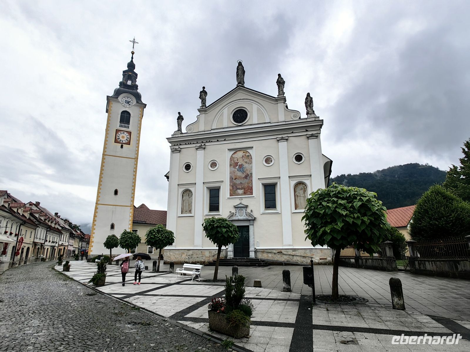 Unser nächstes Ziel ist das kleine Städtchen Kamnik südlich der Steiner Alpen. Kamnik besitzt noch einen mittelalterlichen Stadtkern und wird von zwei Burgen, der kleinen (Maligrad) und der oberhalb der Stadt gelegenen Burgruine (Starigrad) begrenzt. Als wir ankommen tröpfelt es wieder und wir spazieren auf der schönen aber bei dem Wetter völlig ausgestorbenen Hauptstraße entlang und schnell verschwinden alle Gäste in einem Café oder Restaurant und lassen die Atmosphäre auf sich wirken. Zwei Gäste laufen weiter bis zum Franziskanerkloster und am Nachmittag fahren wir zurück nach Kranjska Gora.