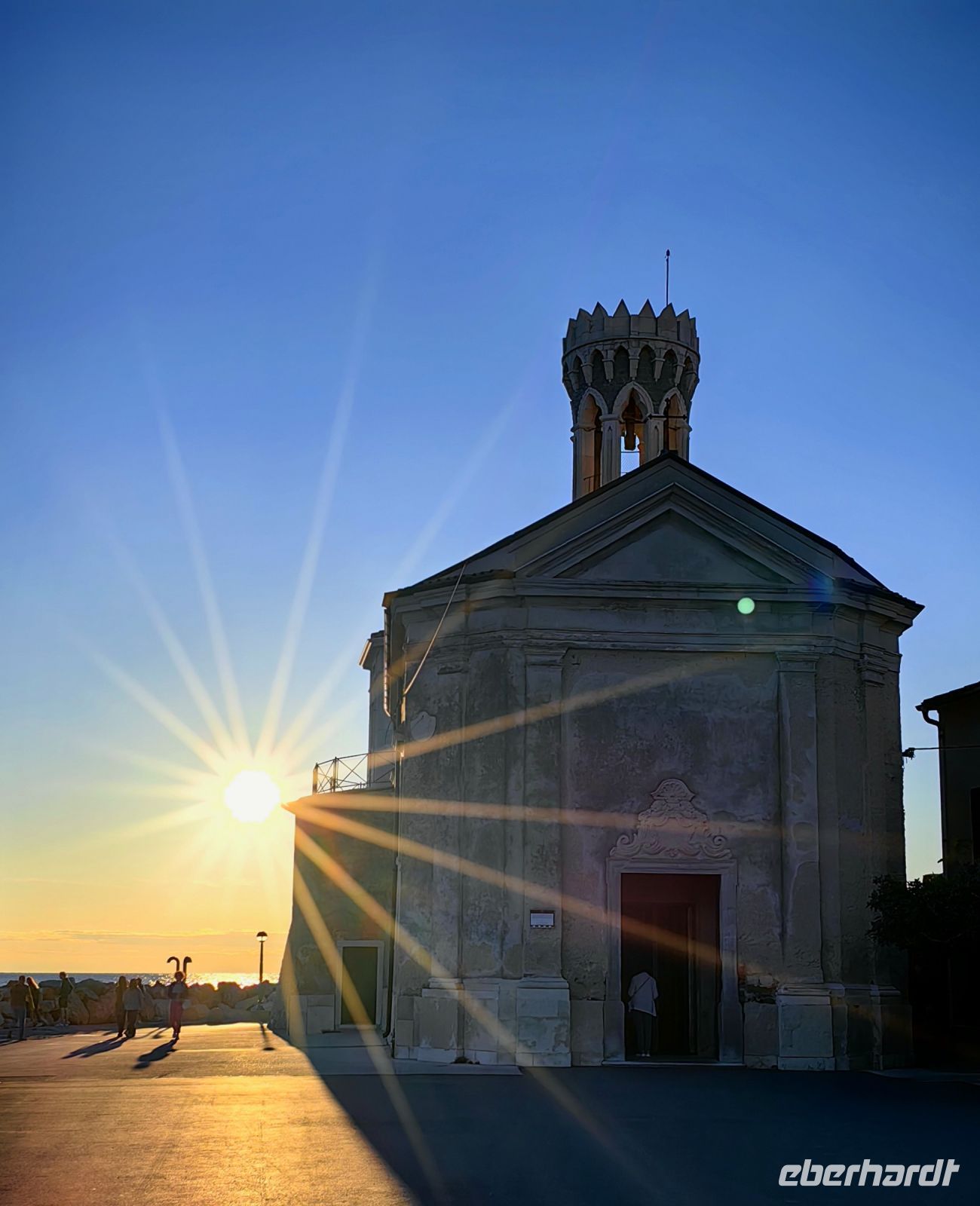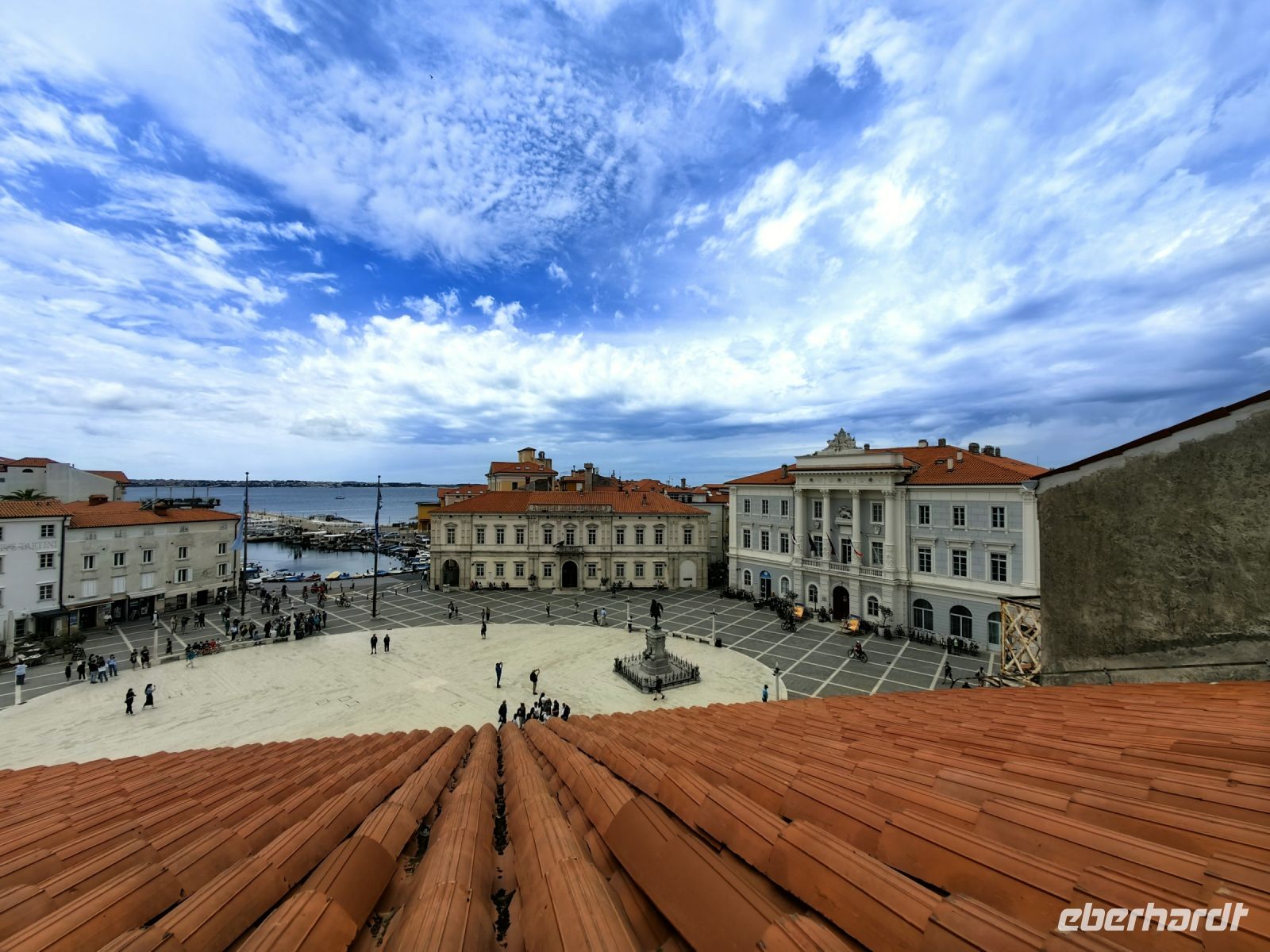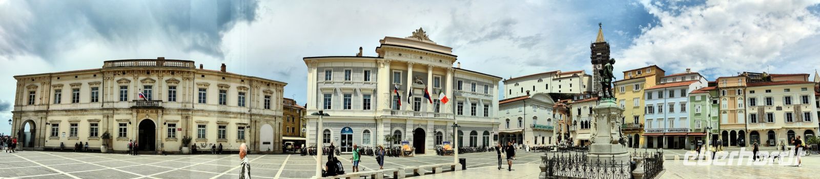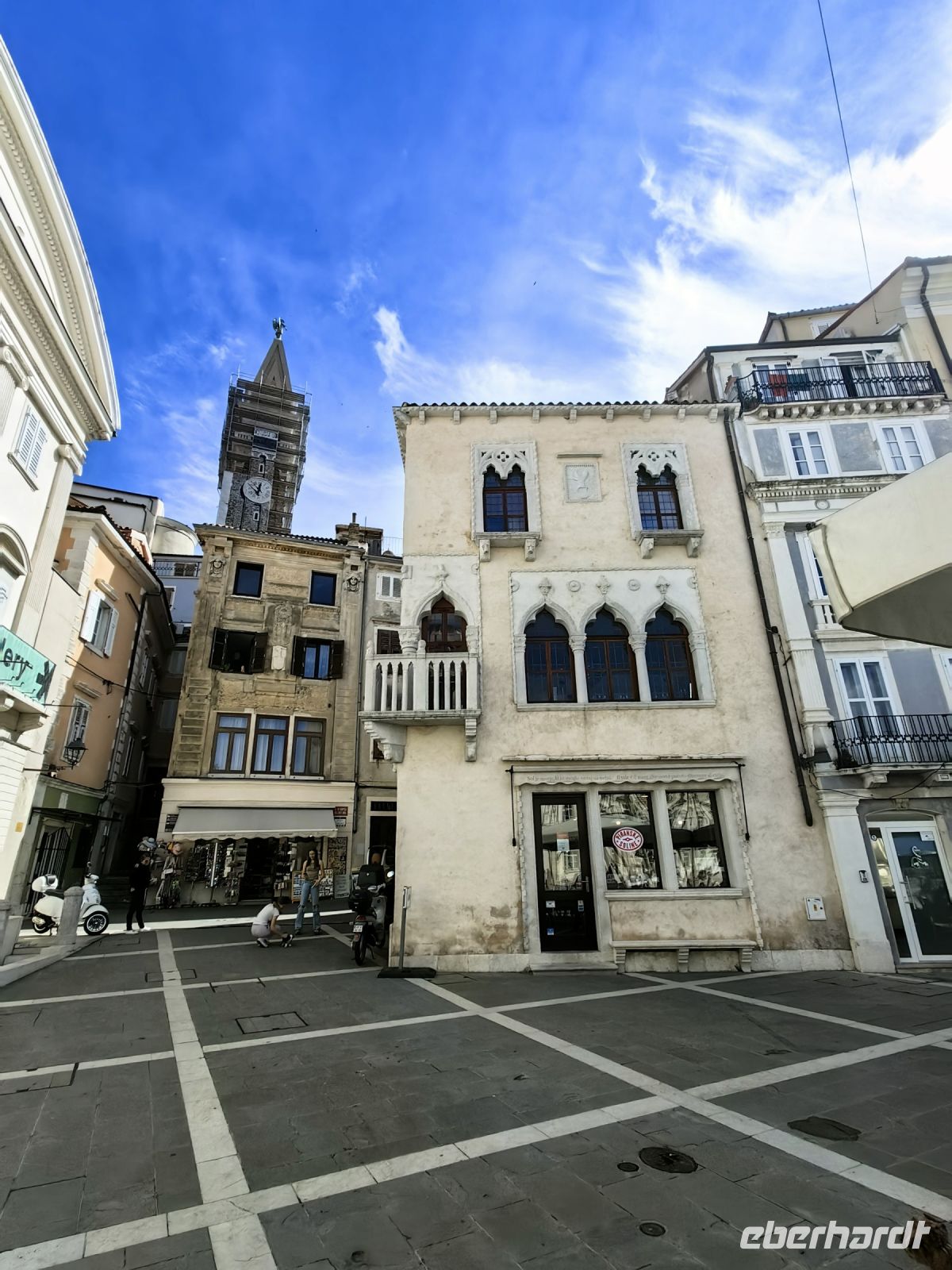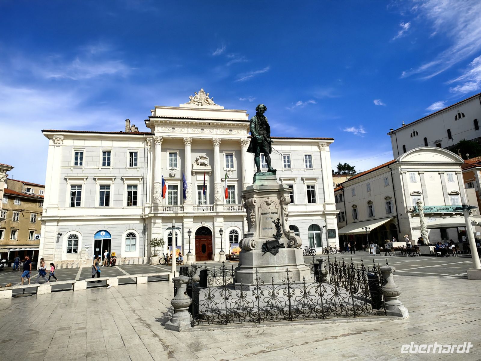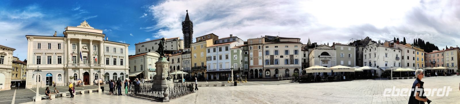 Als wir den Tartiniplatz erreichen, haben wir einen fantastischen Blick auf das Rathaus von Piran. Die Skulptur eines Sohnes der Stadt, Guiseppe Tartini, steht genau davor und wir erblicken den Glockenturm der Kathedrale des heiligen Georg. Steil hinauf steigen wir, um von oben den tollen Ausblick auf die Julischen Alpen, die italienischen Alpen und sogar die Dolomiten zu genießen. In der Kathedrale findet derweil gerade eine Messe statt. Auf dem Glockenturm thront eine Skulptur des Erzengel Michael, die den Einwohnern der Küstenstadt das Wetter anzeigt. Diesen Glockenturm kann man auch besteigen und nachdem man 175 Stufen hochgestiegen ist, hat man einen Rundumblick auf die Stadt und die gesamte Küste.