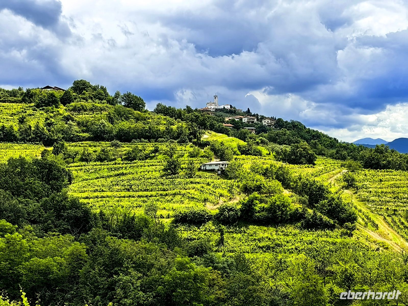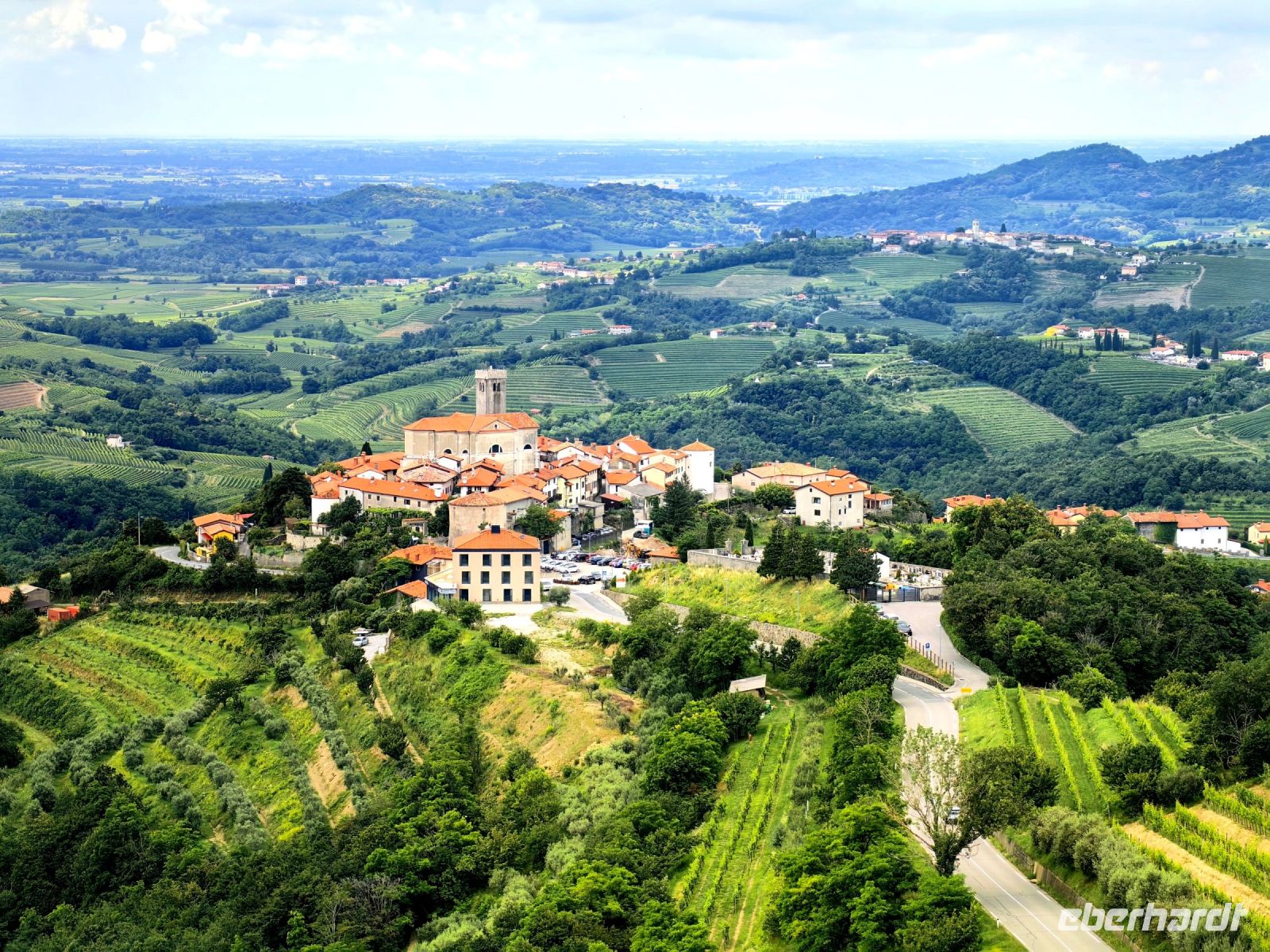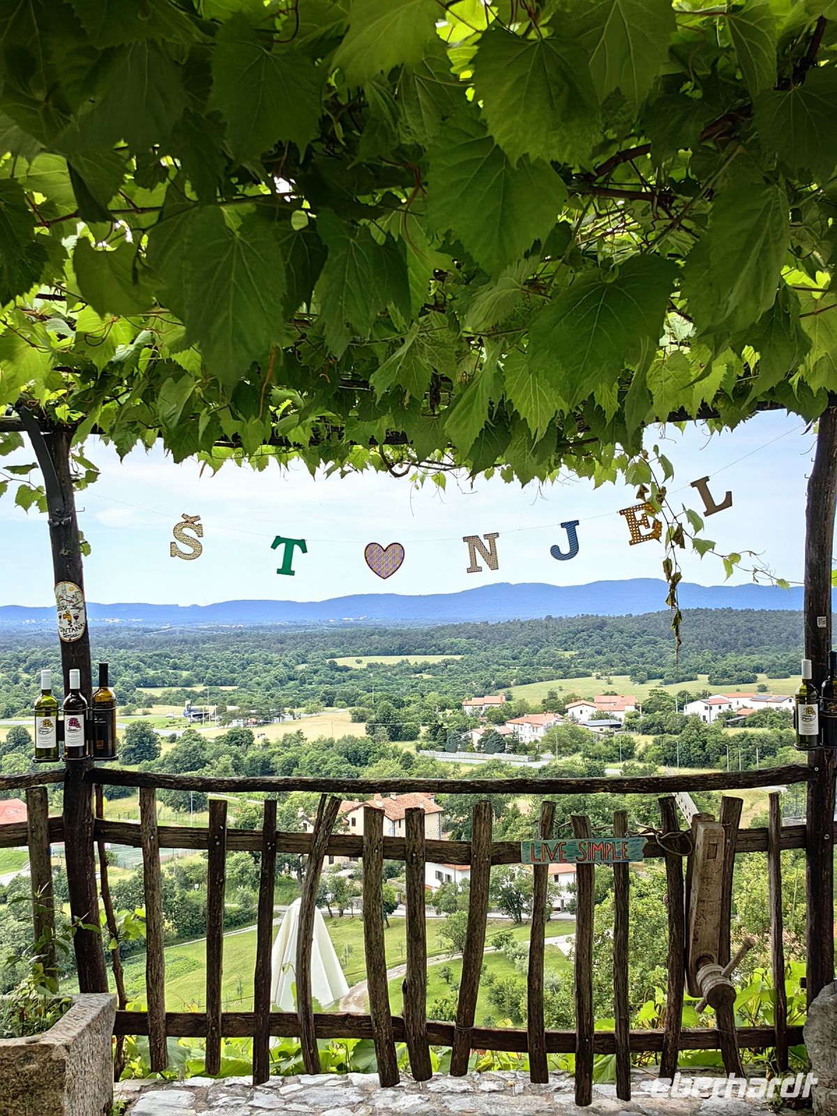 Unsere nächste Pause machen wir am Gonjace Lookout Tower. Auf diesen 23 Meter hohen Aussichtsturm steigen wir die 144 Stufen hinauf und es läßt sich kaum beschreiben, wie grandios der Blick von hier oben über die sanften Hügel der Brdaregion ist. Bei gutem Wetter kann man bis zum Triglav blicken. Vor uns liegen unzählige Weinberge, dahinter saftig grüne und bewaldete Hügel und auf jeder Hügelspitze thront ein mittelalterliches Dörfchen. Wir sehen ein Panorama in allen vier Himmelsrichtungen, die Karnischen und die Julischen Alpen, die Dolomiten, Friaul, den Golf von Triest, den Karst, das Vipavatal und den Hoch- und Schwarzwald Trnovski gozd.