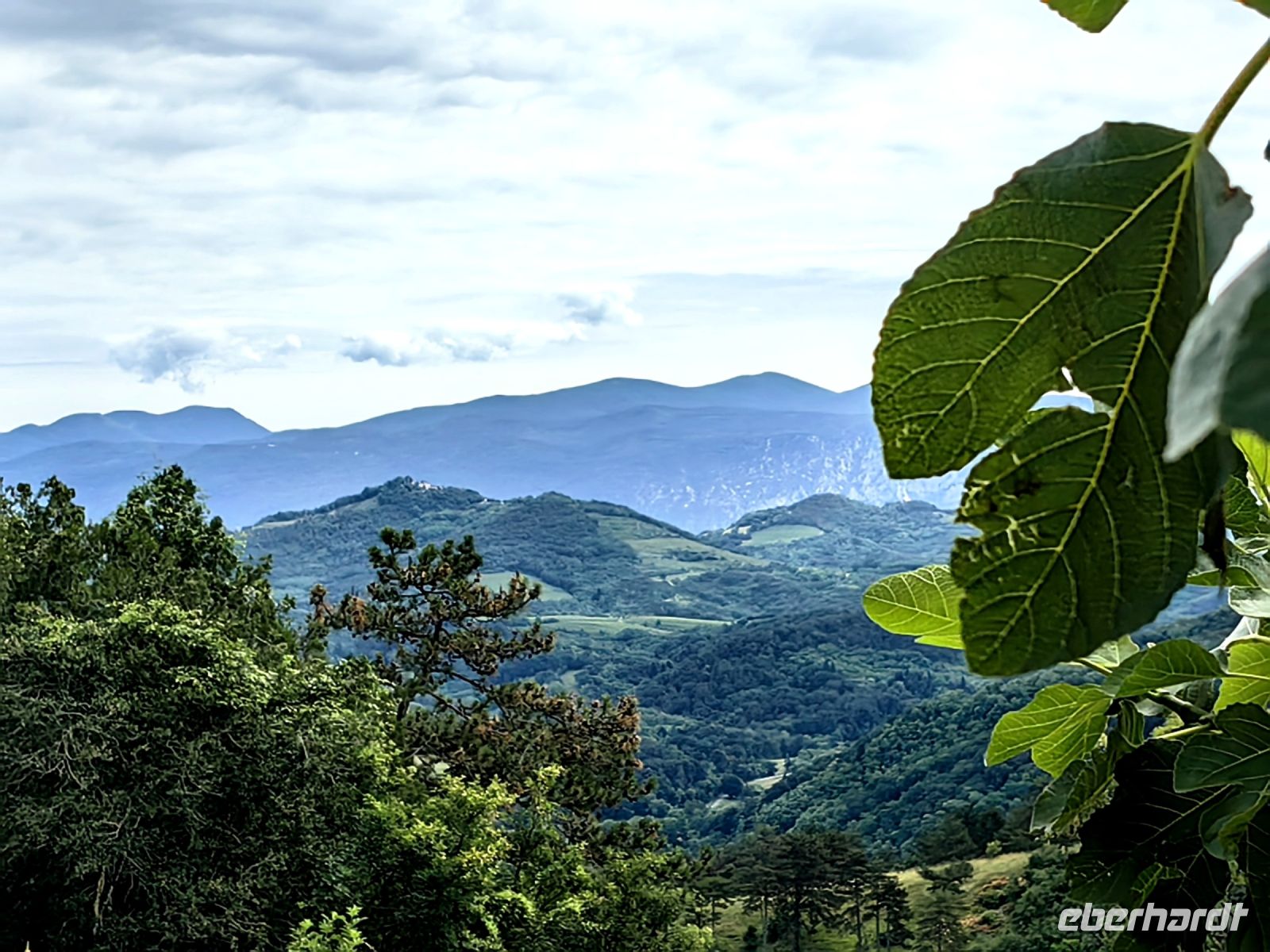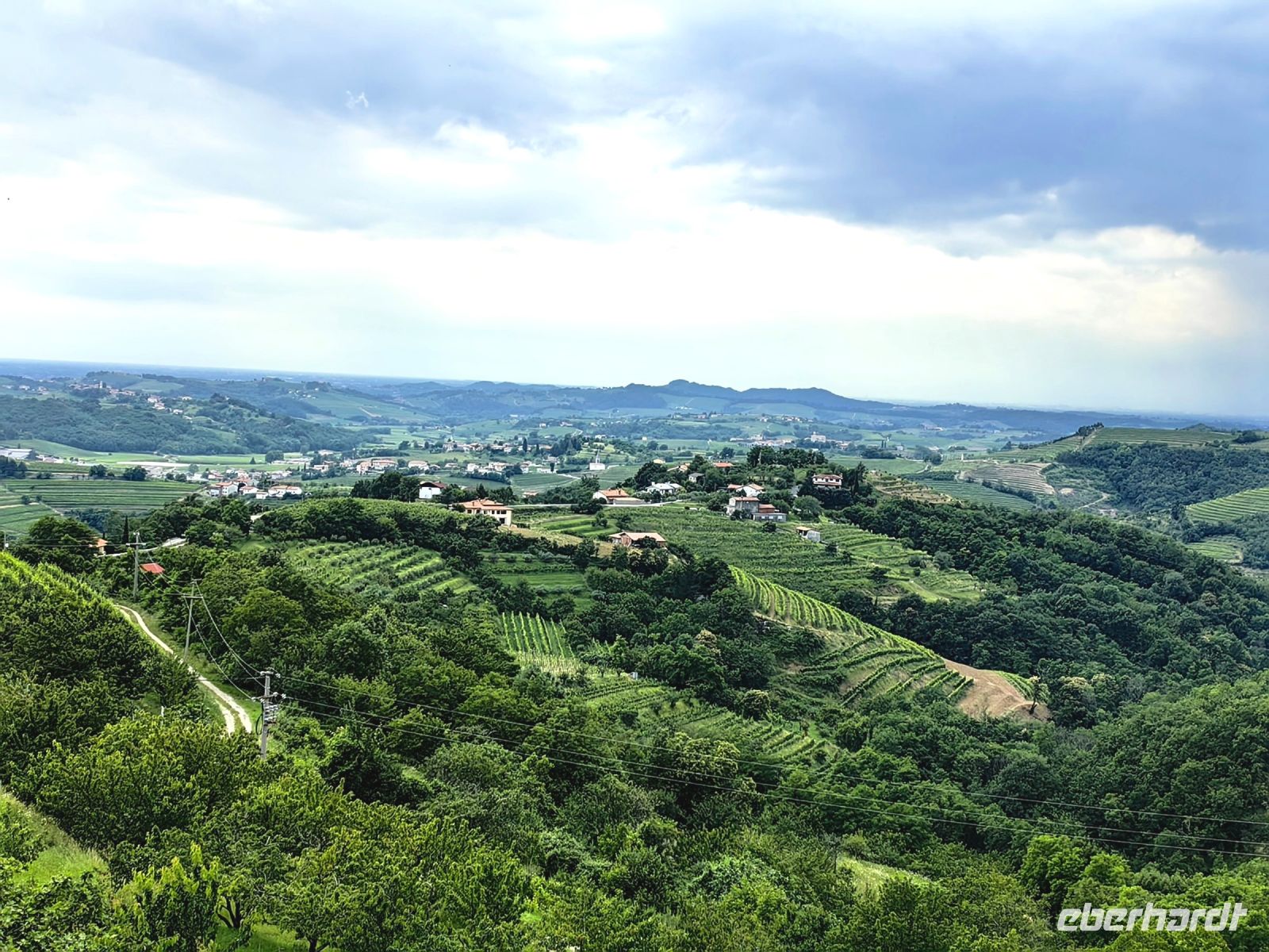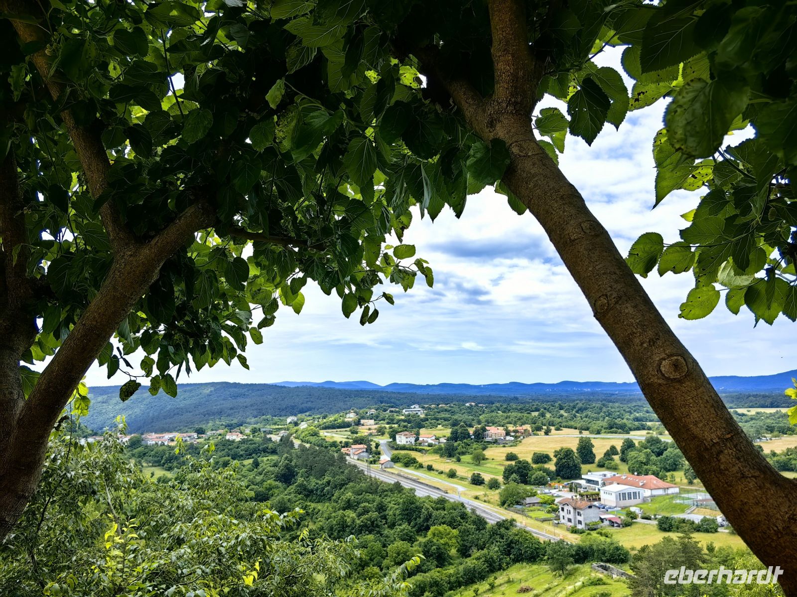 Unsere nächste Pause machen wir am Gonjace Lookout Tower. Auf diesen 23 Meter hohen Aussichtsturm steigen wir die 144 Stufen hinauf und es läßt sich kaum beschreiben, wie grandios der Blick von hier oben über die sanften Hügel der Brdaregion ist. Bei gutem Wetter kann man bis zum Triglav blicken. Vor uns liegen unzählige Weinberge, dahinter saftig grüne und bewaldete Hügel und auf jeder Hügelspitze thront ein mittelalterliches Dörfchen. Wir sehen ein Panorama in allen vier Himmelsrichtungen, die Karnischen und die Julischen Alpen, die Dolomiten, Friaul, den Golf von Triest, den Karst, das Vipavatal und den Hoch- und Schwarzwald Trnovski gozd.