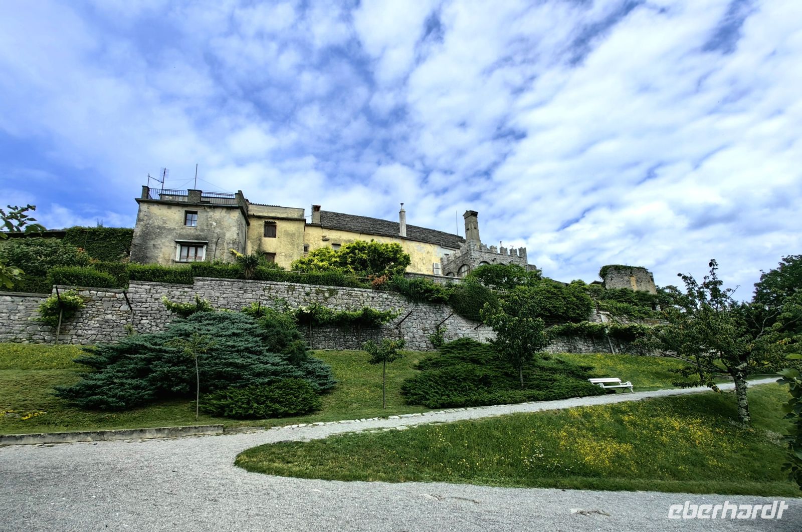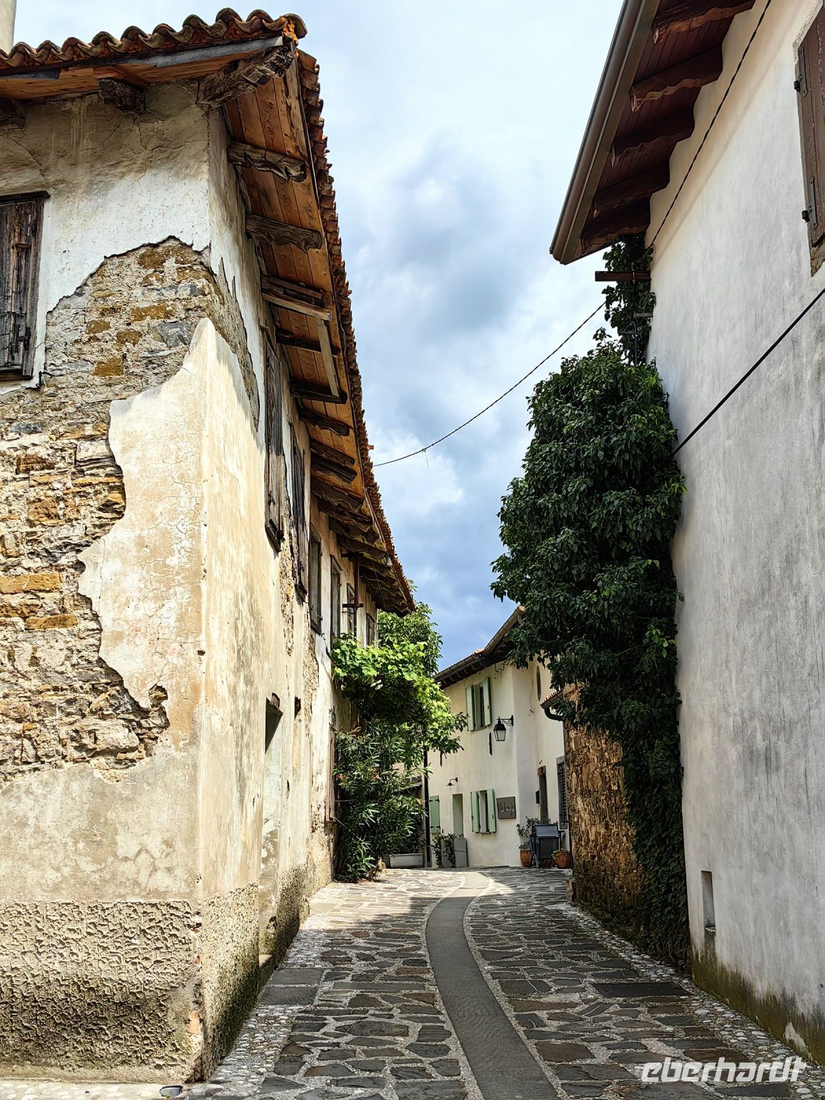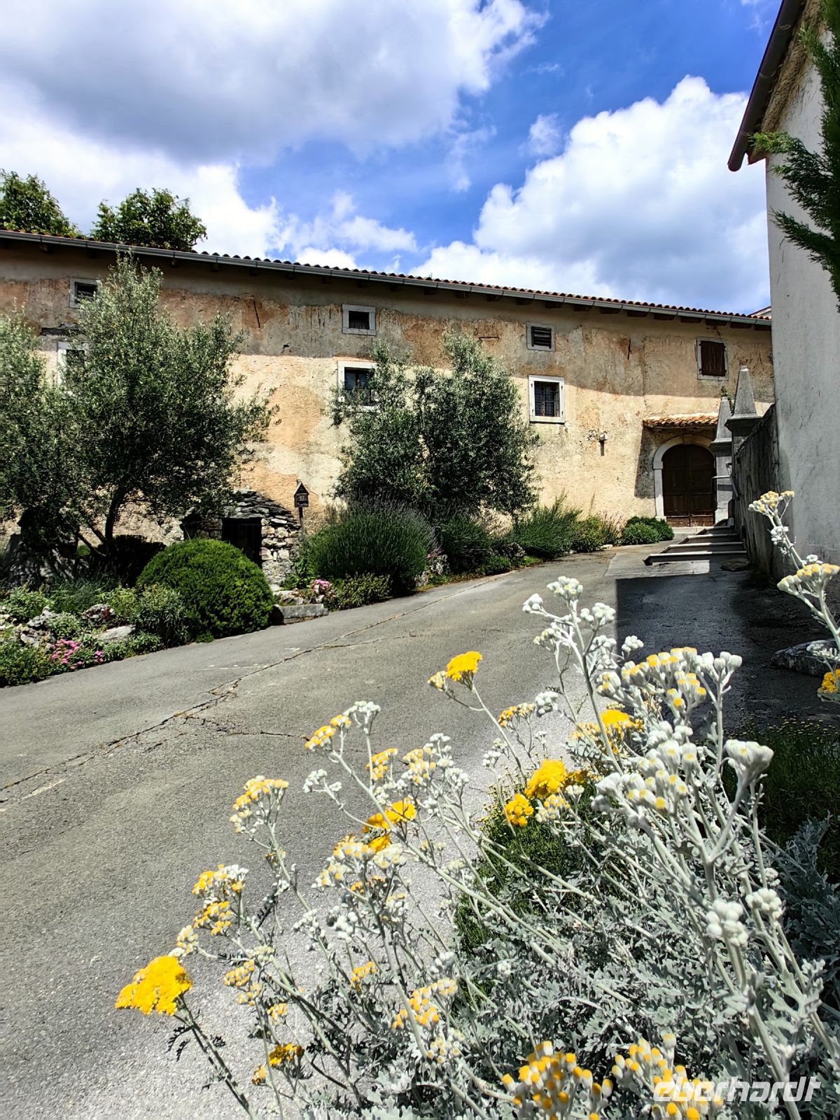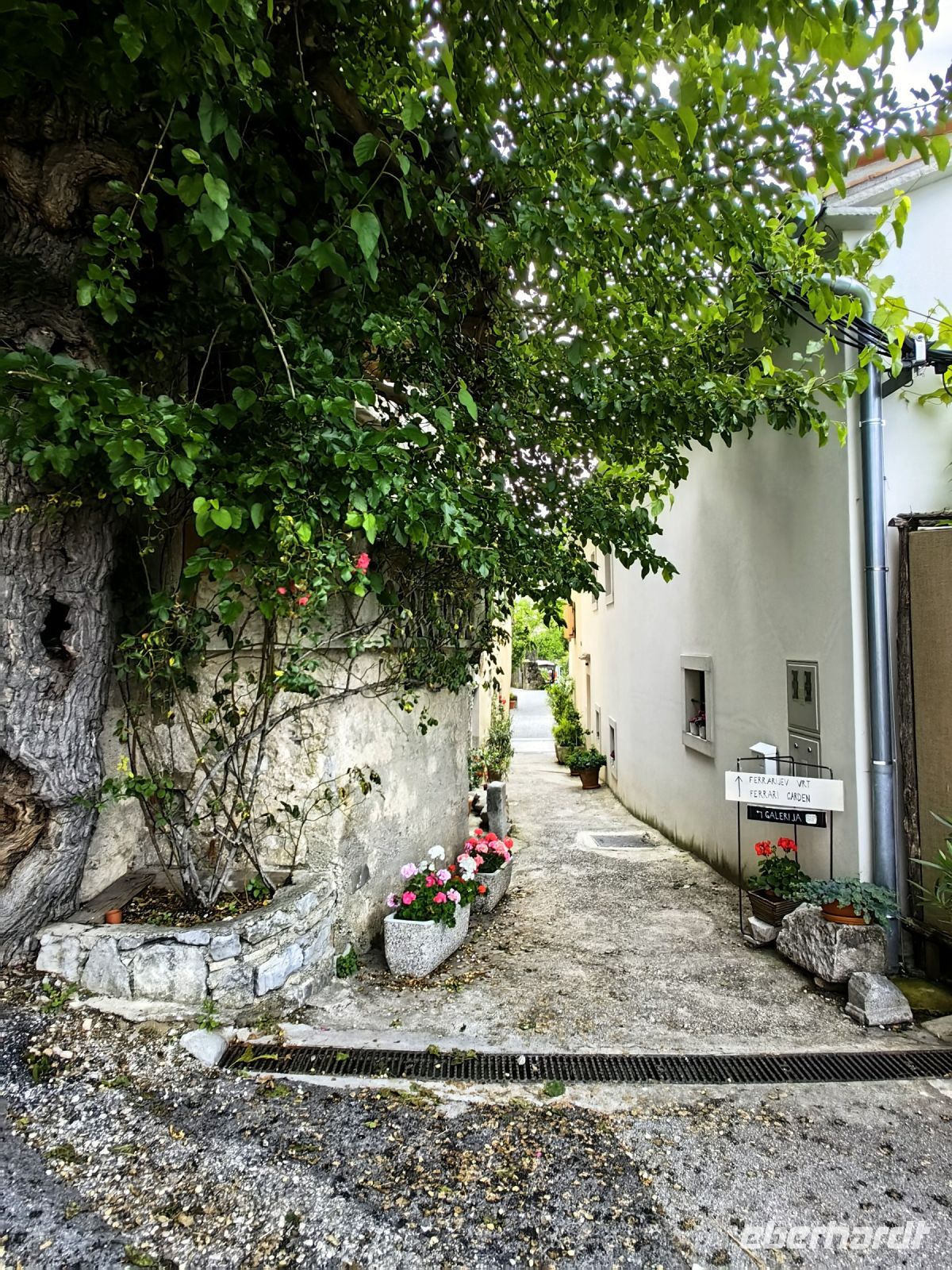 Unseren ersten Besuch statten wir dem kleinen Ort Stanjel ab. Dieser Name leitet sich vom Schutzheiligen der Stadt, dem heiligen Daniel ab. Aufgrund der hervorragenden Lage auf einem Hügel, war Stanjel schon in prähistorischen Zeiten besiedelt und während der Antike entstanden hier die ersten Befestigungen. Die Festungsmauer, die heute wieder teilweise restauriert wurde, stammt aus dem 15. Jahrhundert und sollte vor den Angriffen der Osmanen schützen. Die kulturelle Blüte erlebte der kleine Ort im 16. und 17. Jahrhundert. Zwischen den beiden Weltkriegen spielte vor allem der damalige Bürgermeister und Architekt Max Fabiani bei der Prägung des Aussehens von Stanjel eine große Rolle. Er errichtete für die Familie seines Schwagers einen Garten, den er um eine Reihe von Gebäuden des ehemaligen Ostwalls der Stadt herum anlegte. Dabei schuf er auch ein Wassersystem, welches den ewigen Wassermangel des Karstes berücksichtigt und heute noch Besucher begeistert. Im Ort selbst fühlten wir uns eher in ein mittelalterliches Szenario versetzt