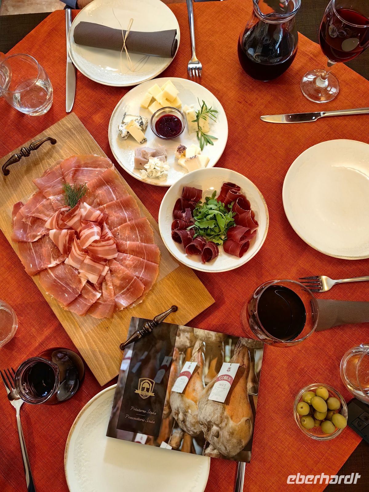 Nur wenige Kilometer von den alten Stadtmauern entfernt treffen wir eine junge Familie, die den wunderbaren Prsut und einzigartigen Käse nach alten Traditionen, nämlich luftgetrocknet, produzieren. Wir bekommen genau erklärt, wie der Schinken zu einer Leckerei heranreift und genießen in vollen Zügen diese einzigartige Spezialität, zu der der dunkle intensive Karstwein Teran hervorragend paßt. Wir probieren andächtig und kein einziges Scheibchen der Leckereien bleibt übrig. Um diesen Schinken zu kaufen, kommen sogar die italienischen Nachbarn von weit her angefahren. Im Anschluß an die Verkostung werden uns die riesigen Keulen gezeigt, die bis unter die Decke in einer kleinen Halle aufgehängt wurden und dort mindestens 12 Monate reifen müssen. Die Lufttrocknung wird stark vom Borawind beeinflußt, der dem Schinken seinen speziellen Geschmack verleiht. Der kleine Tresen mit den verschiedenen Schinkensorten wird danach regelrecht erstürmt von den Gästen.