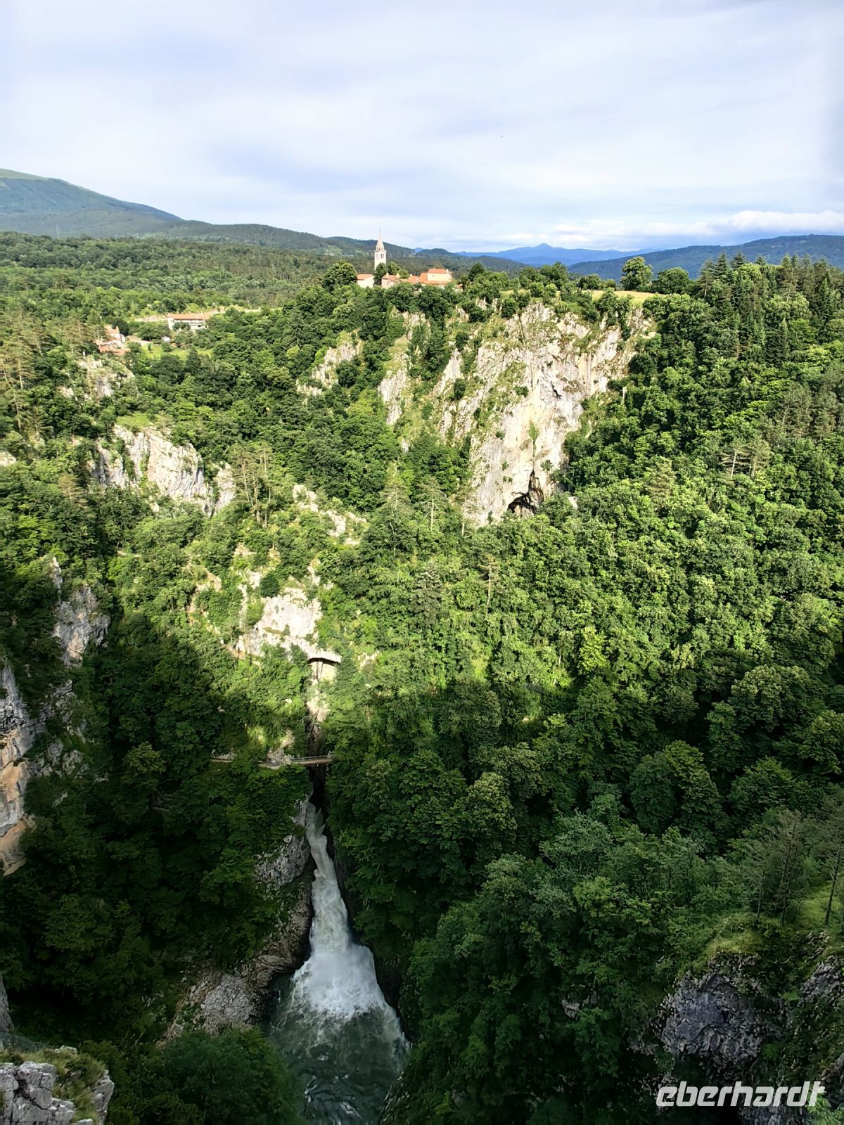Unseren letzten Halt legen wir an der Skocjanhöhle ein. Die unterirdische Welt dieses kleinen Landes ist einzigartig, geprägt von unterirdischen Flüssen, Stalaktiten und Stalakniten und feengleichen Grotten. Wir laufen am Fluß Reka oberhalb einer riesigen Schlucht entlang und sehen unten das Wasser entlangströmen. Der Ausblick ist unbeschreiblich, unten tost das Wasser, alles rundherum ist üppig grün. Darüber ragen die karsttypischen Kalkfelsen heraus und über allem thront eine alte Kirche hoch oben. Ein traumhafter Blick, den wir nie vergessen werden.