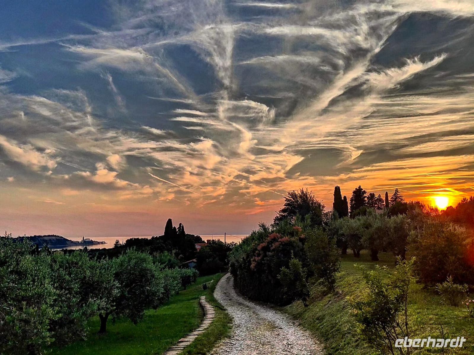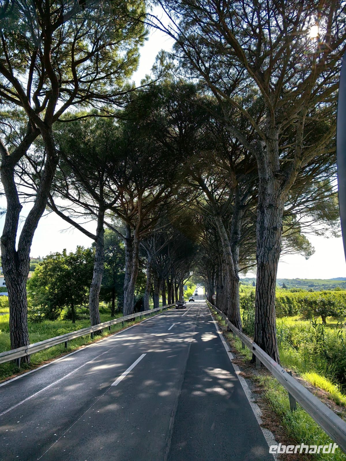 Am frühen Nachmittag treffen wir uns am Bus wieder und machen gemeinsam einen Ausflug zu einem in der Nähe von Koper gelegenen Weingut der Familie Kralj. Wir fahren an Strunjan und den Salinen vorbei in Richtung Koper, biegen dann von der Hauptstraße ab und finden uns in einer Landschaft wieder, die sehr an die Toskana erinnert. Zypressen stehen auf sanften Hügeln, knorrige Olivenbäume säumen die Wege. Vereinzelte Höfe liegen verstreut. Da bricht ein Gewitter über uns herein, daß an einen indischen Monsun erinnert und zum Glück holt uns die Familie mit Autos am Bus ab, so daß wir nicht laufen müssen und somit nicht naß werden.