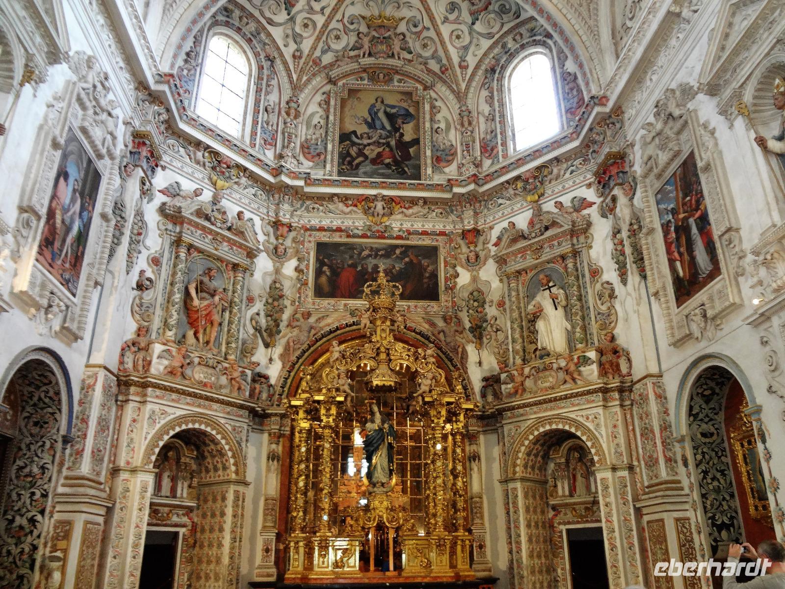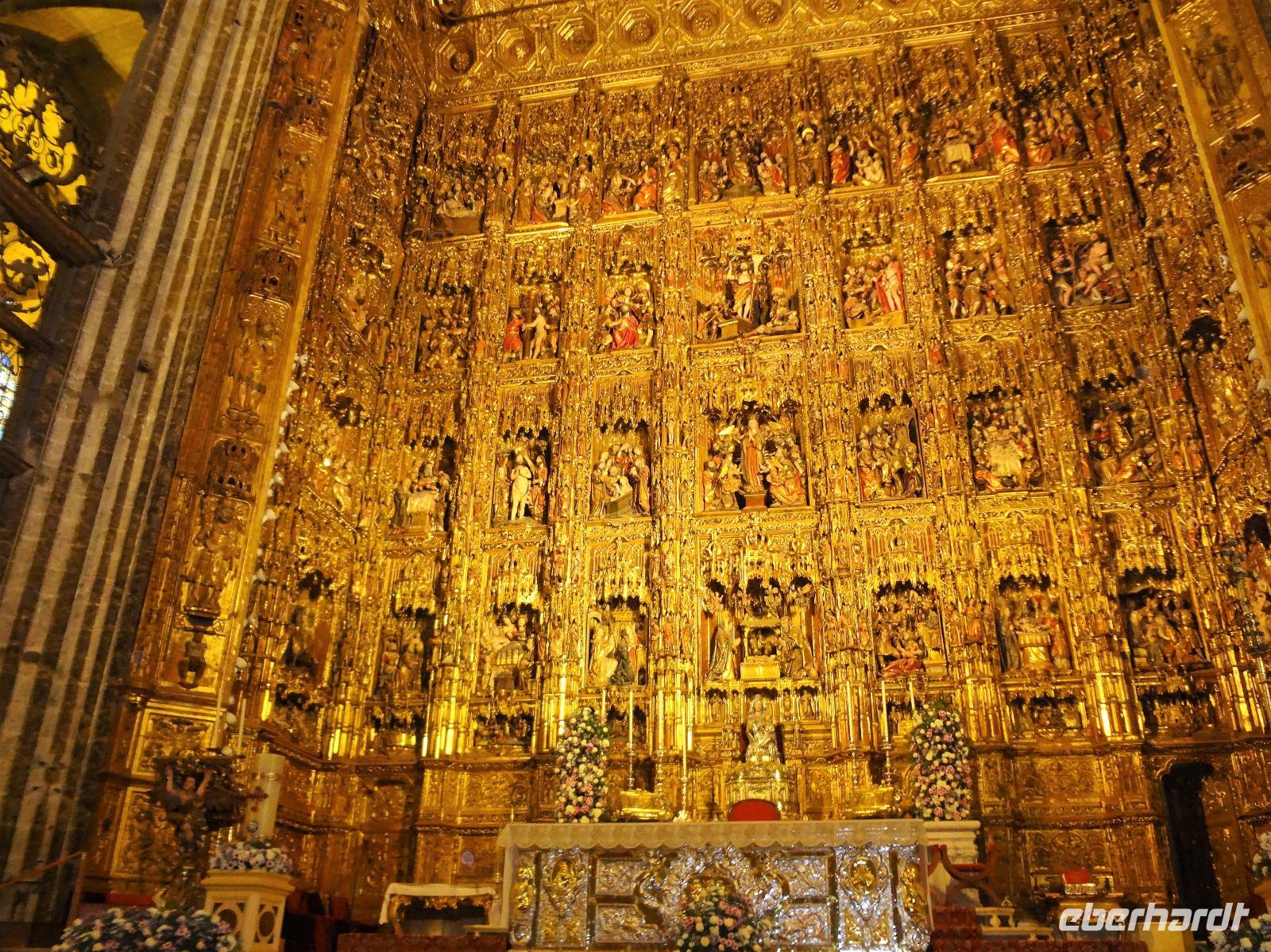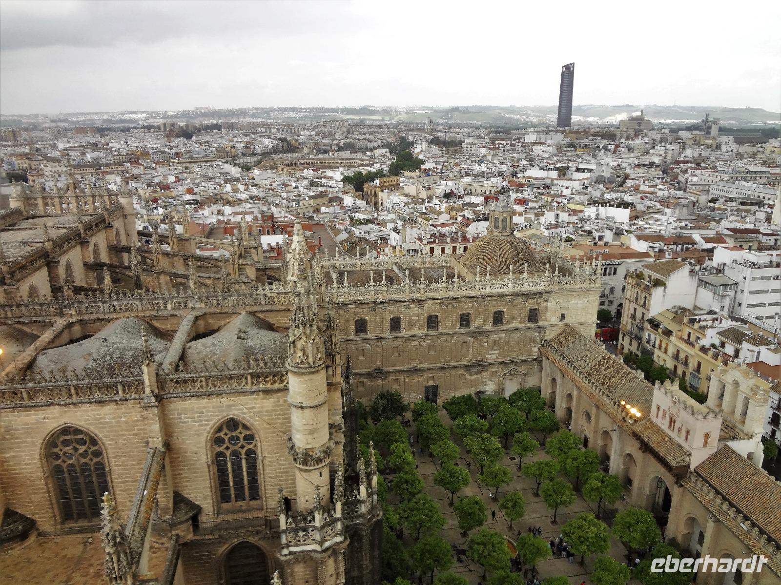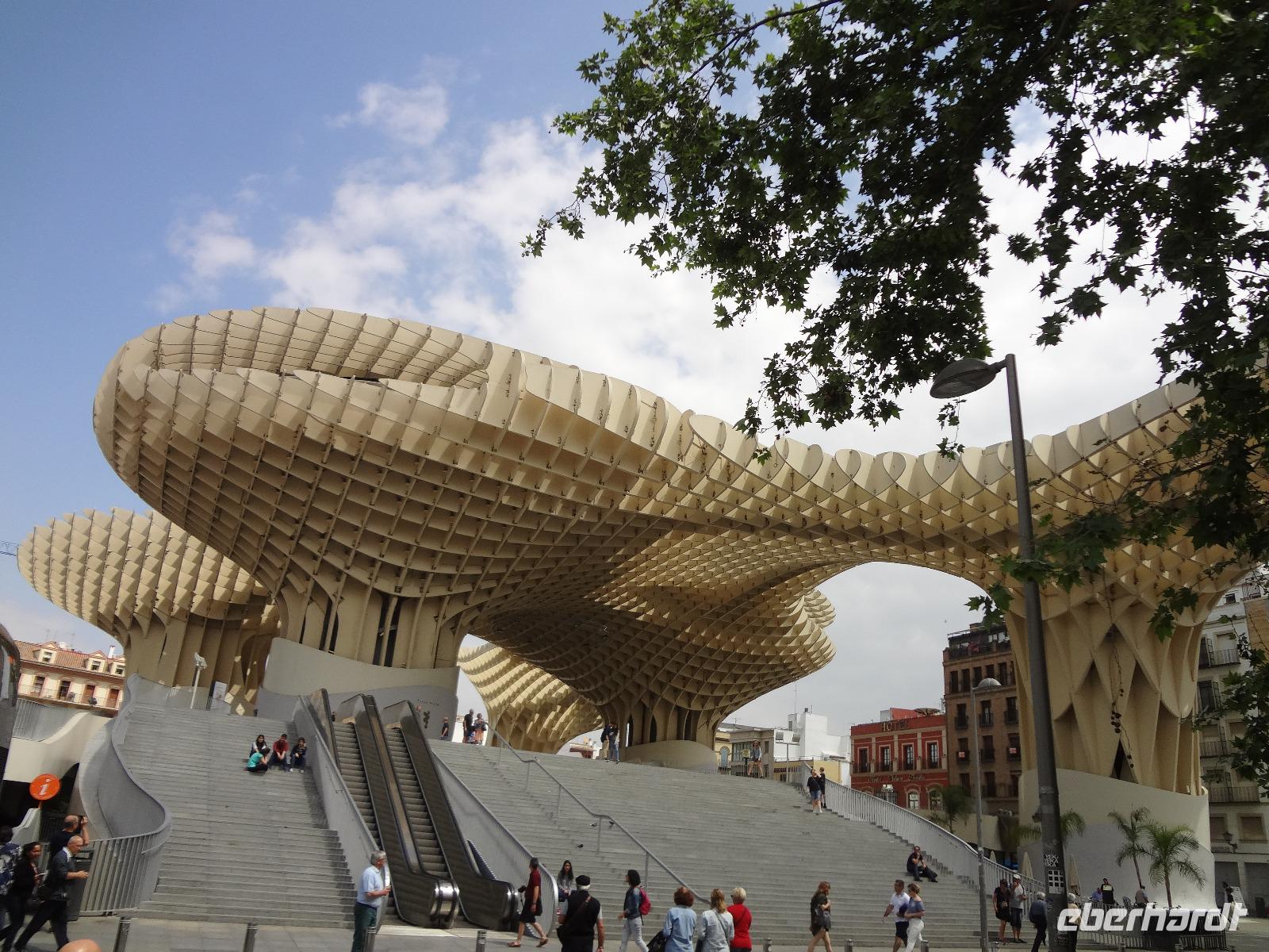 Sevilla is feurig, diese Stadt ist sehr lebhaft und nicht nur Touristen fuellen die Strassen sondern auch viele Einheimische und Spanier aus anderen Provinzen beleben die Gassen, Alleen und Cafes. Wir sind im Stadtzentrum, im Judenviertel, untergebracht und der oertliche Reiseleiter, Fran spaziert mit uns vorerst mal durch dieses Viertel mit ihren engen Gaesschen aehnlich wie in Cordoba. Aber auf einmal stehen wir vor der grossen Kathedrale und dem maechtigen Alcazar Palast. Viele Besucher stehen schon in der Schlange um in den Alcazar zu gelangen. Wir haben jedoch bereits eine Reservierung und es dauert keine 5 Minuten da stehen wir auch schon mit staunenden Augen in dem Vorgarten dieses Palastes der aus drei Palaesten besteht. Die ganze Geschichte Sevilla's ist hier zu sehen, zu spueren, anzuschauen und aufzunehmen. Tausendjaehrig ist diese komplexe, labyrinthhafte Festung und wir hoeren beim Durchgehen mit etwas Fantasie die Schritte der Koenige und Kalifen die hier wohnten. Die Seelen von Ferdinand dem Dritten, Peter dem Gerechten (oder Grausamen, wie er auch genannt wird!), der schoenen Isabella von Kastilien und von Kaiser Karl des Ersten bewohnen noch immer die reich verzierten Raeume. Nur gut, dass wir bloss unter Tags hier sind ! Der Palast von Koenig Don Pedro wird auch heute noch vom spanischen Koenigshaus als Residenz bei Besuch bewohnt. Eine gloriose Kapelle fehlt natuerlich auch nicht in diesem Komplex und im gotischen Palast sind wir weggeblasen von den herrlichen Tapisserien und der Gemaeldegallerie. Nun gehts aber weiter zum naechsten Programmpunkt. Die Kathedrale. Auch hier kommen wir vorerst in den Orangenhof da es sich auch hier um eine Moschee-Kathedrale handelt. Ausgerichtet ist auch sie nicht gen Mekka sondern zum Sueden hin ! Ferdinand der Dritte ist der Madonna de Antigua vor den Toren dieser Stadt begegnet, was ihn dazu veranlasste diese Stadt zu erobern. Die Statue dieser Madonna ist in der Kathedrale zu sehen. Auch Christophorus Columbus war in Sevilla und sein Sohn und Bruder sind hier begraben. Die Schoenheit dieses Gotteshauses ist unbeschreiblich, die Fotos sprechen Baende. Die Giralda ist Teil der Kathedrale und wir lassen uns Zeit auch auf diesen Turm zu steigen. 24 Riesen-Glocken haengen oben und die Aussicht auf die Stadt und die Kathedrale mit ihren tausend Tuermen und Tuermchen ist atemberaubend. Nun kennen wir uns aus und wandern mit Fran an vielen Kirchen. Plazas und Restaurants vorbei bis zum Parasol. Eine pilzaehnliche, schwebende Konstruktion aus feinstem, hellen finnischem Holz vom stuttgarter Architekten in Berlin wohnhaften Juergen Meier. Der Parasol wurde auf roemische Ausgrabungen welches heute das Archeologisches Museum Sevillas ist, gebaut. So eine moderne Konstruktion ist gewagt in dieser Stadt der grossen spanischen Traditionen, wird jetzt aber nicht nur akzeptiert sondern auch bewundert. In dieser Gegend sind auch alle einheimischen Tapas Bars und danach ruft nun unser Magen. Freizeit danach ist angesagt und jeder erlebt sein eigenes Sevilla. Am Abend haben wir noch ein grosses Highlight ein andalusisches Abendessen mit einer feurigen Flamenco Show. Ole. Was fuer ein Tag !