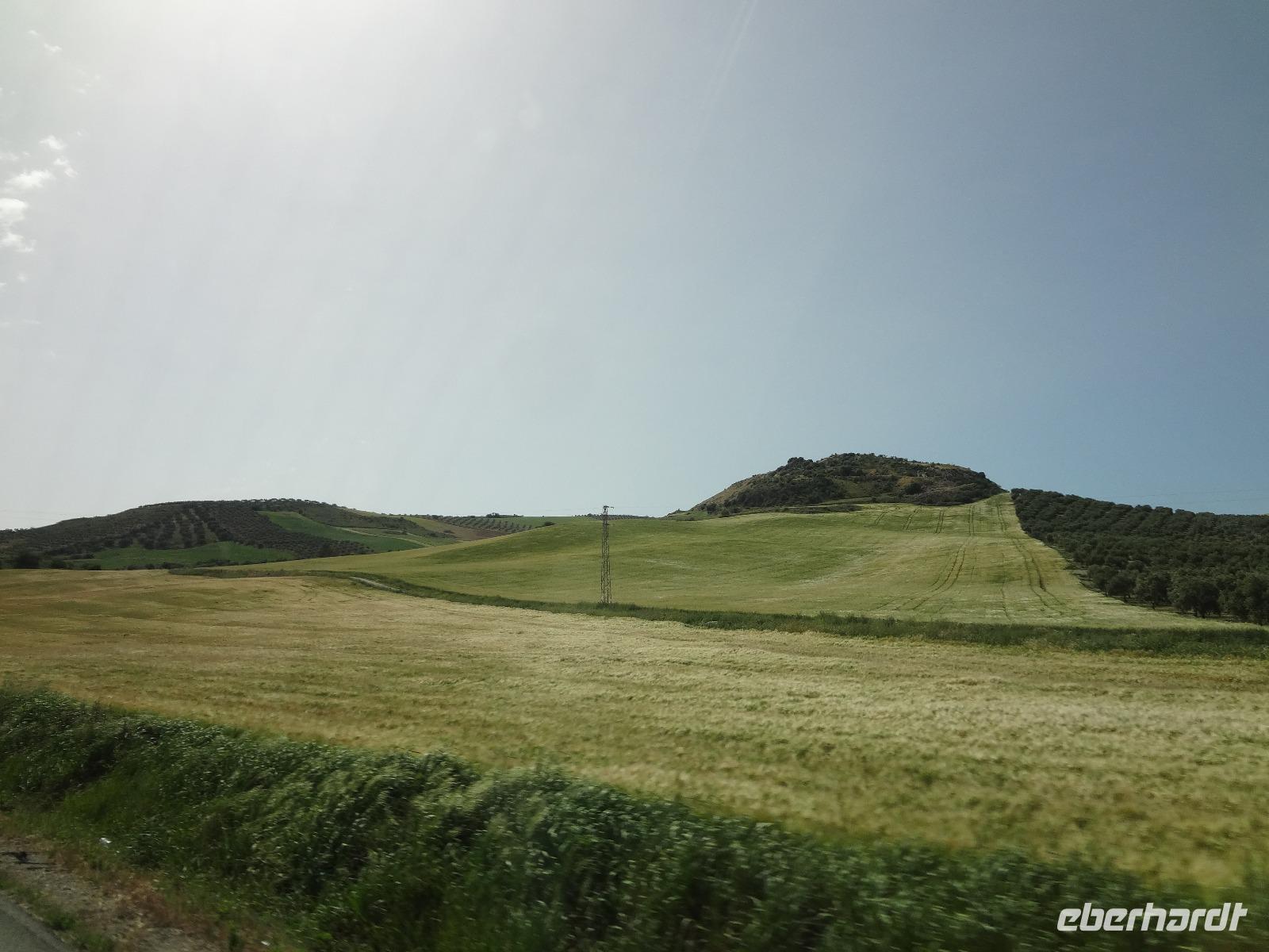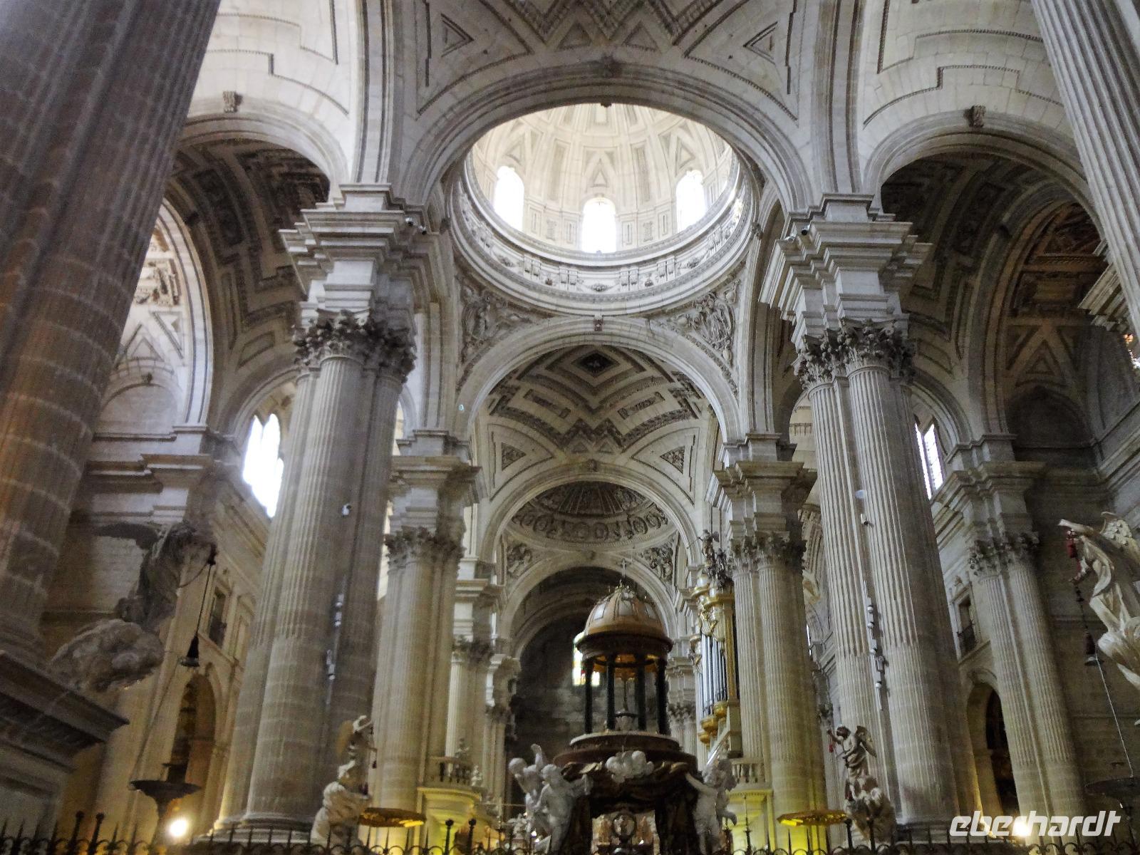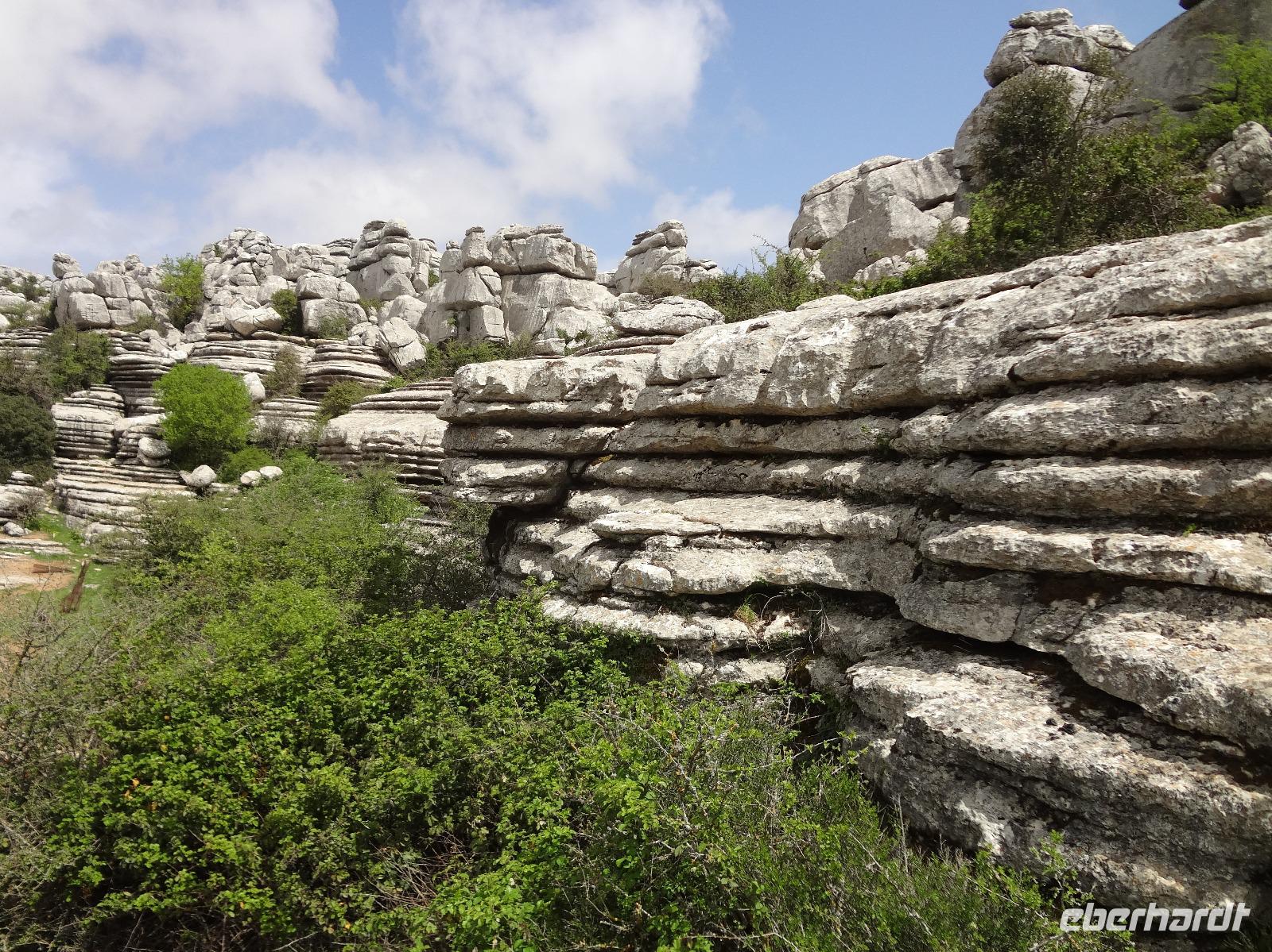 Es windet noch immer stark und die Temperaturen sind auf der kuehlen Seite. Nicht so kalt wie daheim wo es naemlich geschneit hat, anscheinend, aber der Pulli und die Jacke werden heute ausgefuehrt. Vorerst fahren wir 2 Stunden durch wunderschoene Gegend. Eine Huegellandschaft mit vielen Olivenhainen bepflanzt und Orangenplantagen in den Taeler. Danach wird es flacher und Weizen uebernimmt vorranglich das Landschaftsbild bis es nicht von Gemuese Anbauten abgeloest wird. In Antequera angekommen fahren wir vorerst zu einem neuen UNESCO Weltkulturerbe. Es ist noch so neu, dass es noch keinen Eintritt gibt und die Leute auch einfach herumkraxeln koennen wie sie wollen. Es wurden hier huehnische Graeber entdeckt und freigelegt. 2 Graeber schauen wir uns an und sind ganz verbluefft ueber die maechtigen Felsbloecke die vor rund 2 tausend Jahren hier aufgestellt wurden um diese Graeber zu erbauen. Erst im Film, der im Infocenter gespielt wird, lernen wir, wie diese Graeber gebaut wurden. Ueber viele Jahrhunderte dienten diese Graeber als Wohnhaueser und oder Lagerraeume. Nun gehts aber weiter nach Antequera wo wir als erstes das Kloster Santa Maria la Mayor besuchen. Ein herrlicher Aussichtspunkt und interessante Nussbaum getaefelte Decke sowie Ionische Saeulen und eine Prozessions-Maria erwarten uns hier. Der Weg durch das Staedtchen bis zum Bus ist recht steil aber wunderschoen. Heute gibts keine Elektrizitaet in Antequera, deshalb gibt es ein kaltes Mittagessen ehe wir auf den Berg fahren. Der Naturpark El Torcal ist majestaetisch. Die Karstlandschaft mit ihren Tuermen und Pfannkuchen-foermigen Felsformationen laden auf eine Wanderung ein. Ueber Stock und Stein kraxeln wir 1 Stunde im Gebirge und ruhen uns danach im Bus wieder aus. Die Weiterreise heute bringt uns nach Granada wo wir als erstes die barocke Kartaeuse La Cartuja mit Pablo, dem lokalen Reiseleiter, besichtigen. Diese Cartuja laesst uns nur staunen ueber soviel Gold, Glanz und Ueppigkeit ganz im Gegenteil zu dem Credo des Kartaeuser Ordens, welches Schlicht- und Bescheidenheit als oberstes Gebot zitieren. Die Kartaeuse ist praechtig. Jetzt geht es weiter durch das muslemische Viertel von Albacin bis zum Aussichtspunkt San Nicolas. Die perfekte Aussicht auf die Alhambra zeigt sich hier. Junge Leute sitzen, reden, schmusen. Musikanten unterhalten die vielen staunenden Leute. Die Alhambra ist eine riesen-Burg mit eigenem Dorf und vielen Gaerten auf einem Huegel mit Sicht auf Granada. Es ist eines der erstaunlichsten Bauwerke der Erde und wir besuchen es Morgen in aller Ruhe. Heute fahren wir nur noch zum Hotel ins Zentrum Granadas, essen von dem guten Buffet im Hotel und fallen muede ins Bett.