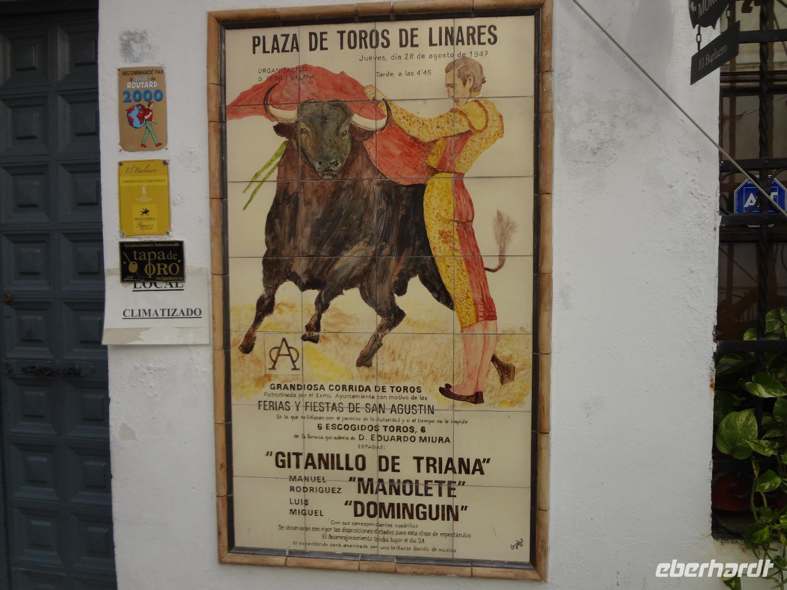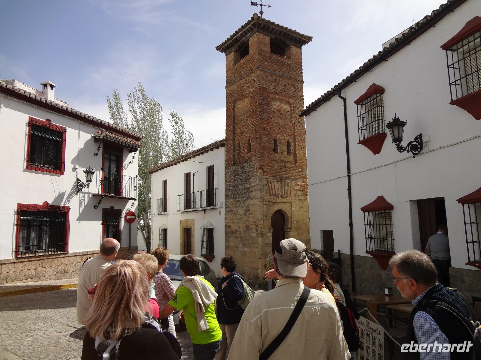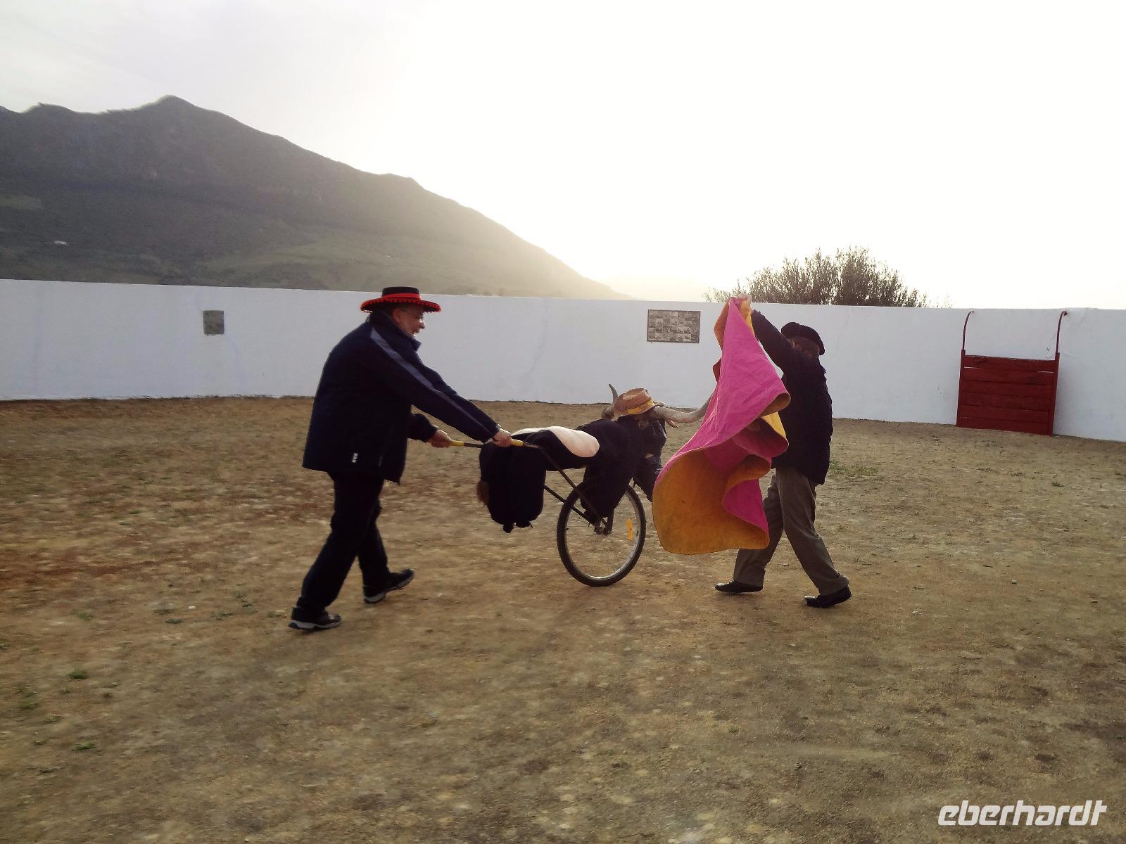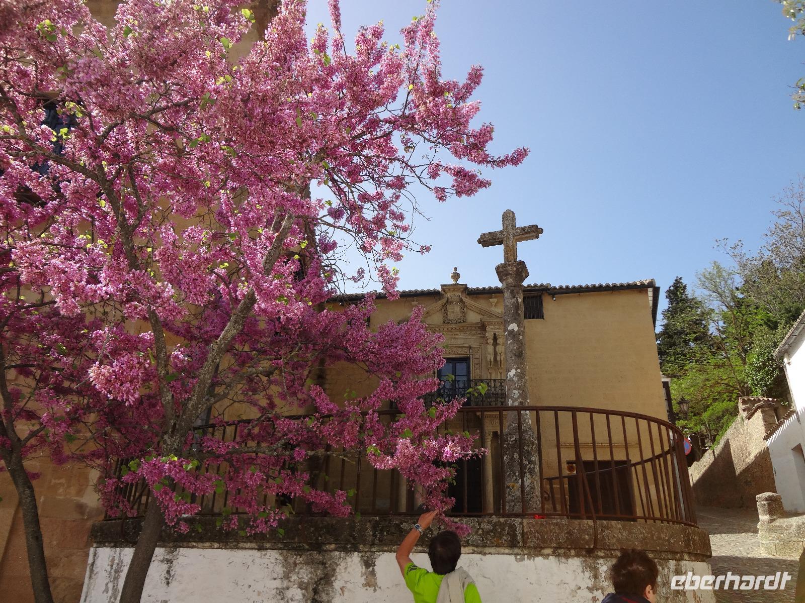 7:15 bloss eine Person hat sich zur Yogastunde eingefunden ! Ummmm. Nach dem ueppigen Fruehstueck fahren wir gleich mit Juan und seiner Julia (so heisst das Busunternehmen !) in die wunderschoene, gefestigte Stadt Ronda. Sie ist auf einem Plateau gebaut welches von einer Schlucht getrennt und ueber zwei Bruecken wiedervereint ist. Vorerst gehen wir durch schmale Gassen hinunter in die Schlucht zur alten roemischen Bruecke. Die Sicht auf die, nun von oben herabwinkende, Stadt mit ihren Palaesten und weissen Haeusern ist beeindruckend. Das Wasser wurde damals wohl von christlichen Gefangenen durch steile Felspassagen in die Herrenhaeuser der Araber, die hier 700 Jahre lang siedelten, hinaufgetragen. Ohh, Aufregung, jemand hat alle seine wichtigen Dokumente verloren, sind die vielleicht in Malaga geblieben ? Die Telefone laufen heiss, hoffentlich, hoffentlich. Als Gruppe gelangen wir nun bei den roemischen Baeder an, die wir auch besichtigen. So ein Hamam ist was tolles, es reinigt nicht nur den Koerper sondern auch die Seele. Die Erlaeuterungen unserer Reiseleitung Cristina sind so genau, dass wir nun alle so einen Hamam mit Caldarium, Tepidarium und Frigidarium zu Hause bauen koennen. Unsere Familie daheim freut sich sicher schon auf unsere Rueckkehr ! Auf der anderen Seite der Schlucht spazieren wir nun wieder steil hinauf bis ins historische Zentrum der Stadt. Ronda war die letzte arabische Bastion in Spanien. Durch einen Verrat im Jahre 1485 wurde sie den Christen uebergeben. Da, wo die groesste Moschee stand thront heute die Basilika und der Palast der Mondragon Familie. Mit seinen vielen Innenhoefen ist der Palast heute ein Museum und Kulturerbe. Es bluehen auch gerade die Judasbaeume, die ja auch Liebesbaeume heissen da ihr Blatt herzfoermig ist. Die rosa farbigen Blueten schimmern zart gegen den blauen Himmel und die weiss getuenchten Haeuser. Wir spazieren weiter bis zur neuen Bruecke die auch wunderschoen ist mit ihrem schmiedeisernen Gelaender. Noch ein paar Telefonate wegen des Passes. Die Stierkampfarena in Ronda soll die aelteste Arena in Spanien sein. Wir sprechen darueber und einige unter uns wollen in der Freizeit hineinschauen. Der Wind nimmt immer mehr zu und es blaest uns schon ins Restaurant wo wir zu Mittag geladen sind. Nach dem Essen und der Freizeit fahren wir weiter zur Weinverkostung. Nun ist es endgueltig, die verlorenen Dokumente sind nicht im Hotel in Malaga liegen geblieben. Plaene werden geschmieden aber vorerst muessen alle Taschen und Koffer gruentlich untersucht werden. Spanischer Wein wurde immer schon besungen und gerne getrunken, wir erleben ihn. 4 verschiedene Weinsorten werden uns heute zur Verkostung gereicht, dazu Tapas und wir werden immer lustiger dabei. Unser Abendessen ist jedoch eine kalte Geschichte, da wir zu einem Grillabend in der kleinen Stierkampfarena beim Hotel geladen sind. Alle ziehen wir die Windjacken an und siehe da..... an dem riesen Schmunzeln auf dem Gesicht eines Mitreisenden ahnen wir schon was geschehen ist. Unser Reisemitglied wurde im Zimmer fuendig und ist mit seinem Pass und Kreditkarten wiedervereint. Die Dinger haben sich allesamt im Koffer in einen Schlitz verkrochen... Angezogen wie im Winter sitzen wir in Suedspanien in einer Arena und amuesieren uns koestlich. Das Gramophon plaert OLE-Songs, der Wind weht uns die Servietten ums Gesicht, der Drahtesel-stier mit dem wir herumrennen faellt auseinander, der deutsche Torrero aus unserer Gruppe huellt sich in seinen roten Mantel, das Essen schmeckt sehr fein und der Wein noch besser. Gude Nocht.