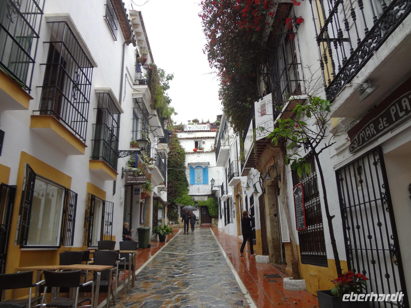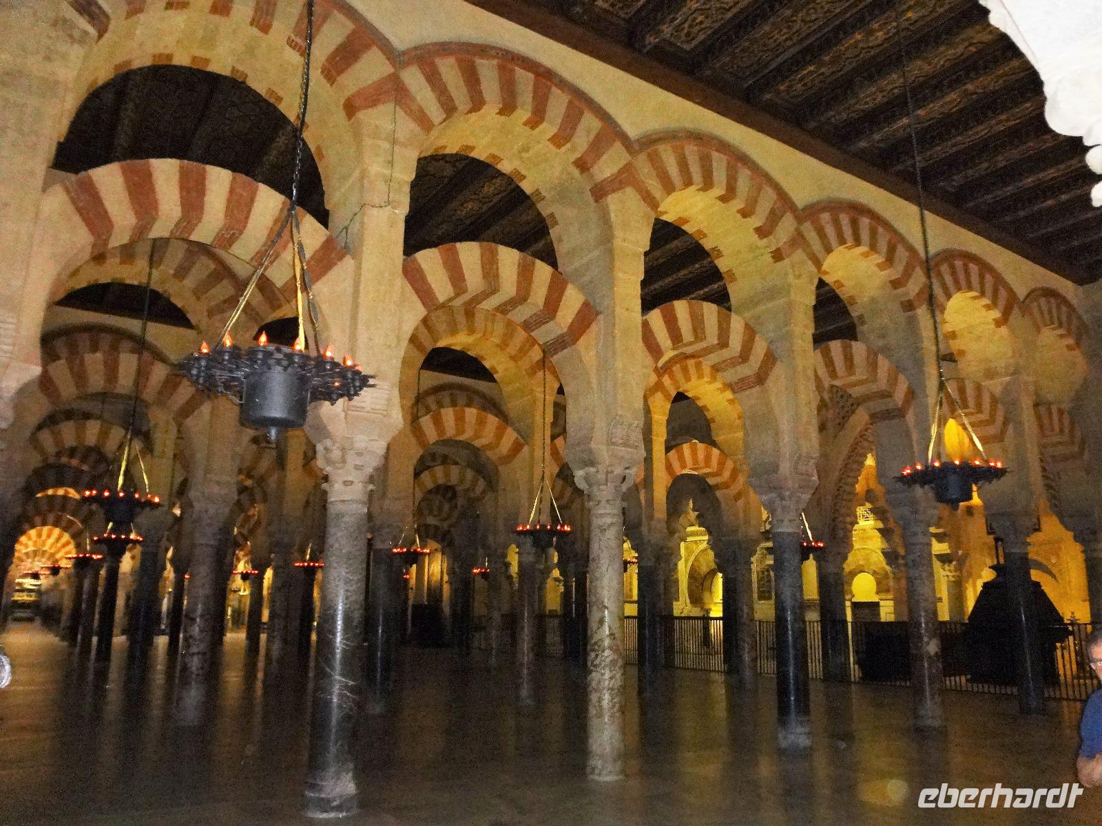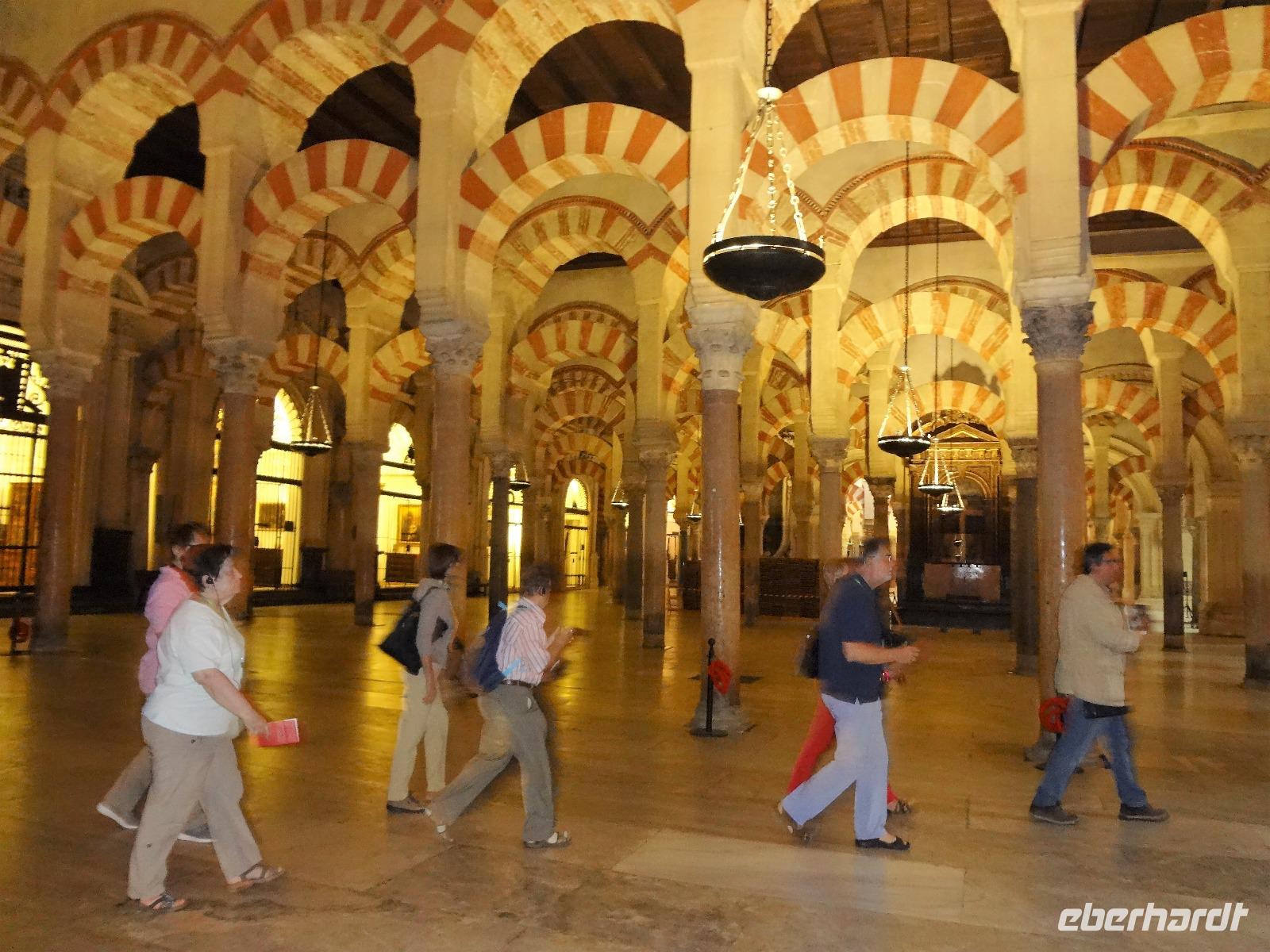 Der Reiseleiter Miguel, der einen Olivenhain mit ueber 100 Olivenbeaumen besitzt, erwartet uns an diesem Sonntag bereits um 8:30 Uhr. Wir moechten gerne die erste Gruppe in der weltberuehmten Moschee-Kathedrale, La Meztiqua sein. Diesen eindruecklichen Ort ganz fuer sich zu erleben ist etwas ganz besonderes. Die 856 Saeulen mit ihren Doppelboegen lassen uns dastehen wie Beduinen die das erste mal eine Oase sehen. Unfassbar, diese Stille, diese Weite, diese schlichte Pracht. Die Moschee wurde bereits im 8. Jh gebaut und im 10. fertiggestellt. Sie wurde bald zu klein und die Kalifen zu maechtig. Mit ihnen wuchs auch die Moschee ueber die Jahrhunderte. Der Stil hatte sich jedoch nie veraendert, deshalb diese Ausgewogenheit. Im 1236 fing die christliche Periode in Cordoba an und eine stattliche Kathedrale musste her. Wohin ? Gleich in die Mitte der Moschee ! Dies bewirkte grosse Aufstaende aber die Kirche siegte und heute sehen wir eine gloriose Kathedrale inmitten einer Moschee. Ueber 200 Saeulen mussten weichen, die Decke wurde aufgerissen und das Gotteshaus wurde eingebaut. Wunderschoen und doch eigenartig thront sie im Glanz des Katholizismus inmitten der schmucklosen aber eindruecklichen Moschee. Miguel zeigt uns die besten Plaetzchen um die besten Fotos zu knipsen, viele sind nun in der Bildergalerie von Eberhardt ? Wir verlassen diese wundersame Pracht, denn viele andere Besucher stuermen nun hinein und jagen mit ihren Kameras durch den Saeulenwald. Wir wollen noch die schmalen schoen verzierten Gassen des Judaria Viertels von Cordoba besichtigen. Die schoenste Fassade und der schoenste Patio werden von der Stadt praemiert, das reizt natuerlich die Einheimischen und wir profitieren in vollen Zuegen davon. Die Blumengasse, die Skulpturen, die kleinen Plaetze und die vielen Restaurants und Tapas Bars lassen uns kaum mehr zurueck ins Hotel gehen. Wir besichtigen auch noch eine kleine Synagoge ehe wir uns von Miguel verabschieden. Um 12 Uhr gibt es eine Messe in der Kathedrale, da wollen die meisten hin, auch um die Orgel zu hoeren. Anstatt Orgelmusik ertoent Musik einer Ziguenergruppe die zu Ehren der erst gerade heilig gesprochenen Emilia aufspielen. Emilia war eine Ziguenerin und eine Martyrin. Die Messe war dadurch sehr spanisch was uns sehr gefallen hat. Ja, nun ist Freizeit oder Stadtbummel mit Mitagessen angesagt. Alle haben einen Stadtplan und wollen so schnell wie moeglich eines der leckeren Tapas Bars aufsuchen und in den Souvenier Laeden noch nach was passendes fuer die Nachbarin einkaufen. Ach... die Katze, der Hund, die Blumen, die Post.... ohne Hilfe ginge es doch nicht. Danke, danke. Spaeter treffen wir uns wieder im Hotel, sodass wir gemeinsam zum Abendessen gehen koennen. Mhhh, wir sind wieder in einem tollen Lokal, gar nicht weit von unserem Hotel entfernt. Der Ochsenschwanz ist wirklich koestlich. Noch einen Absacker, noch einen Nachtspaziergang durch diese geschicht-geladene Stadt. Noch ein paar Bilder, noch mehr bleibende Eindruecke. Cordoba, wir werden dich nie mehr vergessen.